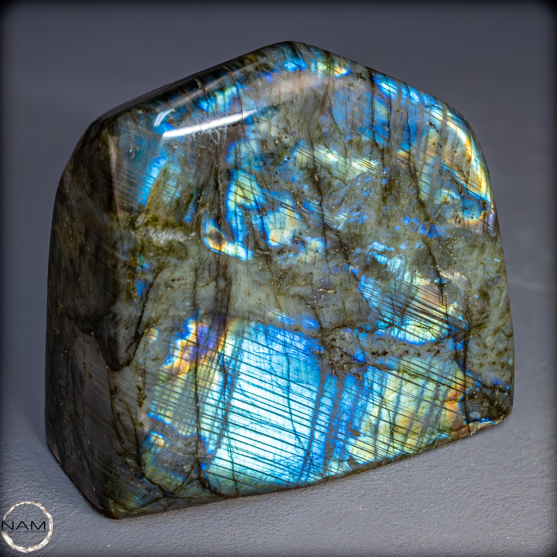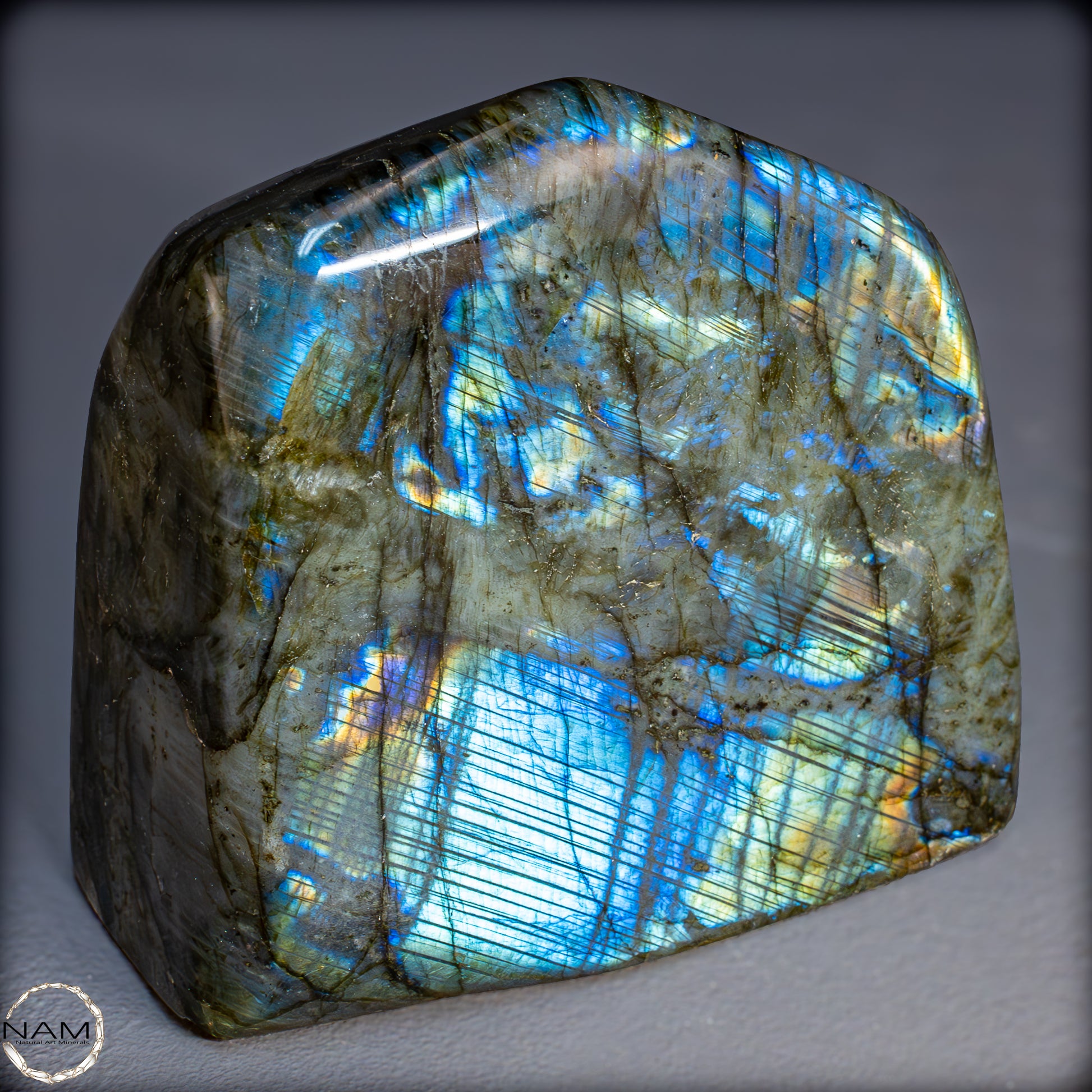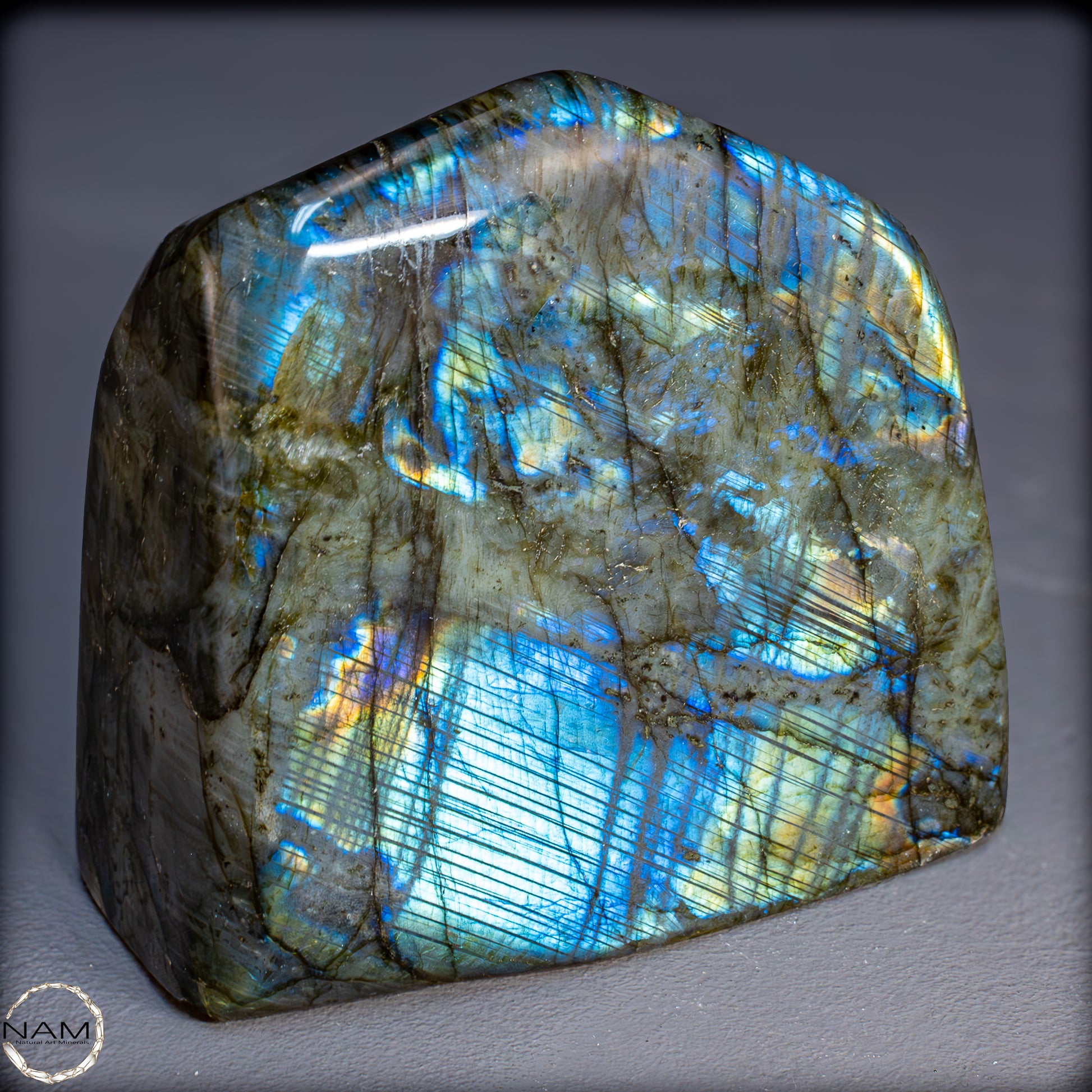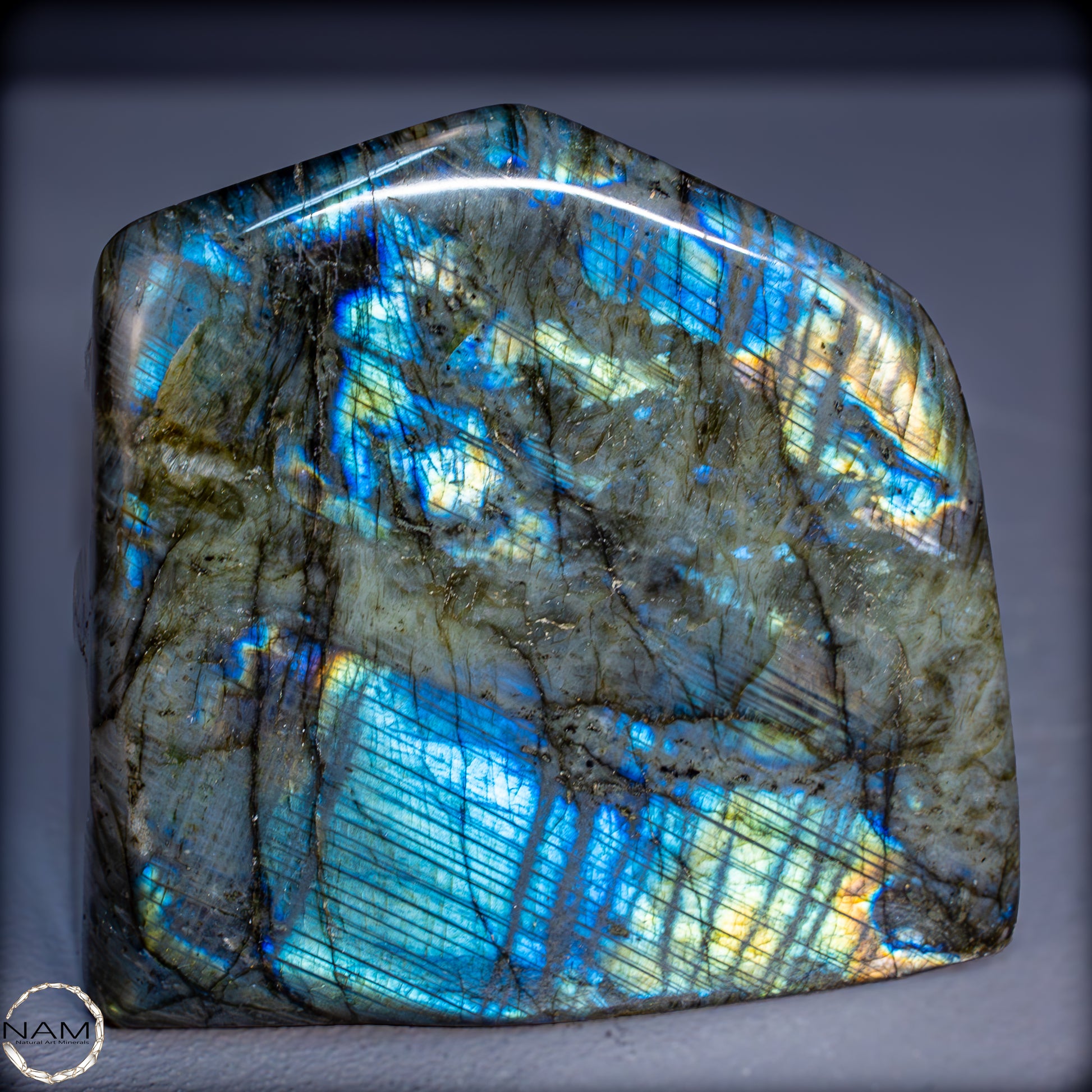 Die Form selbst ist organisch und ausgewogen, ideal als Blickfang in einer Sammlung oder als energetisches Objekt in einem besonderen Raum. Labradorit gilt als Stein der Intuition und Transformation – diese Freiform bringt seine mystische Ausstrahlung in besonders eindrucksvoller Weise zur Geltung.