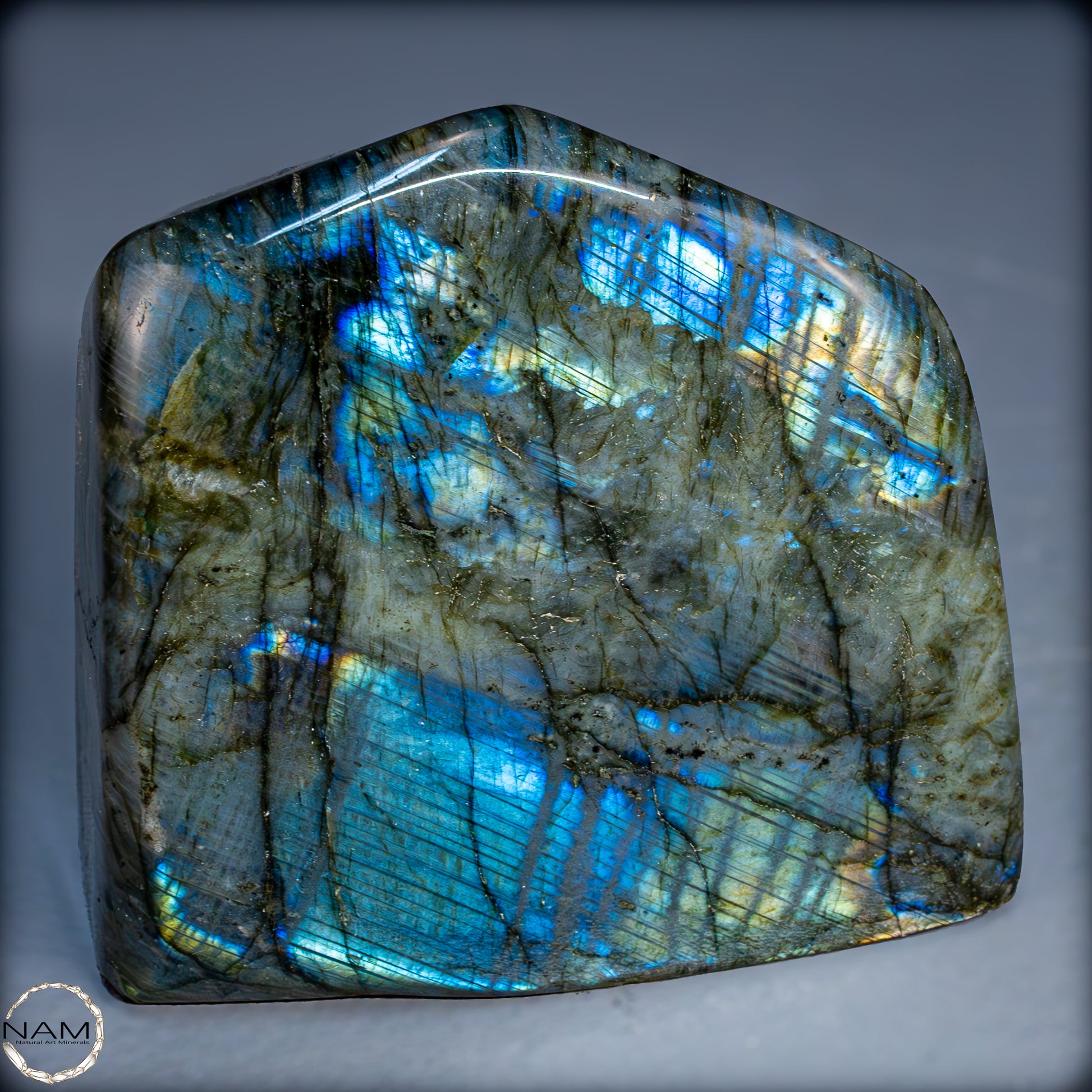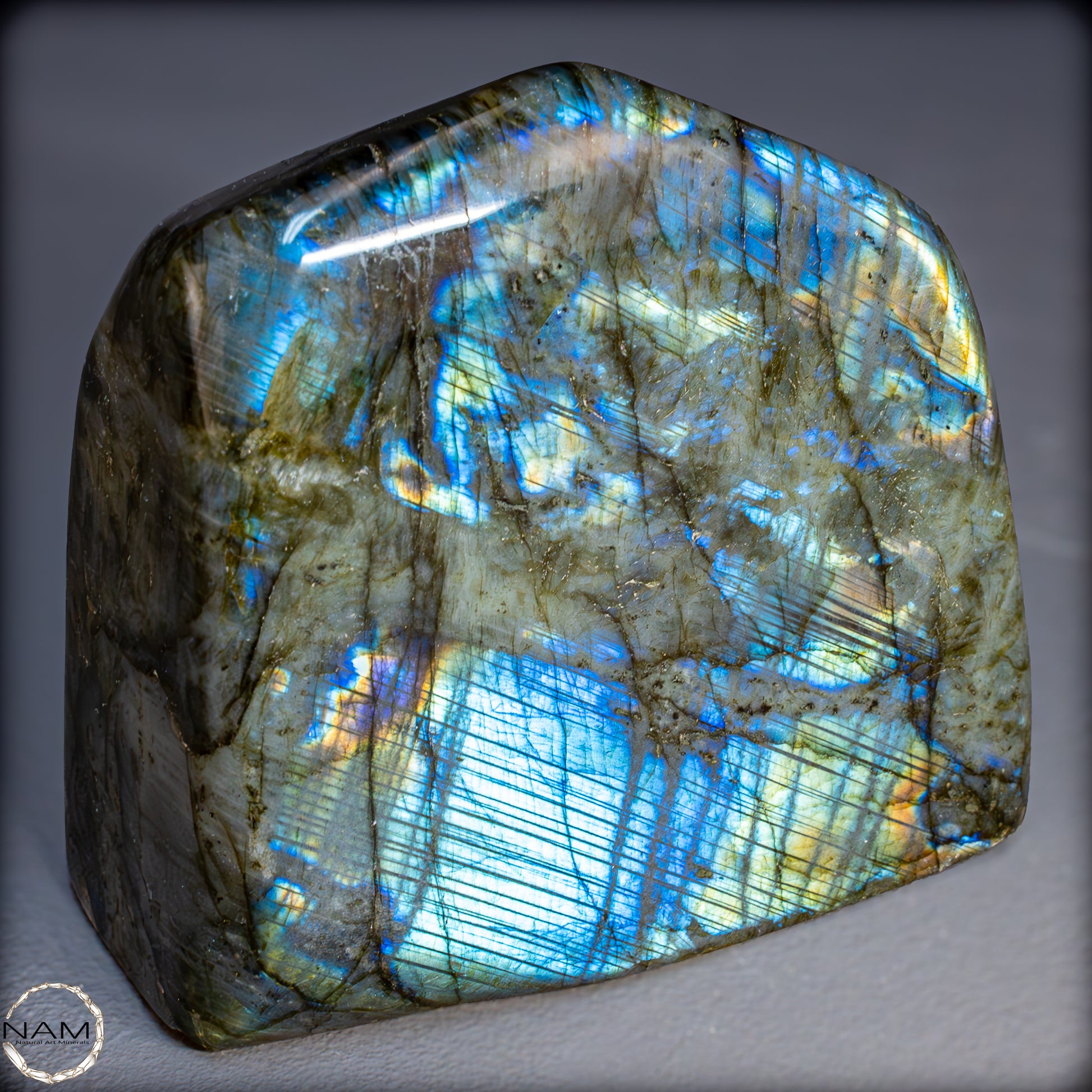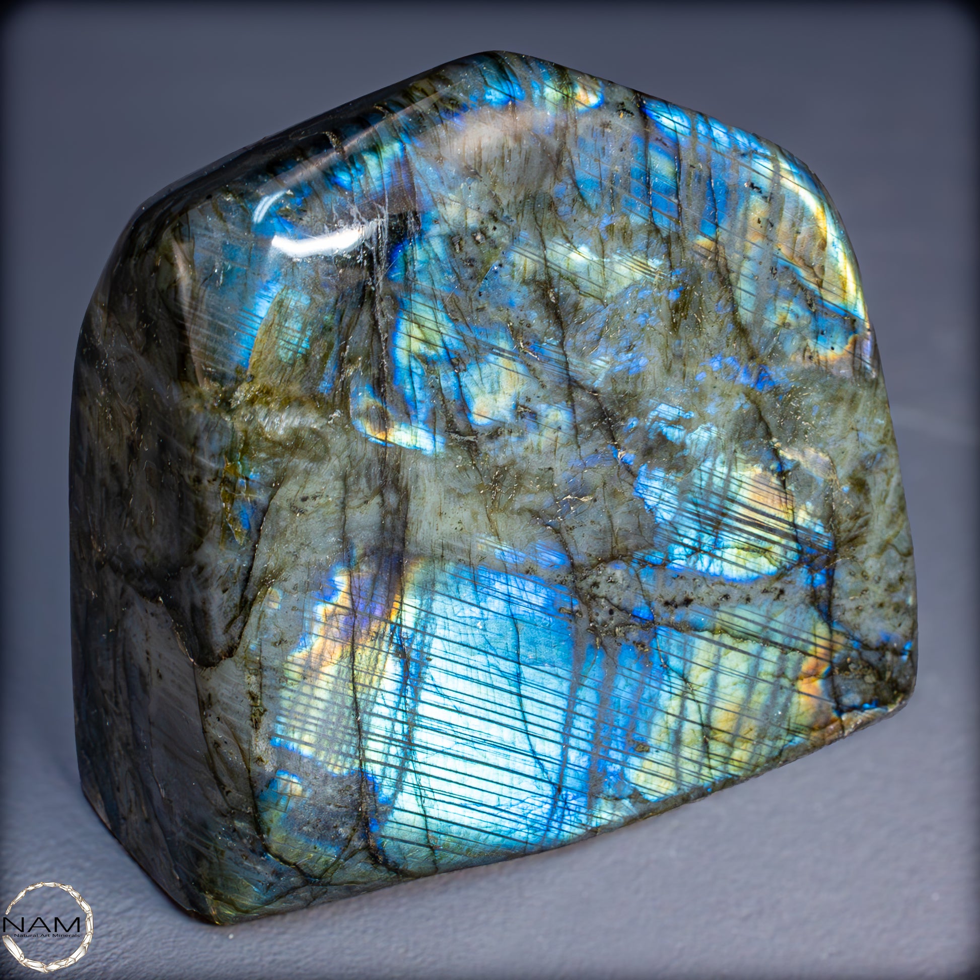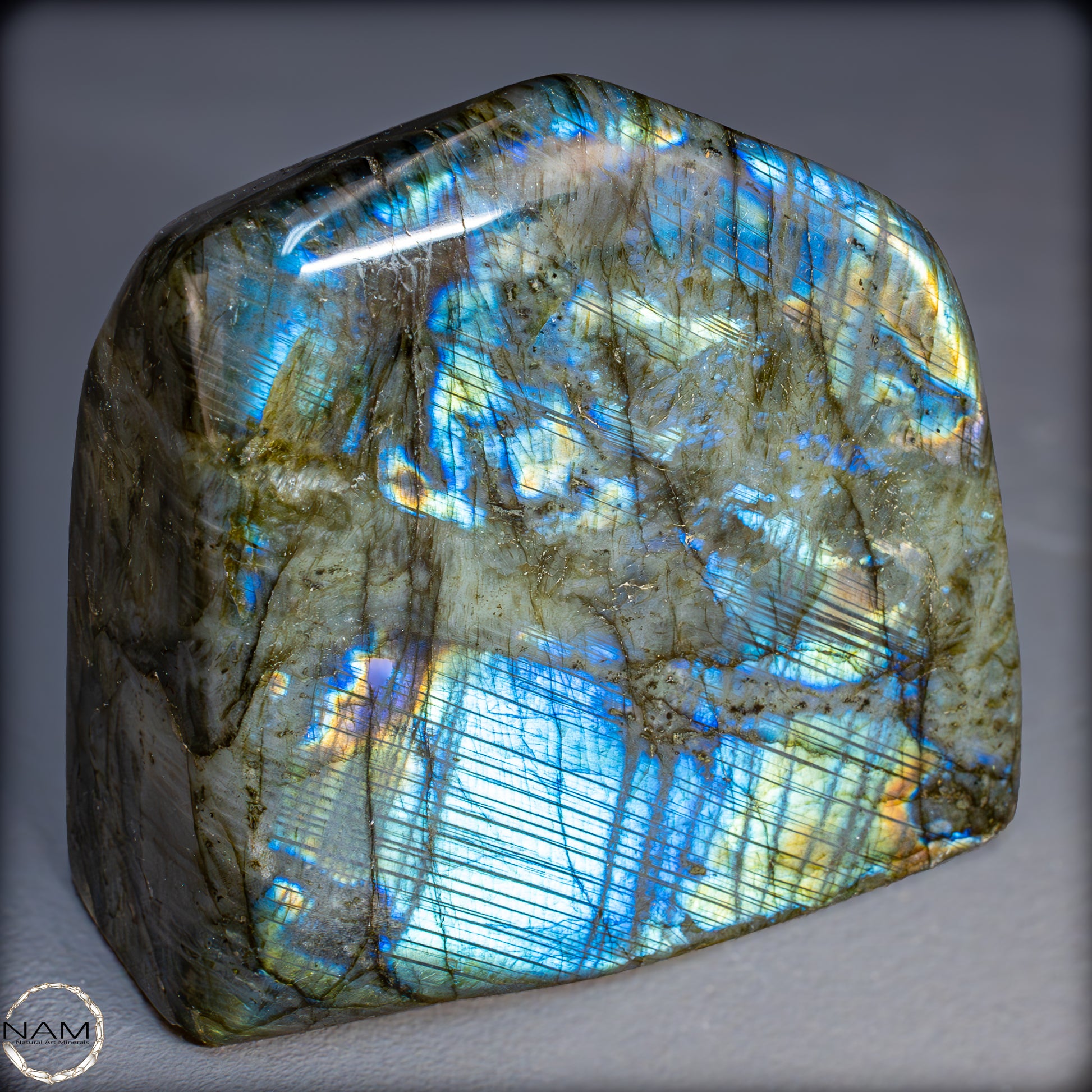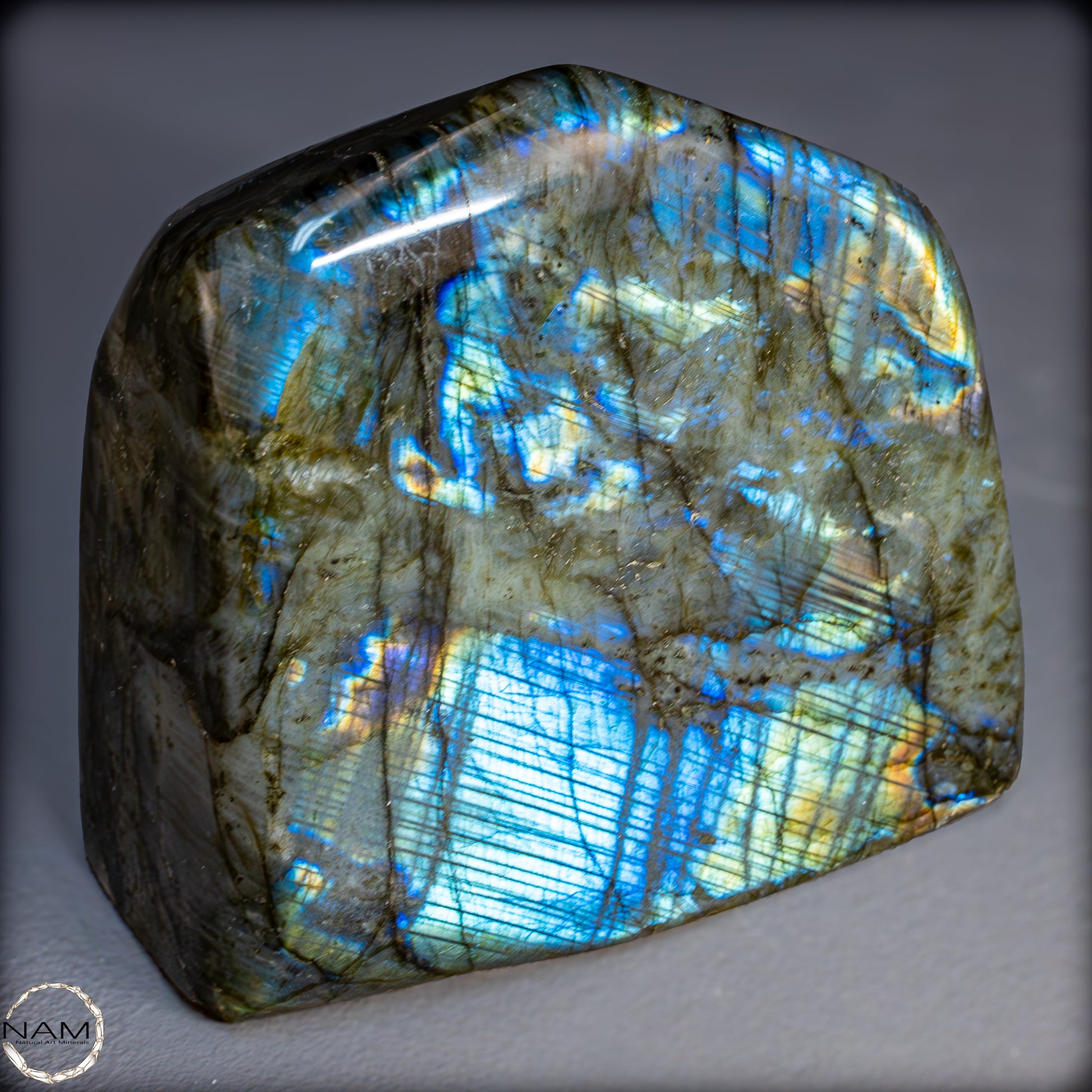 Die Form selbst ist organisch und ausgewogen, ideal als Blickfang in einer Sammlung oder als energetisches Objekt in einem besonderen Raum. Labradorit gilt als Stein der Intuition und Transformation – diese Freiform bringt seine mystische Ausstrahlung in besonders eindrucksvoller Weise zur Geltung.
