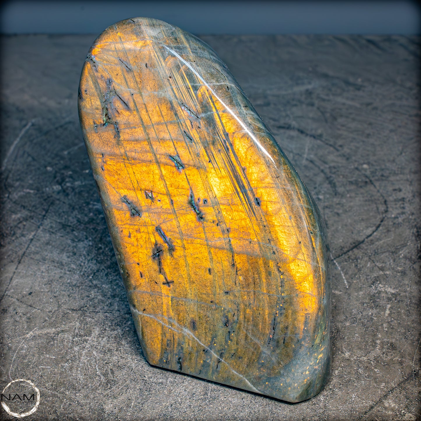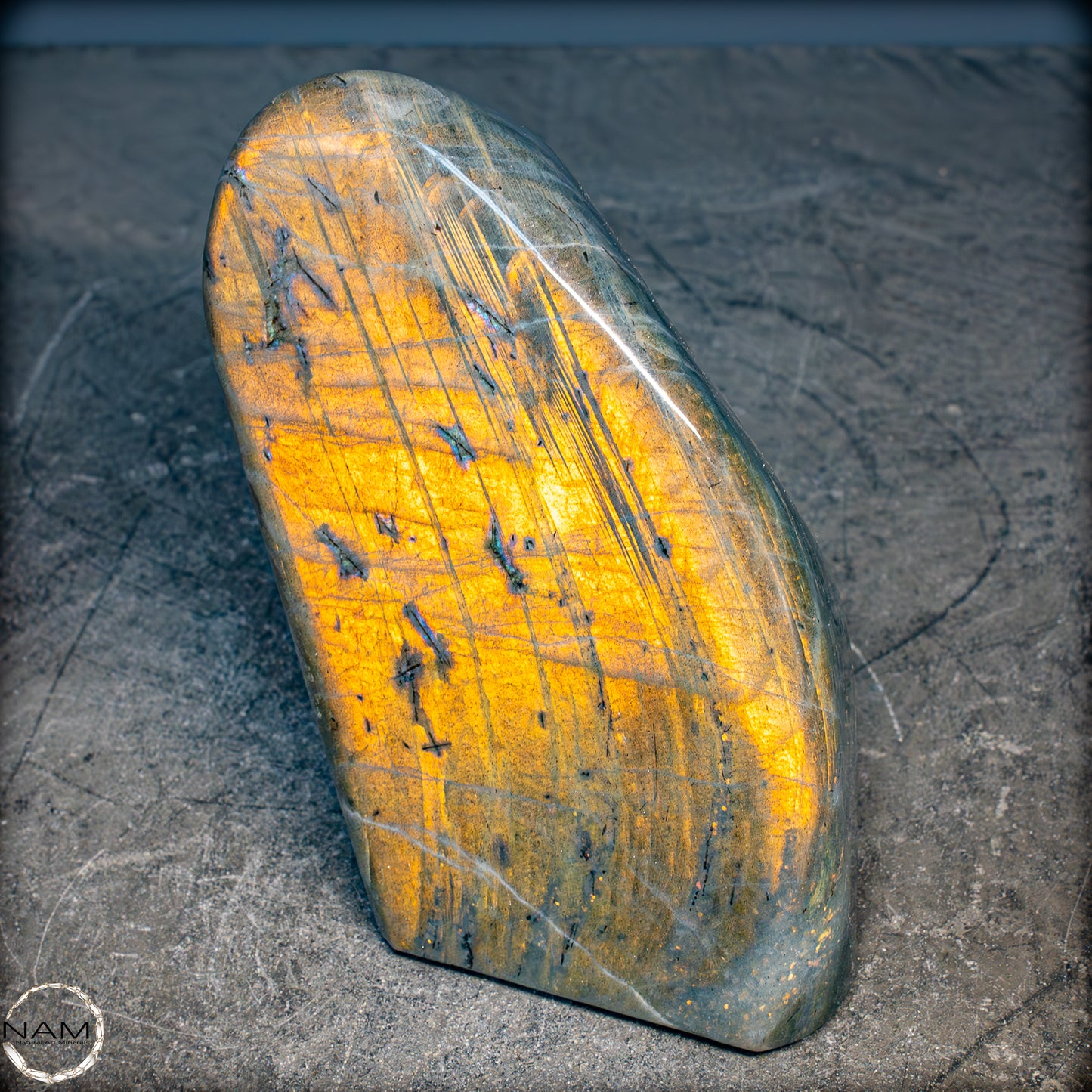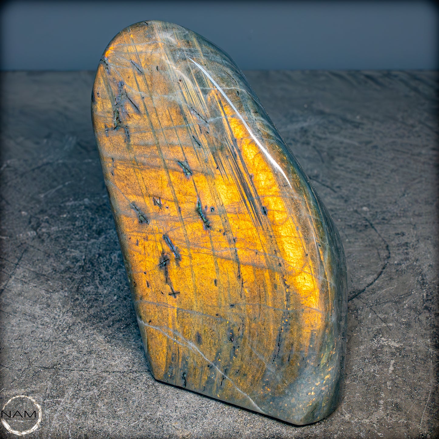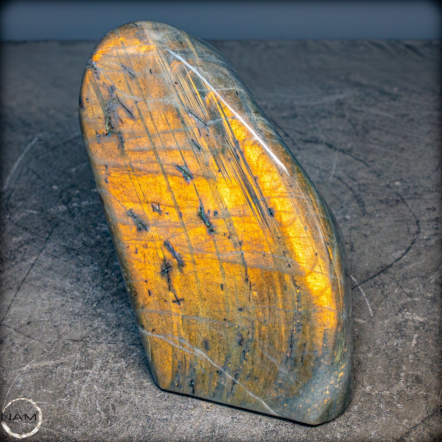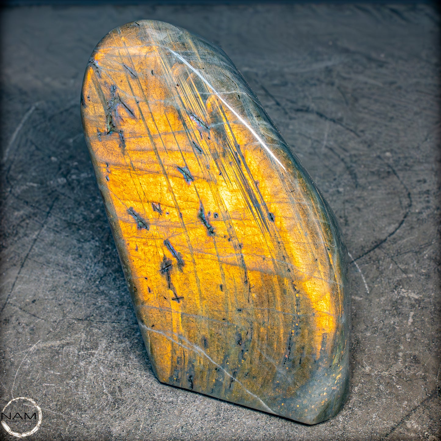 Das magische Farbenspiel des Labradorits wird auch Labradorisieren genannt. Das natürliche Licht bricht an den Kristallen auf der Oberfläche des Edelsteins. Die in ihm enthaltenen Mineralien reflektieren blau,gelb, gold, orange und grün. Einer Inuit-Legende zufolge schlug ein Krieger mit seinem Schwert auf ein großes Stück Labradorit ein. Die vielen Farben stiegen in den Himmel hinauf. So wurden die Nordlichter geboren.