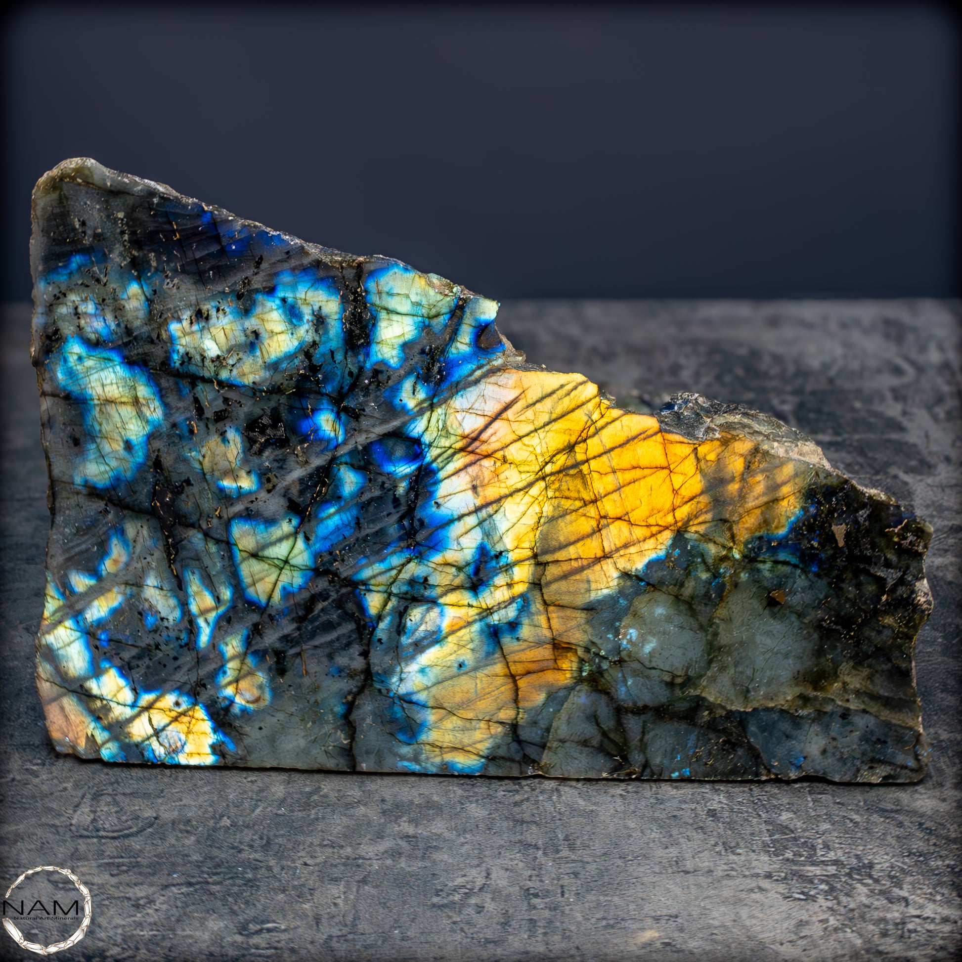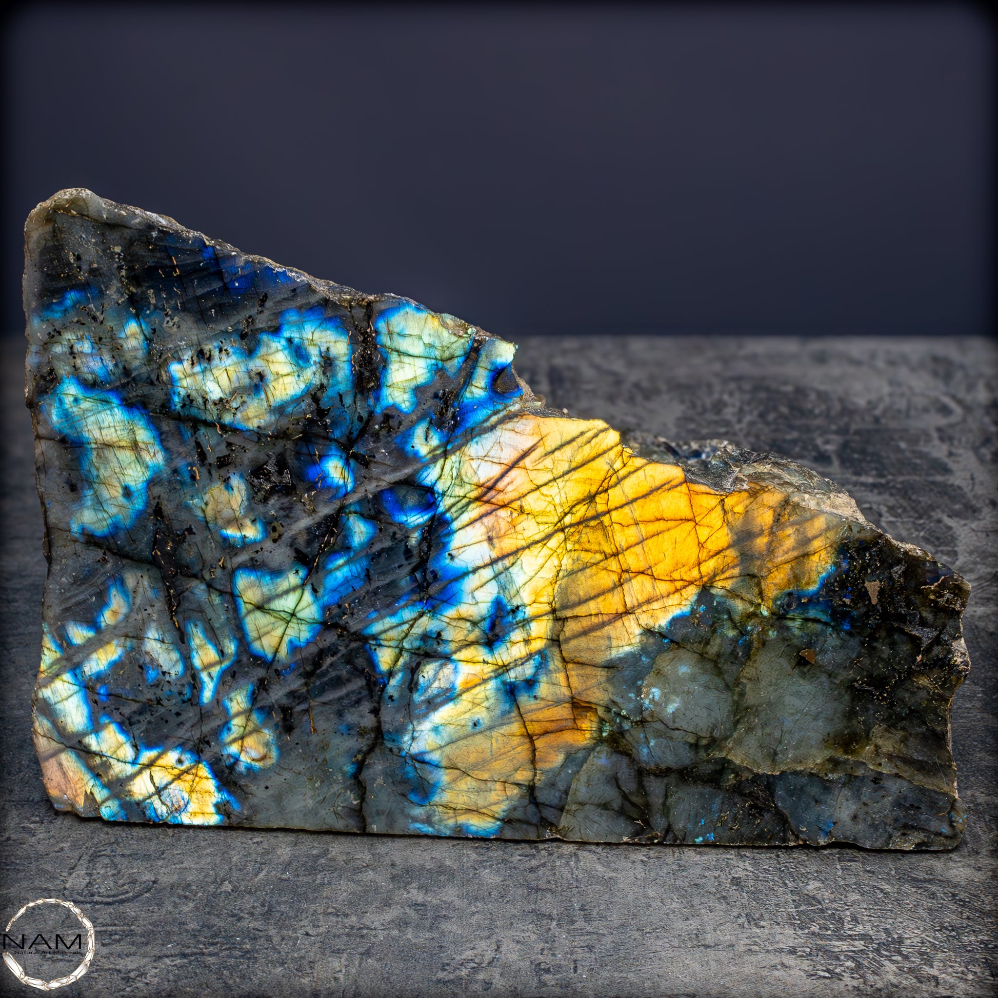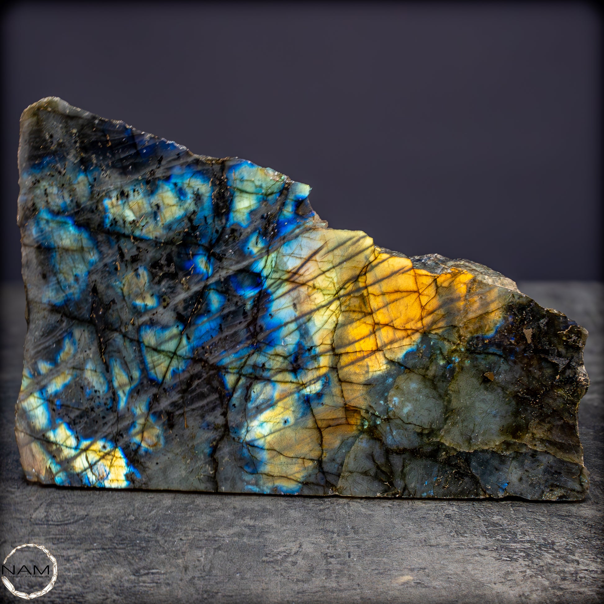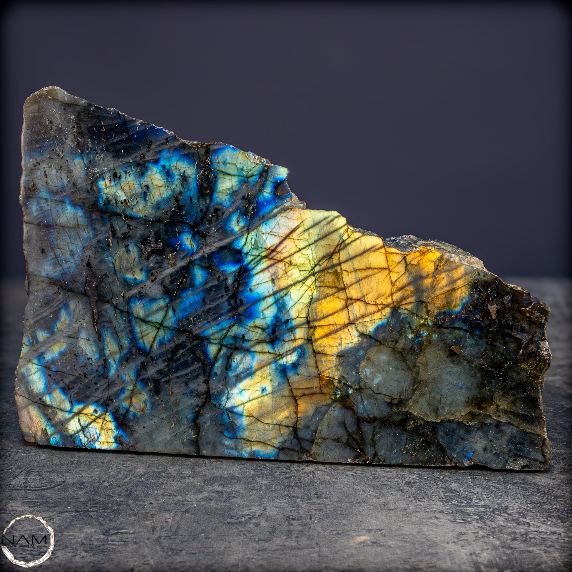 Diese außergewöhnliche Labradorit-Freiform fasziniert durch ein intensives Farbspiel, das bei Lichteinfall in spektakulären Nuancen von Gold, Blau, Violett und Türkis aufleuchtet. Die lebendige Irisierung durchzieht die gesamte polierte Fläche in diagonalen, schimmernden Linien, die der dunkleren Grundmatrix eine geheimnisvolle Tiefe verleihen. Die metallisch wirkenden Farbblitze wechseln je nach Blickwinkel und erzeugen ein fast magisches Leuchten, das an Polarlichter erinnert.