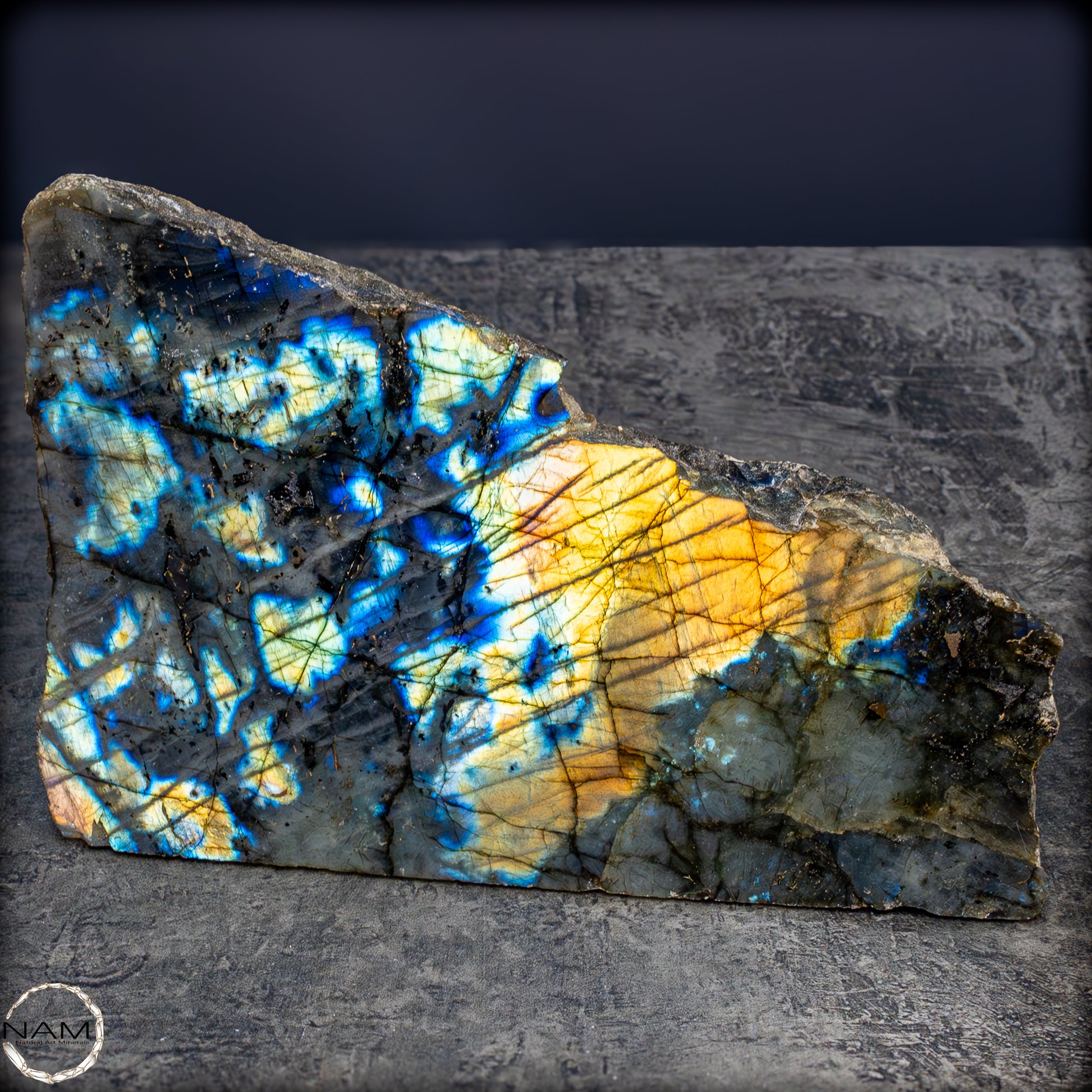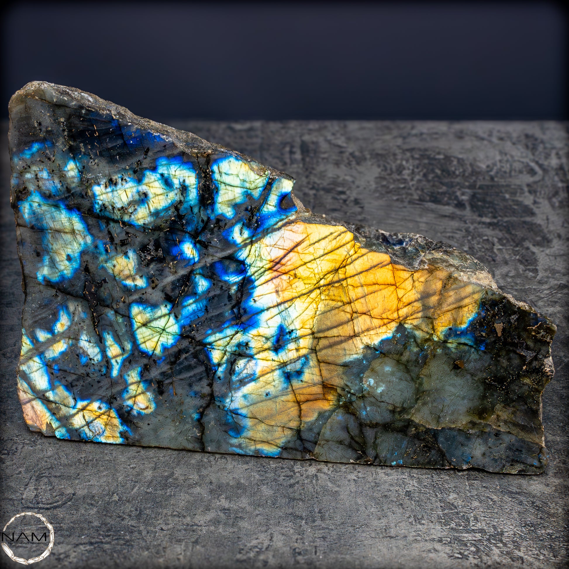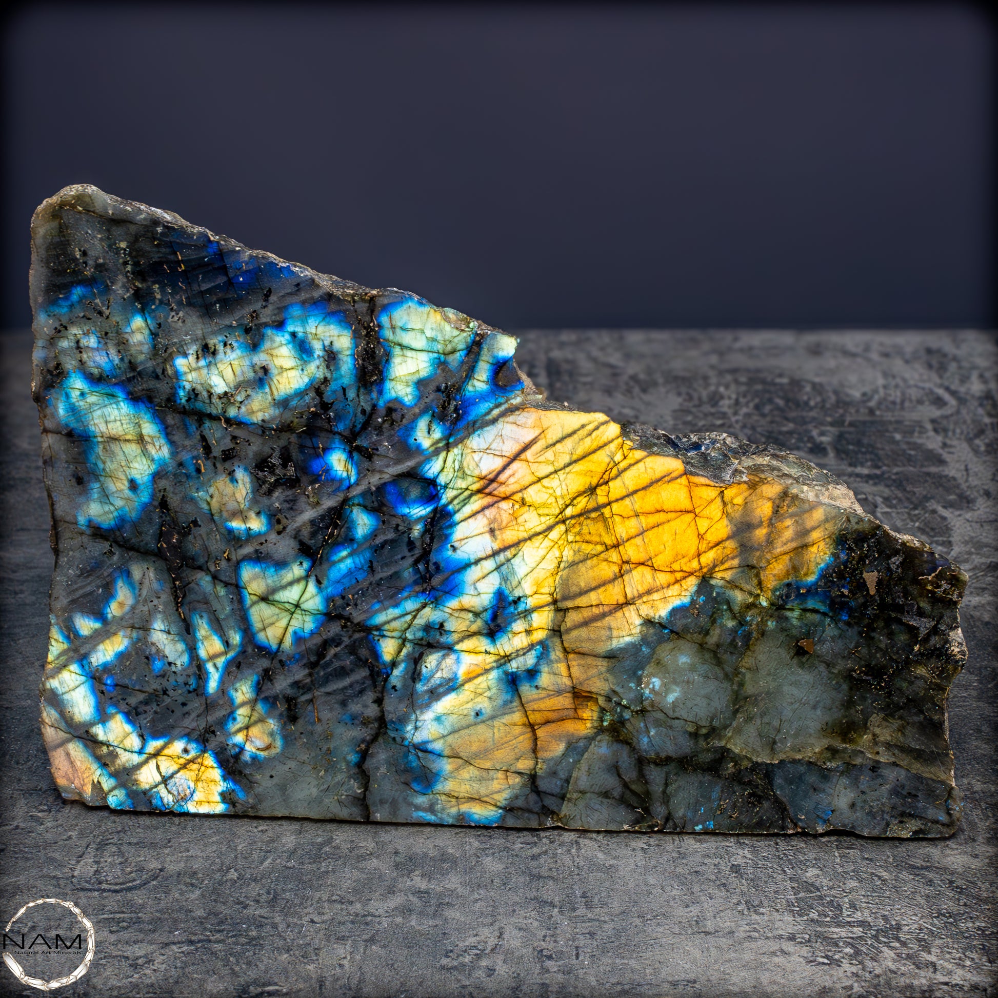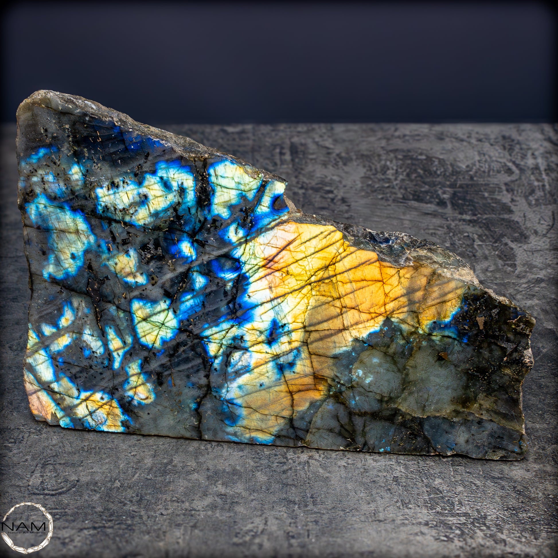 Diese außergewöhnliche Labradorit-Freiform fasziniert durch ein intensives Farbspiel, das bei Lichteinfall in spektakulären Nuancen von Gold, Blau, Violett und Türkis aufleuchtet. Die lebendige Irisierung durchzieht die gesamte polierte Fläche in diagonalen, schimmernden Linien, die der dunkleren Grundmatrix eine geheimnisvolle Tiefe verleihen. Die metallisch wirkenden Farbblitze wechseln je nach Blickwinkel und erzeugen ein fast magisches Leuchten, das an Polarlichter erinnert.