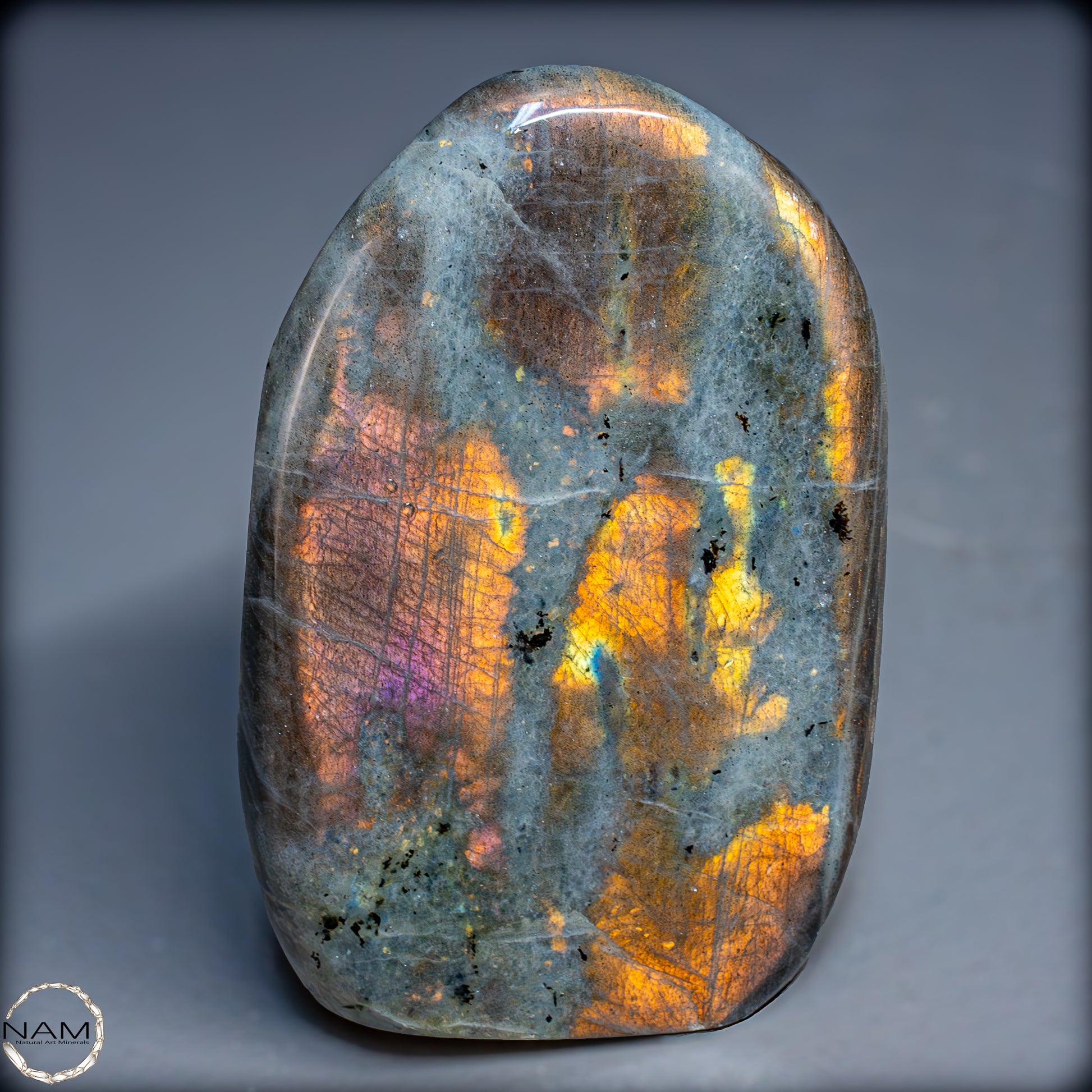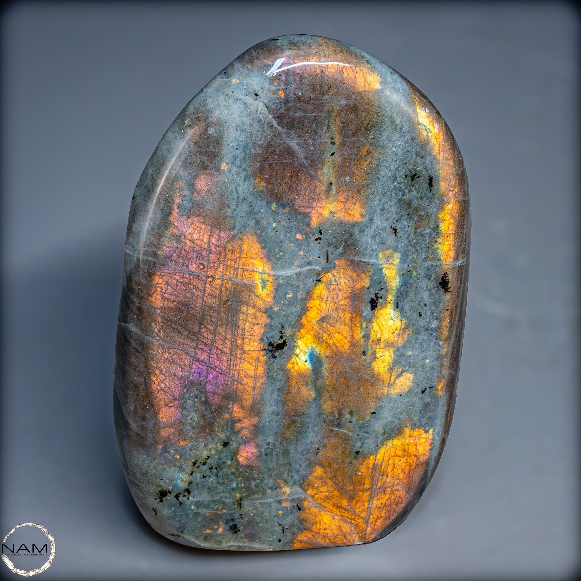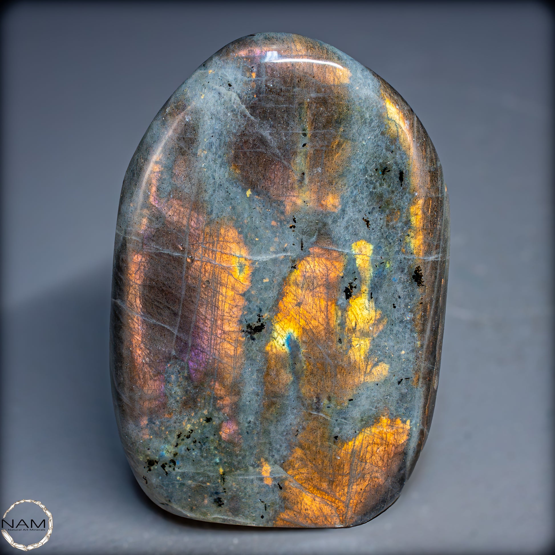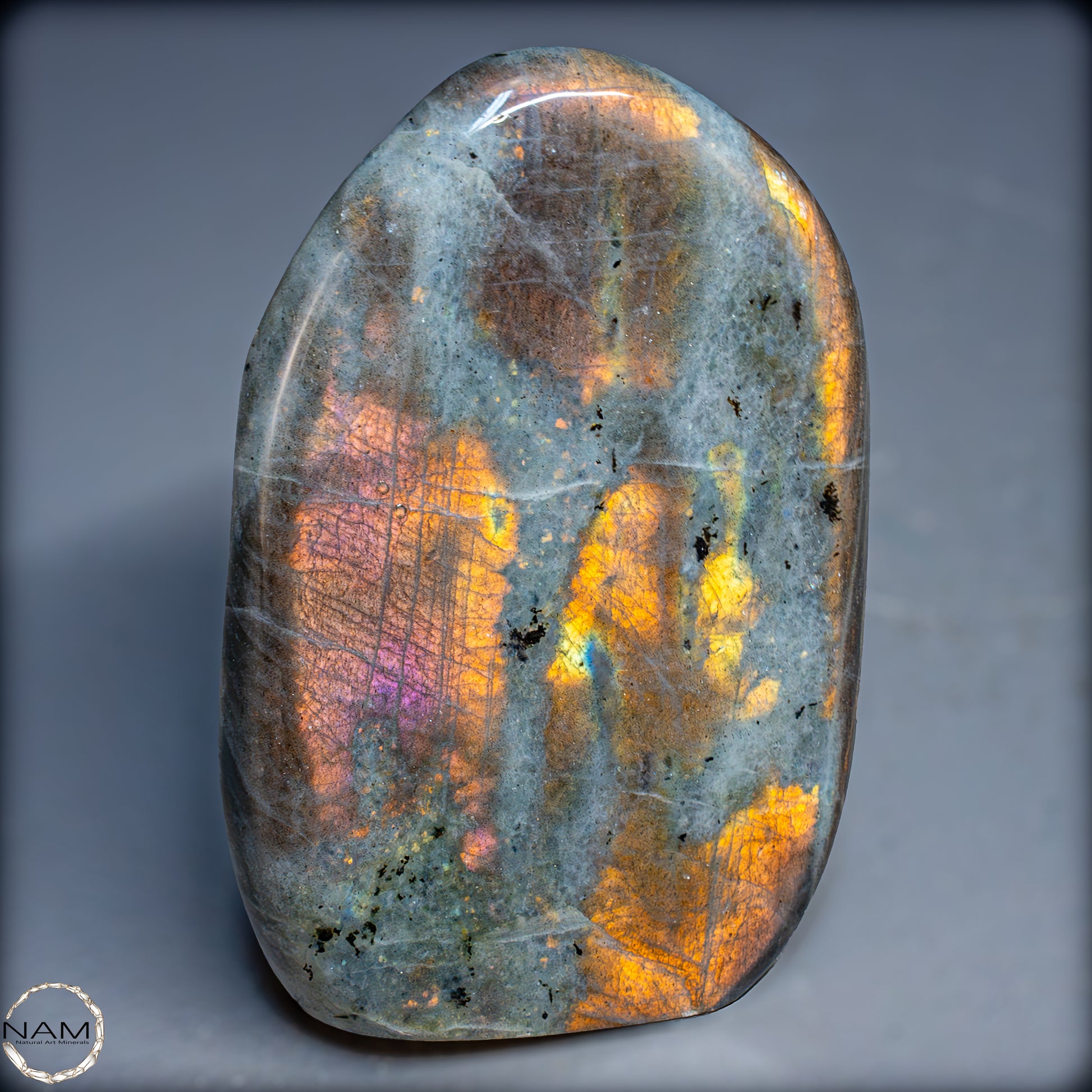 Das magische Farbenspiel des Labradorits wird auch Labradorisieren genannt. Das natürliche Licht bricht an den Kristallen auf der Oberfläche des Edelsteins. Die in ihm enthaltenen Mineralien reflektieren blau,gelb, gold, orange und grün. Einer Inuit-Legende zufolge schlug ein Krieger mit seinem Schwert auf ein großes Stück Labradorit ein. Die vielen Farben stiegen in den Himmel hinauf. So wurden die Nordlichter geboren.