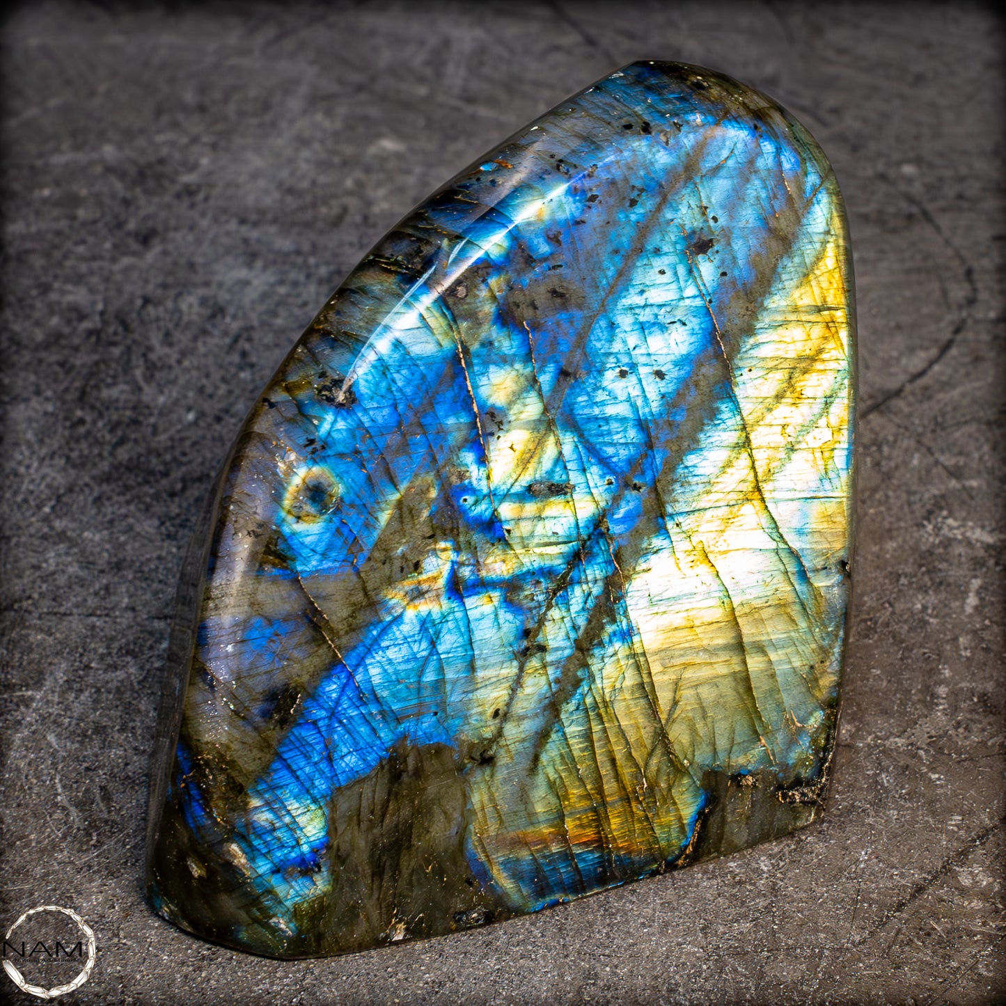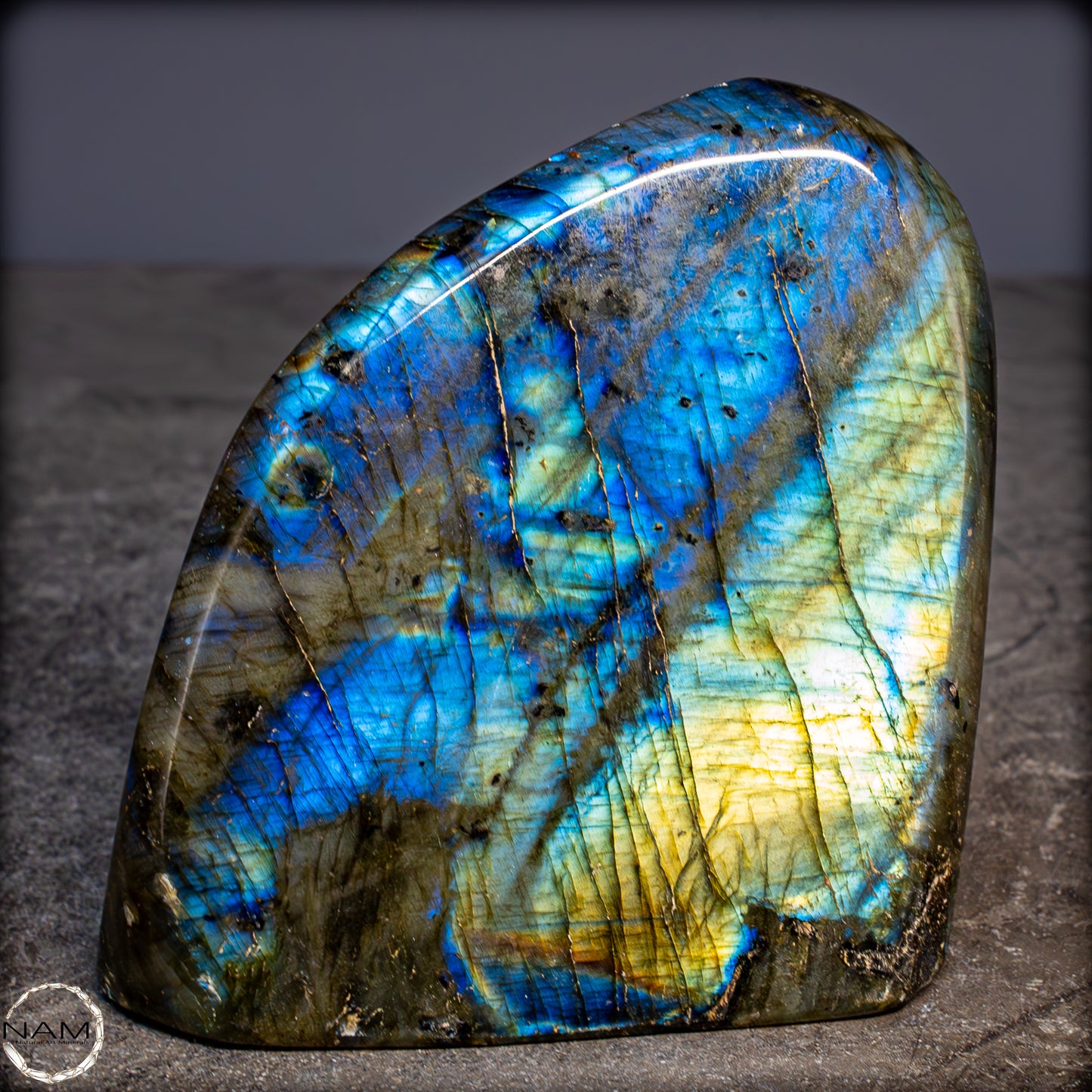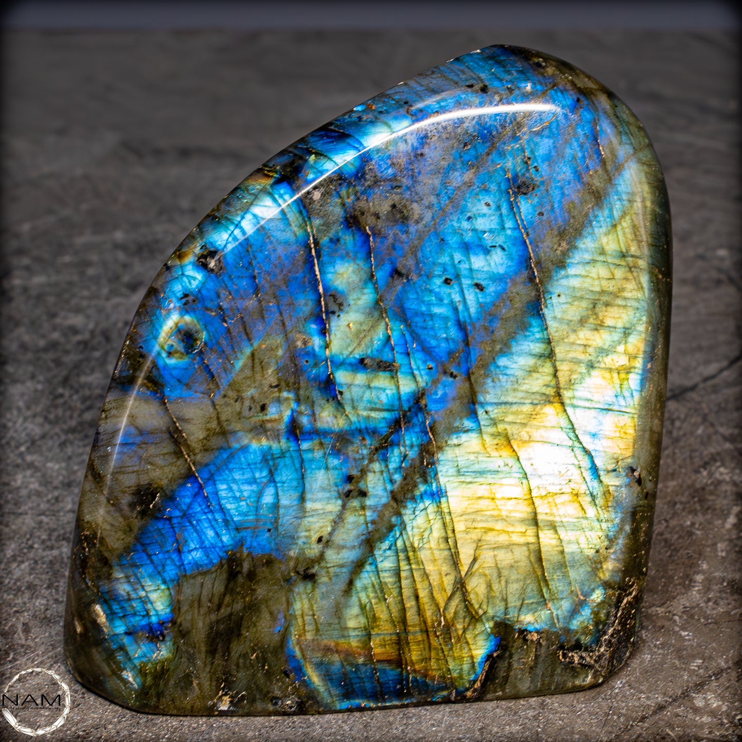 Das magische Farbenspiel des Labradorits wird auch Labradorisieren genannt. Das natürliche Licht bricht an den Kristallen auf der Oberfläche des Edelsteins. Die in ihm enthaltenen Mineralien reflektieren blau,gelb, gold, orange und grün. Einer Inuit-Legende zufolge schlug ein Krieger mit seinem Schwert auf ein großes Stück Labradorit ein. Die vielen Farben stiegen in den Himmel hinauf. So wurden die Nordlichter geboren.