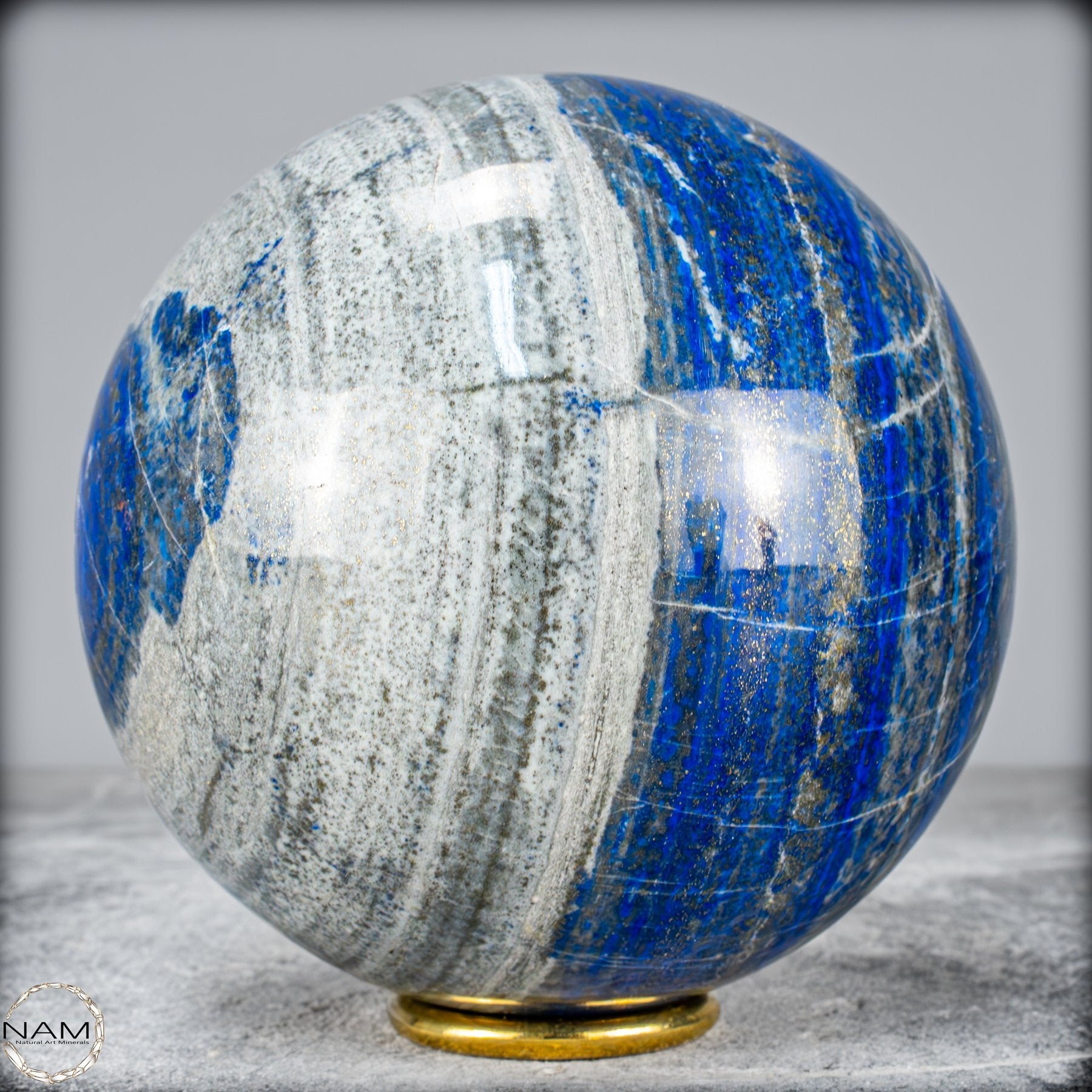 Traumhafte Qualitäts-Lapis-Sphäre bietet einen außergewöhnlichen Blick mit ihrer einzigartigen Maserung sowie Farbwechsel zwischen Königsblau und hellem Azur. Ihre Oberfläche zeigt außergewöhnliche Flecken, die einen atemberaubenden Kontrast zu Adern mit üppigem goldenem Pyrit bilden. Obwohl viele Lapis-Sphären auf dem Markt erhältlich sind, sehen wir uns in der Verantwortung, nur mit den schönsten Merkmalen und ungewöhnlichen Farbspielen auszuwählen, und diese Sphäre verkörpert dieses Ziel in Perfektion.