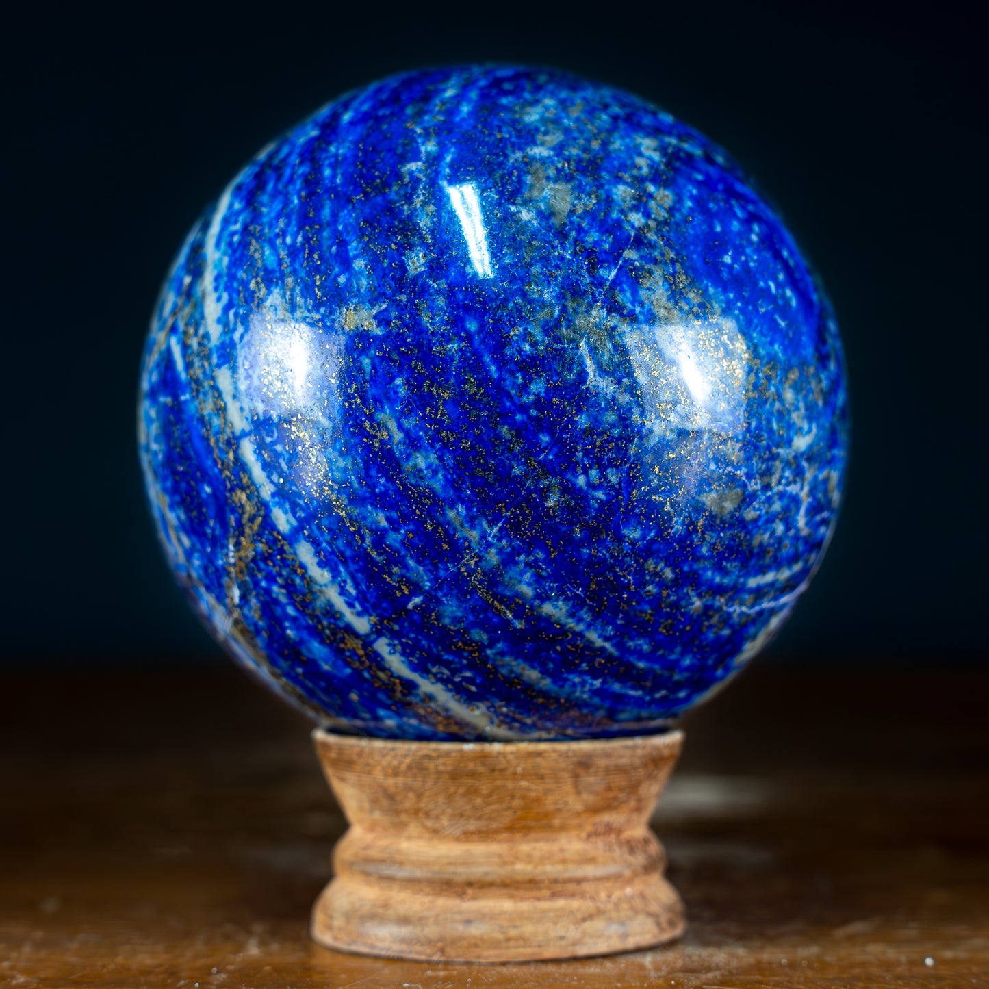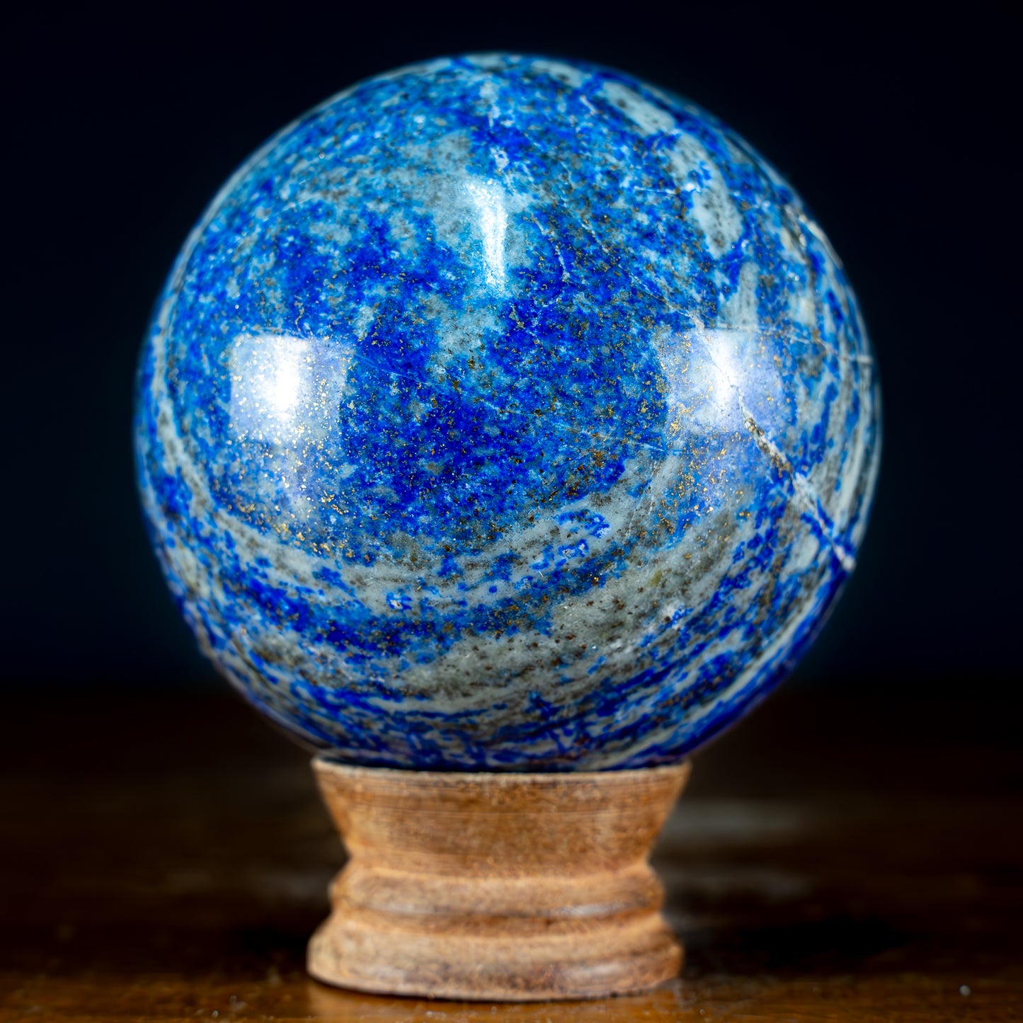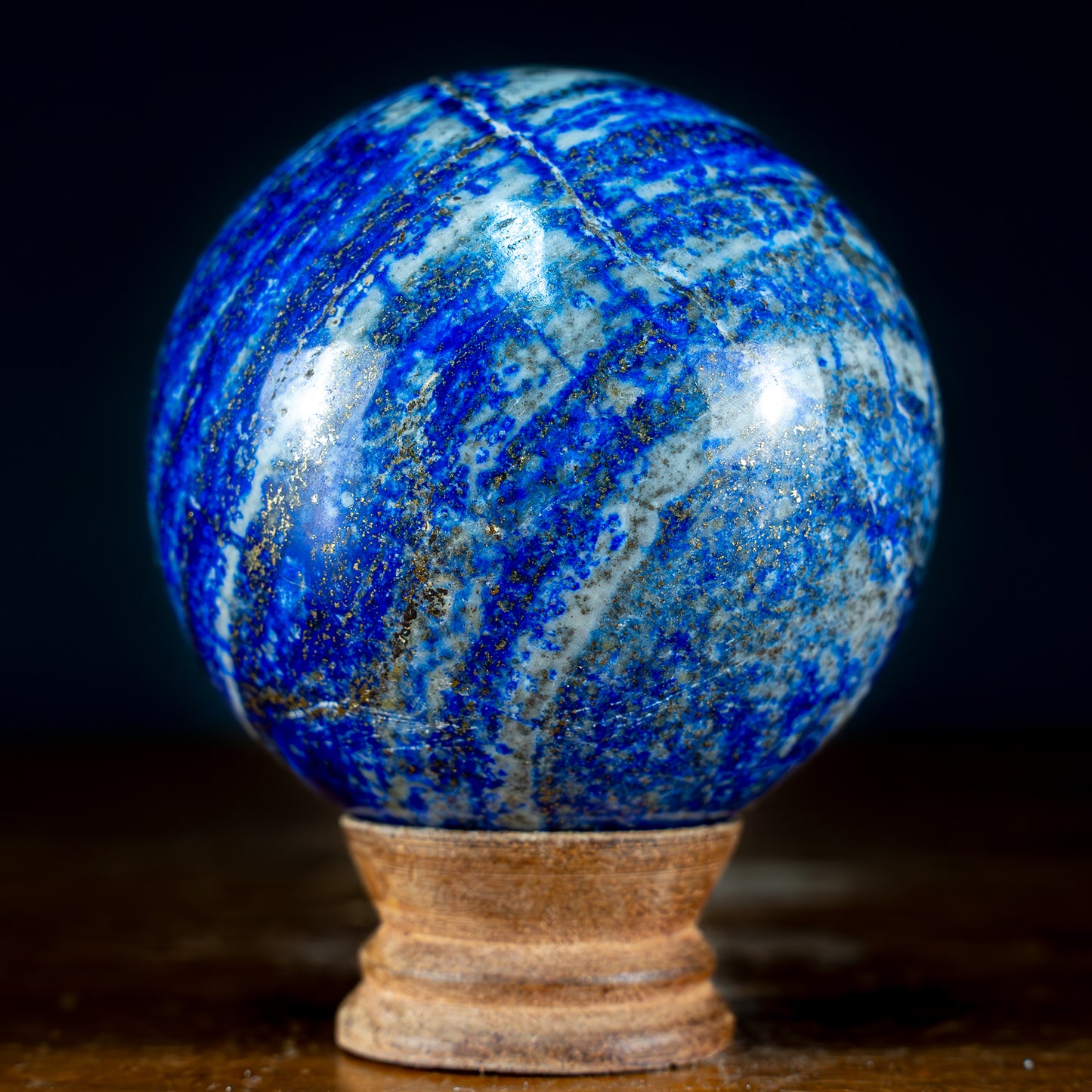 Traumhafte Qualitäts-Lapis-Sphäre bietet einen außergewöhnliches einblick mit ihrem einzigartigen Maserung sowie Farbwechsel zwischen Königsblau und hellem Azur. Ihre Oberfläche zeigt außergewöhnliche Flecken, die einen atemberaubenden Kontrast zu Adern mit reichhaltiger goldener Pyrit bilden. Obwohl viele Lapis-Sphären auf dem Markt erhältlich sind, sehen wir uns in der Verantwortung, nur solche mit den schönsten Merkmalen und ungewöhnlichen Farbspielen auszuwählen, und diese Sphäre verkörpert dieses Ziel in Perfektion.