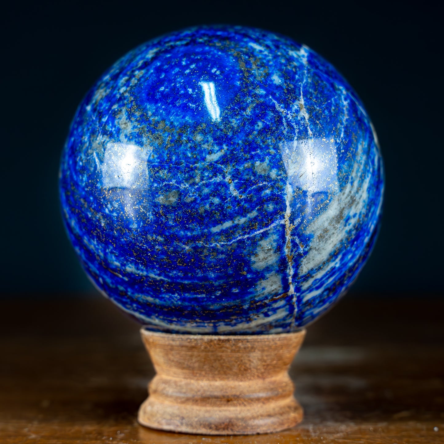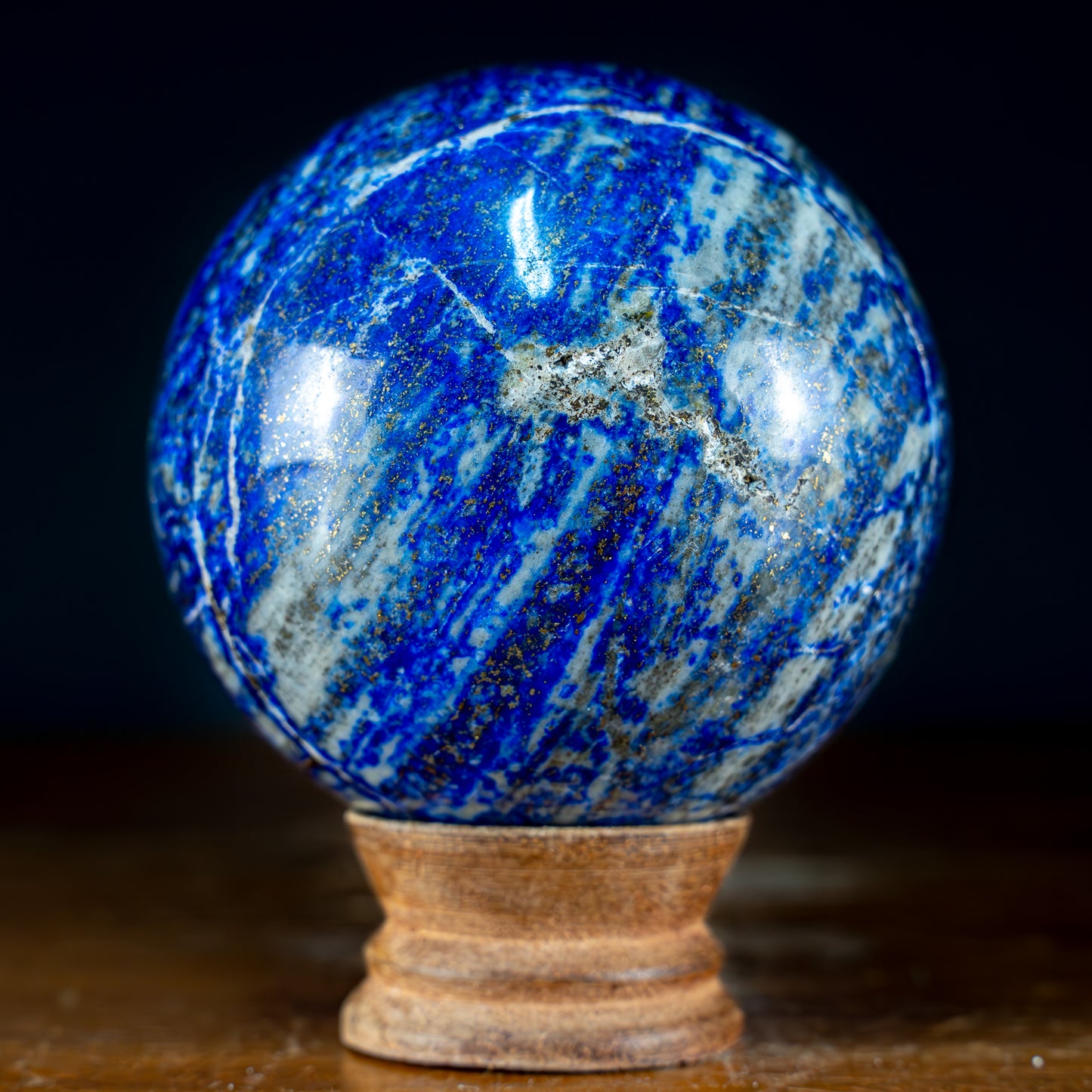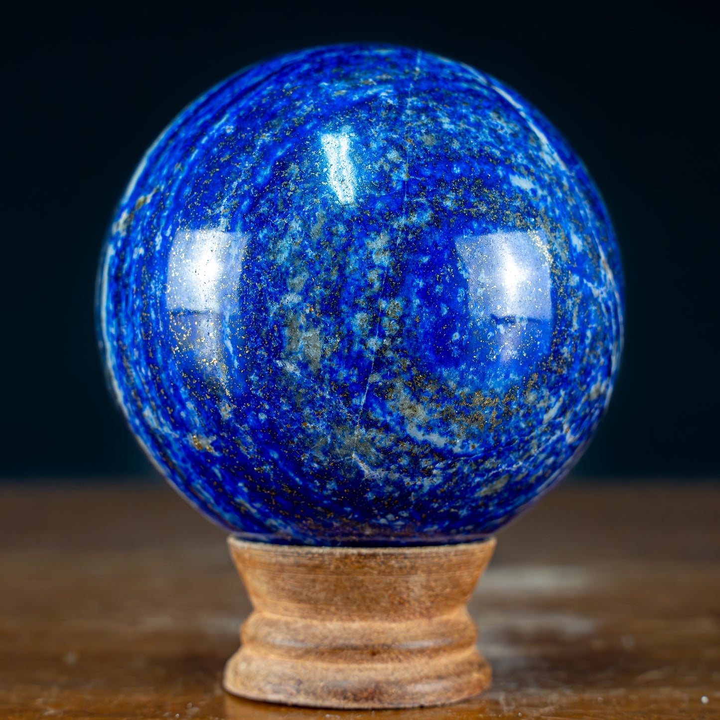 Traumhafte Qualitäts-Lapis-Sphäre bietet einen außergewöhnliches einblick mit ihrem einzigartigen Maserung sowie Farbwechsel zwischen Königsblau und hellem Azur. Ihre Oberfläche zeigt außergewöhnliche Flecken, die einen atemberaubenden Kontrast zu Adern mit reichhaltiger goldener Pyrit bilden. Obwohl viele Lapis-Sphären auf dem Markt erhältlich sind, sehen wir uns in der Verantwortung, nur solche mit den schönsten Merkmalen und ungewöhnlichen Farbspielen auszuwählen, und diese Sphäre verkörpert dieses Ziel in Perfektion.