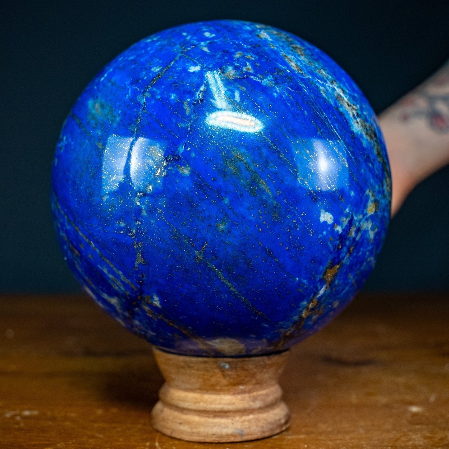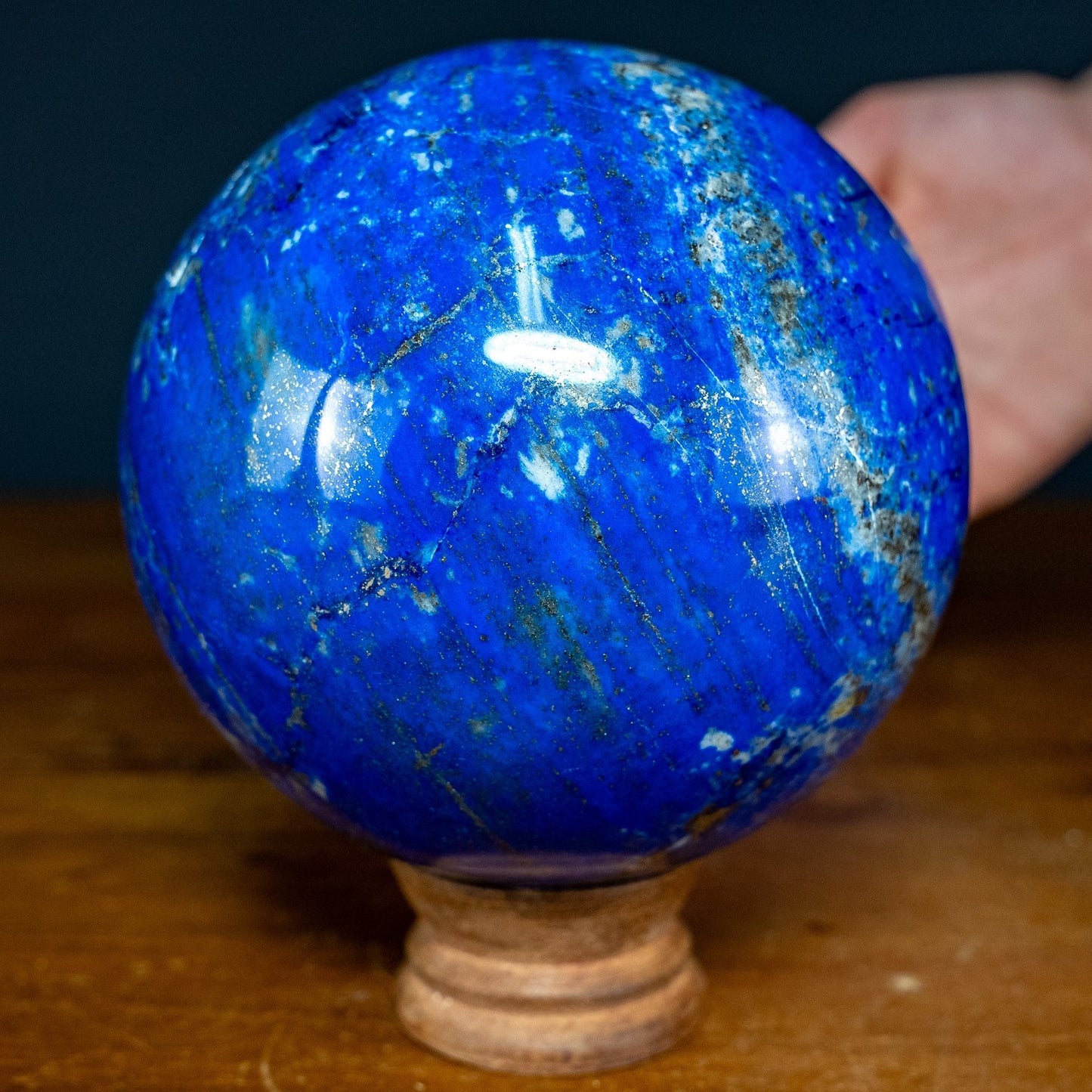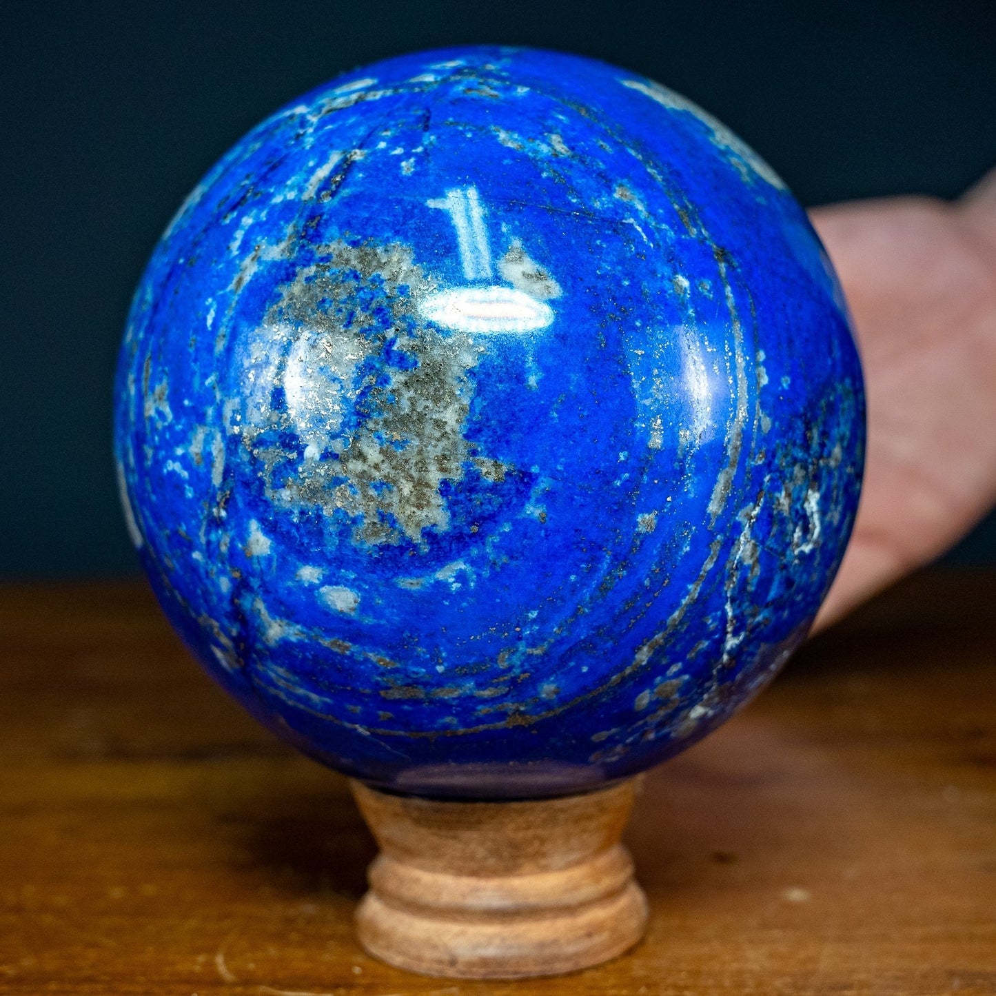 Traumhafte Qualitäts-Lapis-Sphäre bietet einen außergewöhnliches einblick mit ihrem einzigartigen Maserung sowie Farbwechsel zwischen Königsblau und hellem Azur. Ihre Oberfläche zeigt außergewöhnliche Flecken, die einen atemberaubenden Kontrast zu Adern mit reichhaltiger goldener Pyrit bilden. Obwohl viele Lapis-Sphären auf dem Markt erhältlich sind, sehen wir uns in der Verantwortung, nur solche mit den schönsten Merkmalen und ungewöhnlichen Farbspielen auszuwählen, und diese Sphäre verkörpert dieses Ziel in Perfektion.