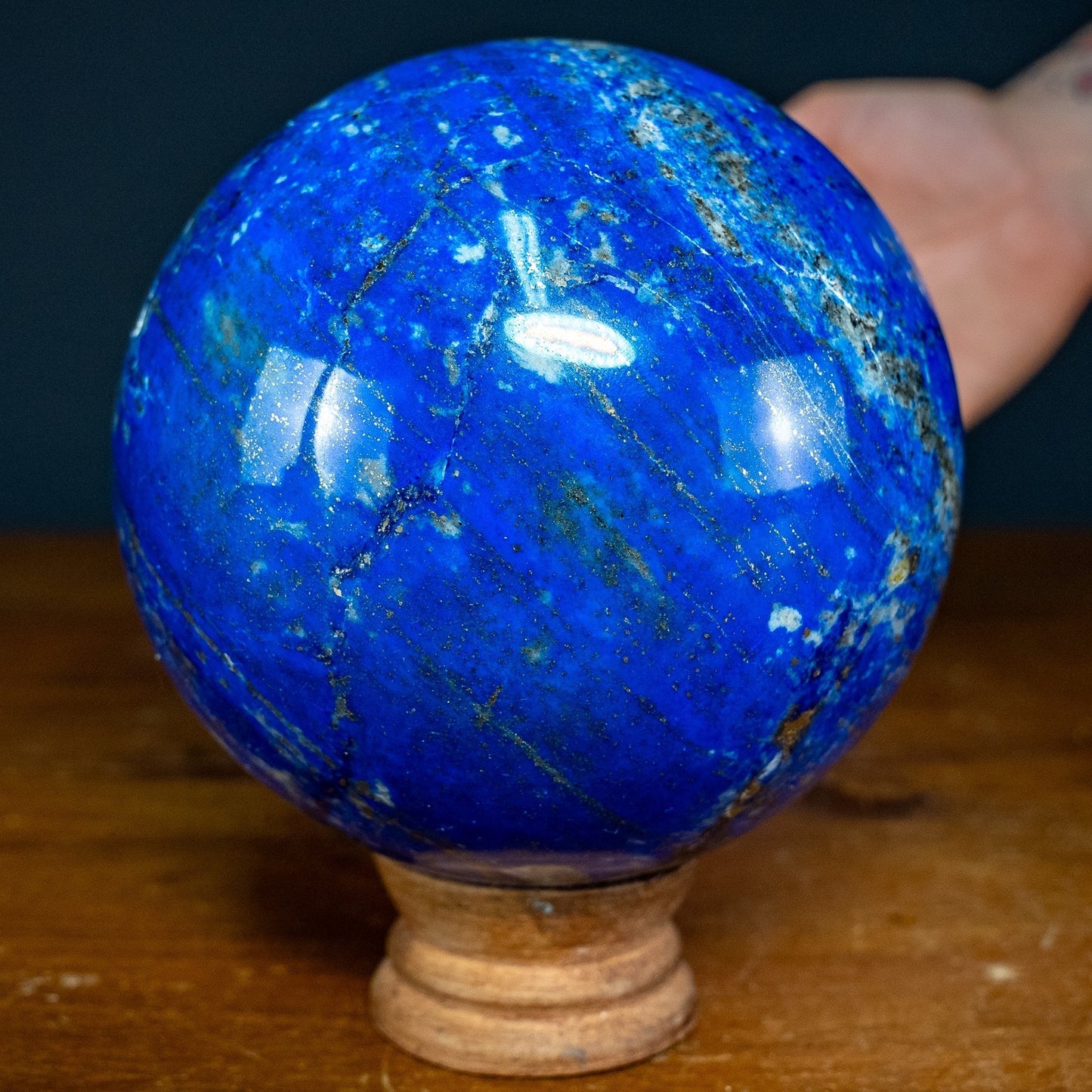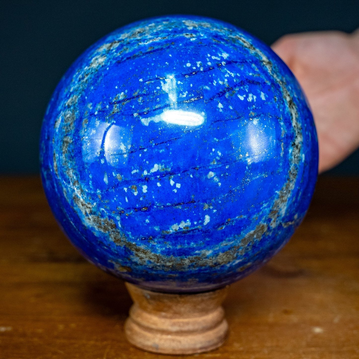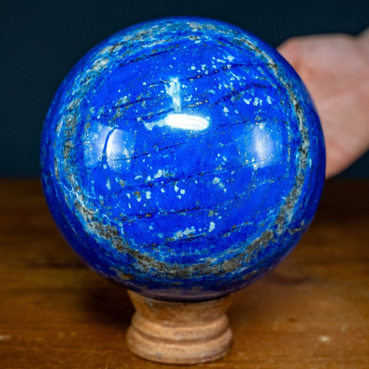 Traumhafte Qualitäts-Lapis-Sphäre bietet einen außergewöhnliches einblick mit ihrem einzigartigen Maserung sowie Farbwechsel zwischen Königsblau und hellem Azur. Ihre Oberfläche zeigt außergewöhnliche Flecken, die einen atemberaubenden Kontrast zu Adern mit reichhaltiger goldener Pyrit bilden. Obwohl viele Lapis-Sphären auf dem Markt erhältlich sind, sehen wir uns in der Verantwortung, nur solche mit den schönsten Merkmalen und ungewöhnlichen Farbspielen auszuwählen, und diese Sphäre verkörpert dieses Ziel in Perfektion.