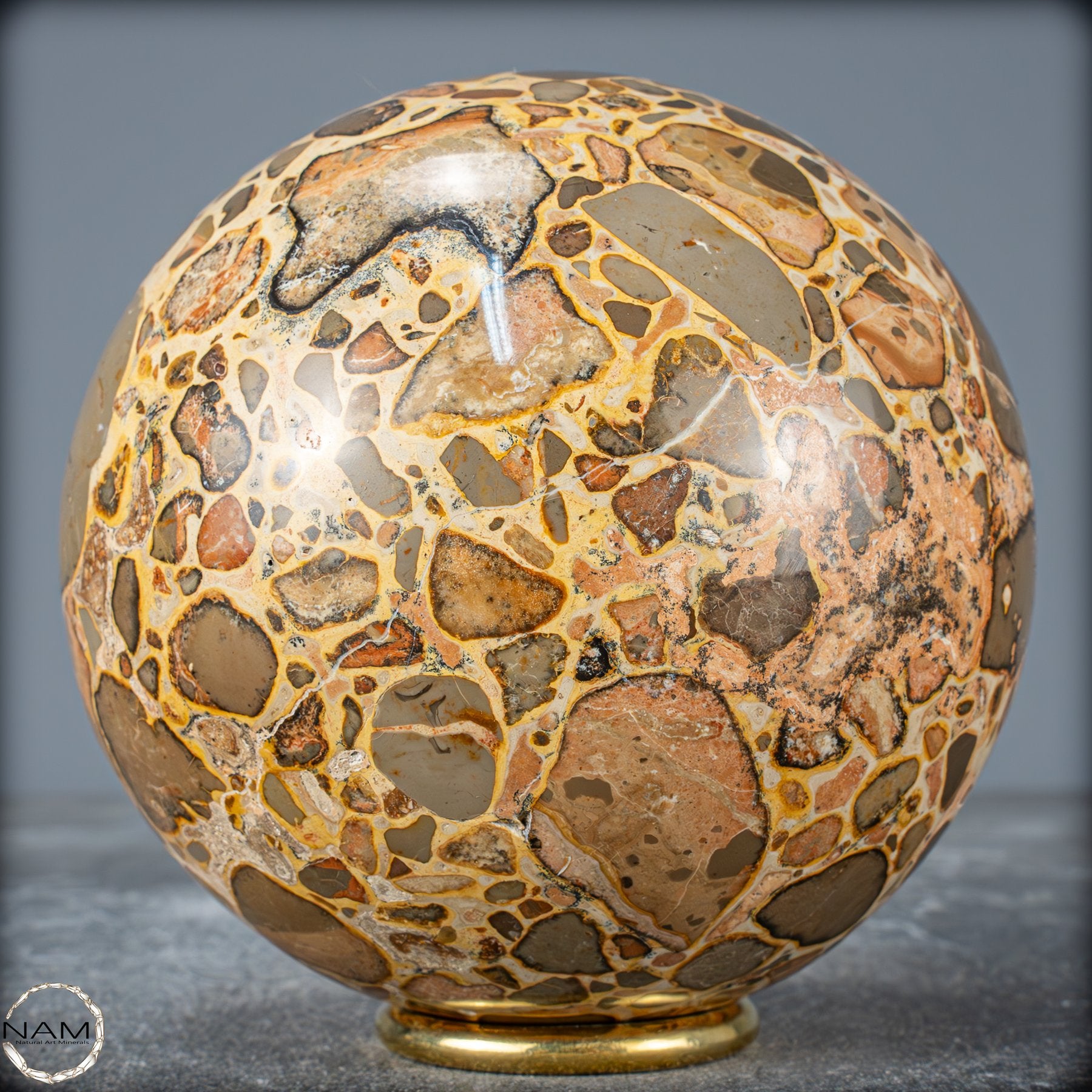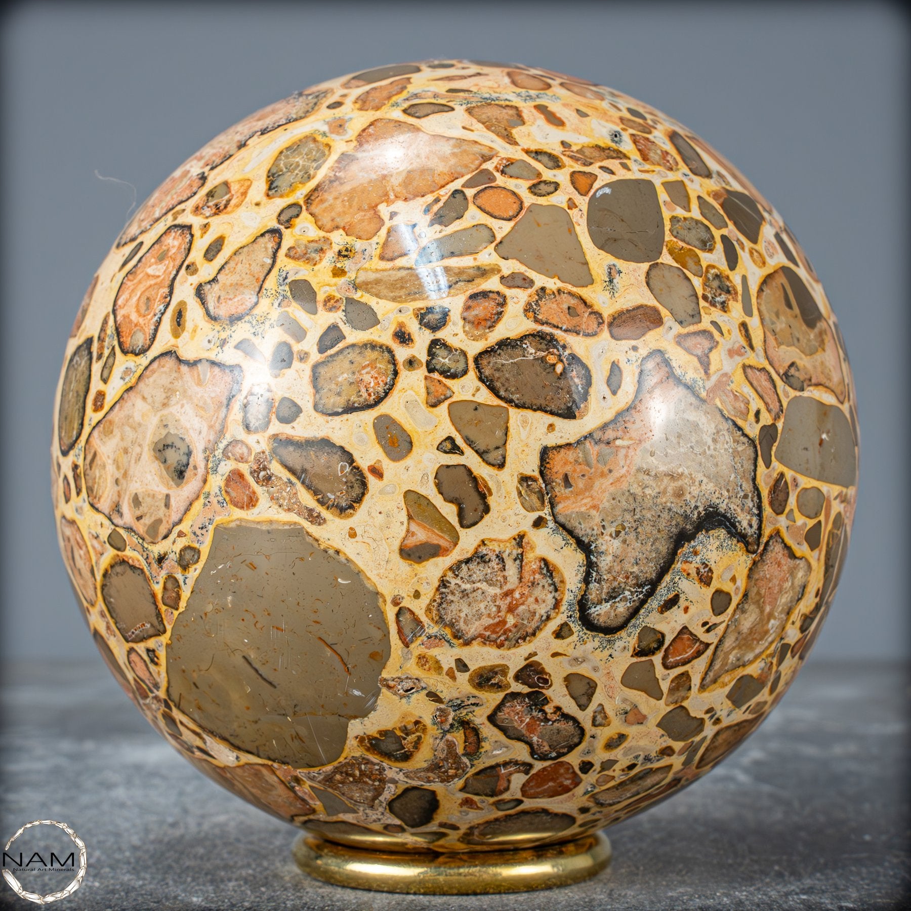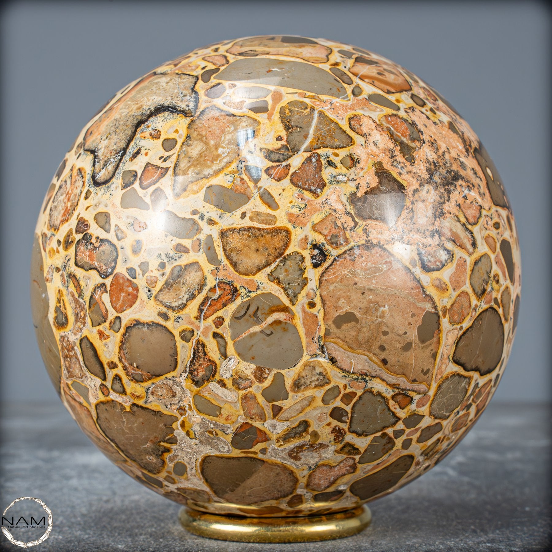 Leoparden-Jaspis ist bekannt für seine charakteristische Maserung, die an das Fell eines Leoparden erinnert, und diese Kugel zeigt diese einzigartige Musterung in ihrer ganzen Pracht. Die polierte Oberfläche bringt die Farben und Texturen des Jaspis optimal zur Geltung und macht diese Kugel zu einem echten Hingucker.