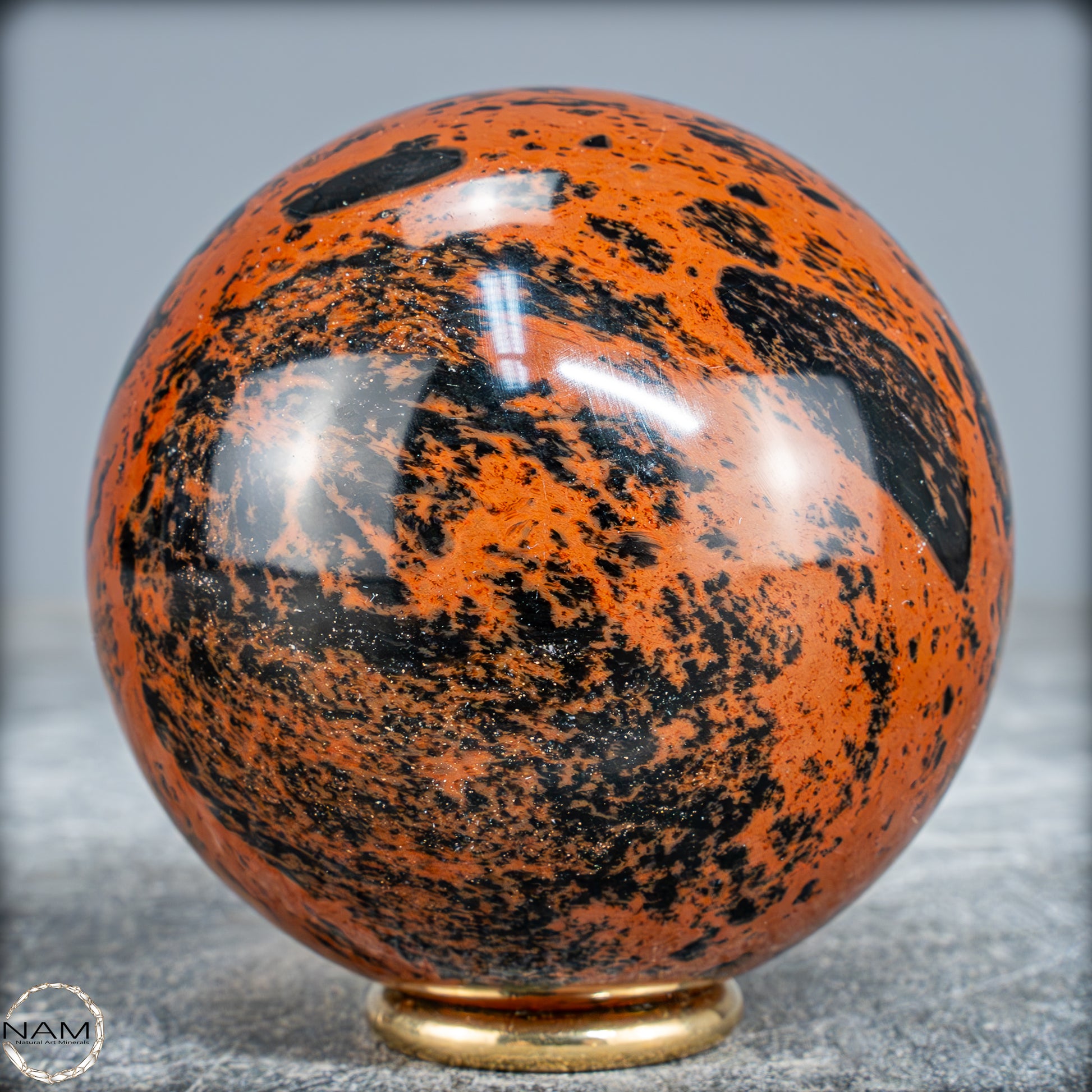 Dieses wunderschöne Stück zeichnet sich durch seine tiefschwarze Grundfarbe und die charakteristischen rötlich-braunen Flecken aus, die ihm seinen Namen geben. Die Kugel stammt aus Mexiko, bekannt für seine hochwertigen Mahagoni-Obsidian-Vorkommen. Perfekt poliert und in ausgezeichnetem Zustand, ist diese Kugel ein unverzichtbares Sammlerstück für Liebhaber von Natursteinen und Mineraliensammlern gleichermaßen. Ein wahrhaft außergewöhnliches Stück, das sowohl als dekoratives Element als auch für spirituelle Zwecke genutzt werden kann.“