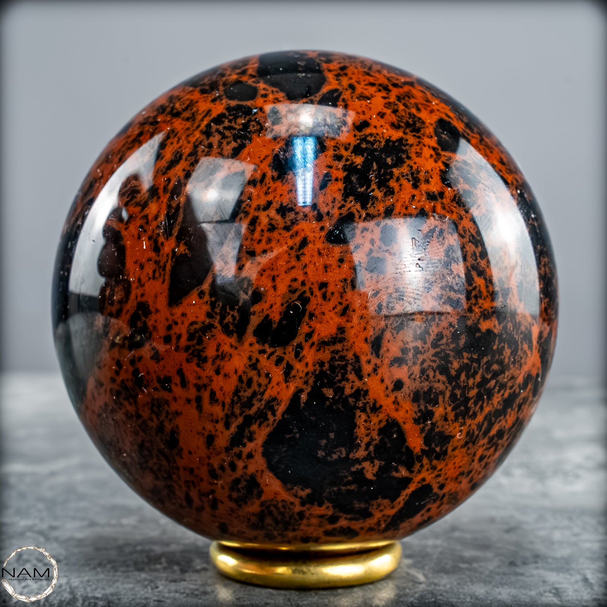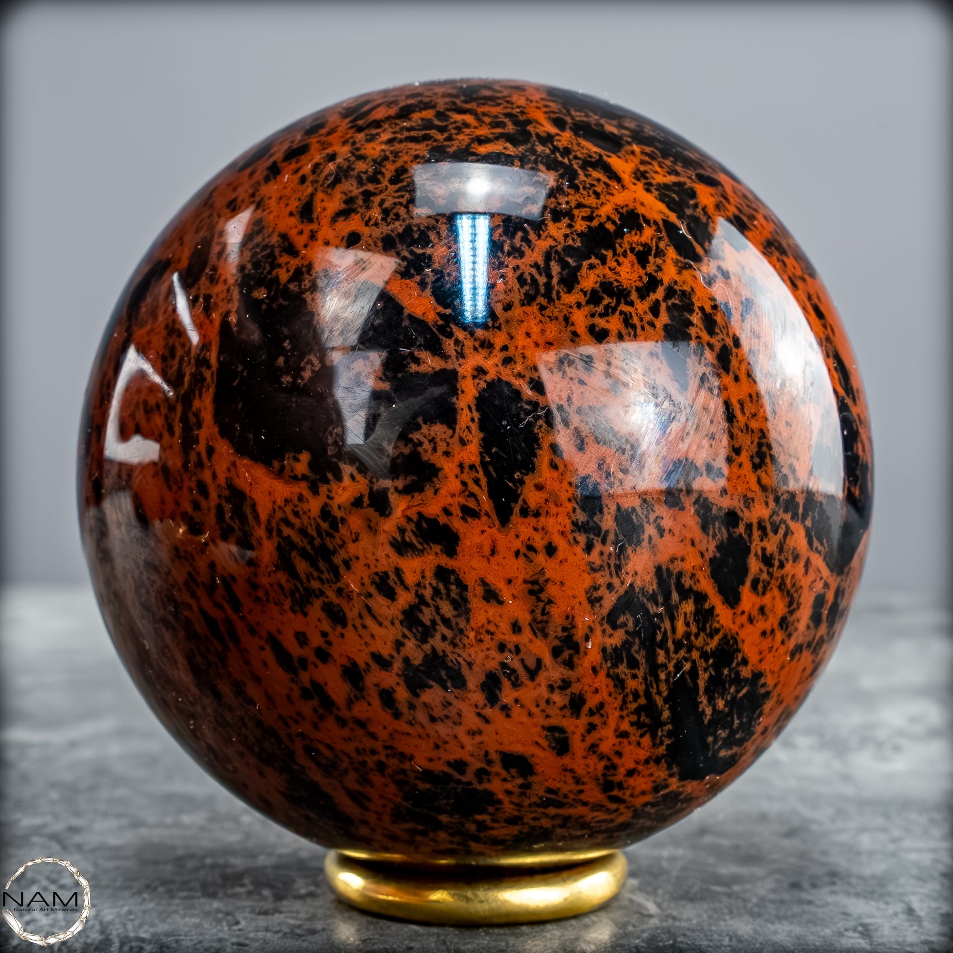 Dieses wunderschöne Stück zeichnet sich durch seine tiefschwarze Grundfarbe und die charakteristischen rötlich-braunen Flecken aus, die ihm seinen Namen geben. Die Kugel stammt aus Mexiko, bekannt für seine hochwertigen Mahagoni-Obsidian-Vorkommen. Perfekt poliert und in ausgezeichnetem Zustand, ist diese Kugel ein unverzichtbares Sammlerstück für Liebhaber von Natursteinen und Mineraliensammlern gleichermaßen. Ein wahrhaft außergewöhnliches Stück, das sowohl als dekoratives Element als auch für spirituelle Zwecke genutzt werden kann.“