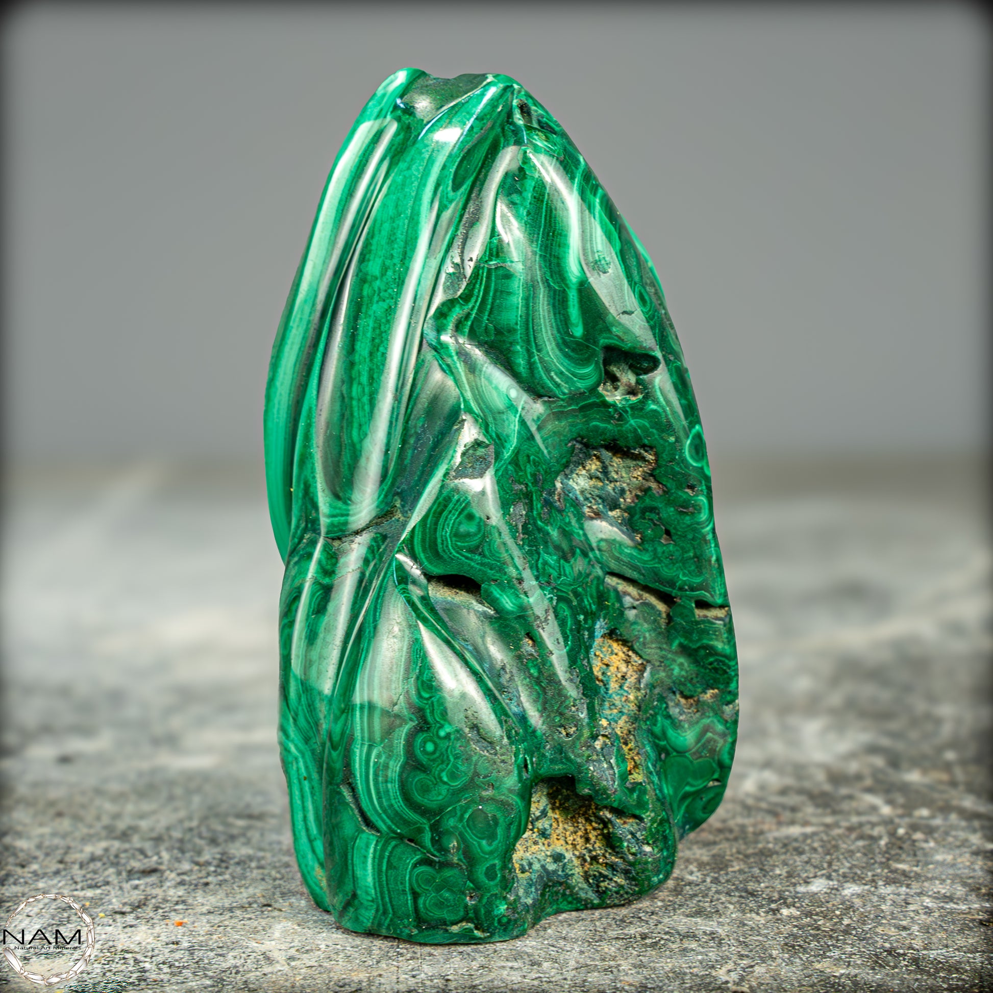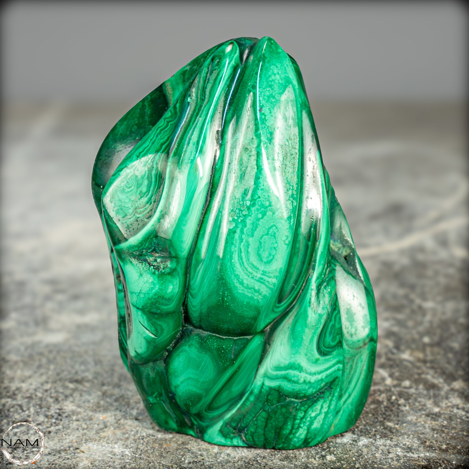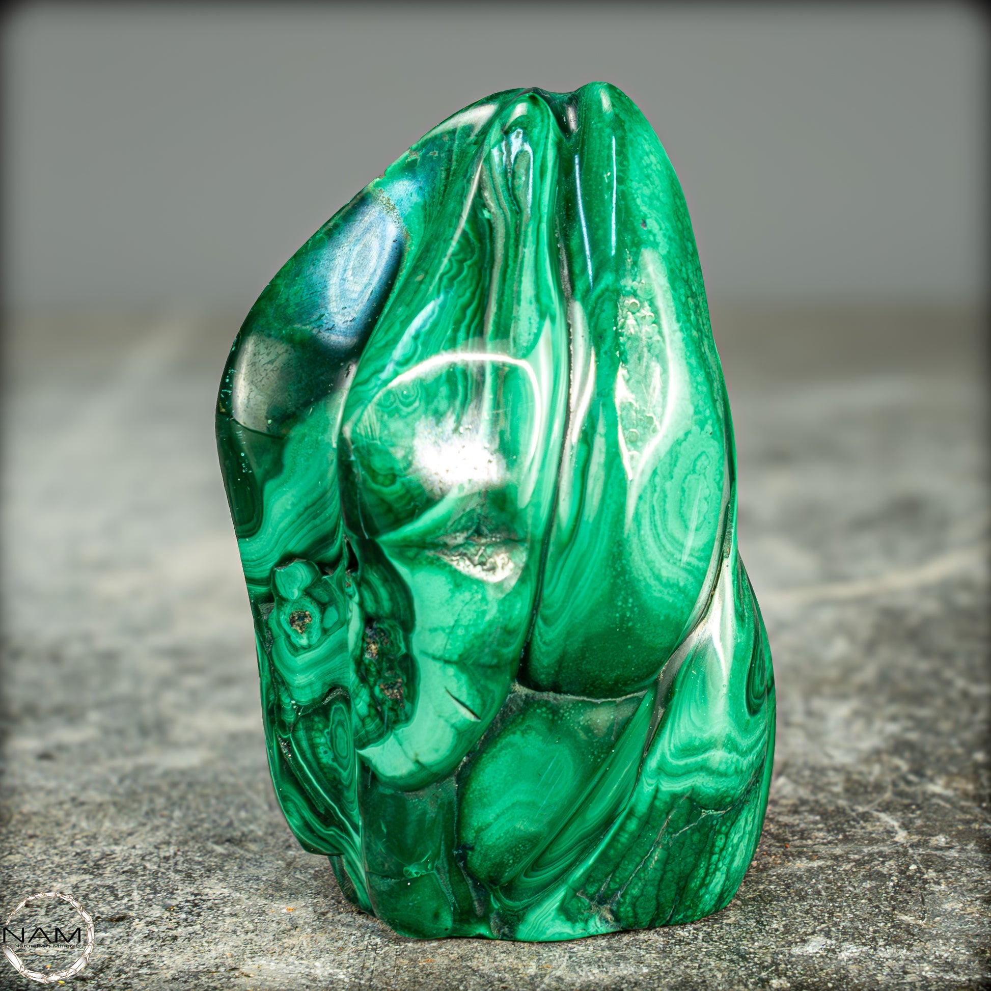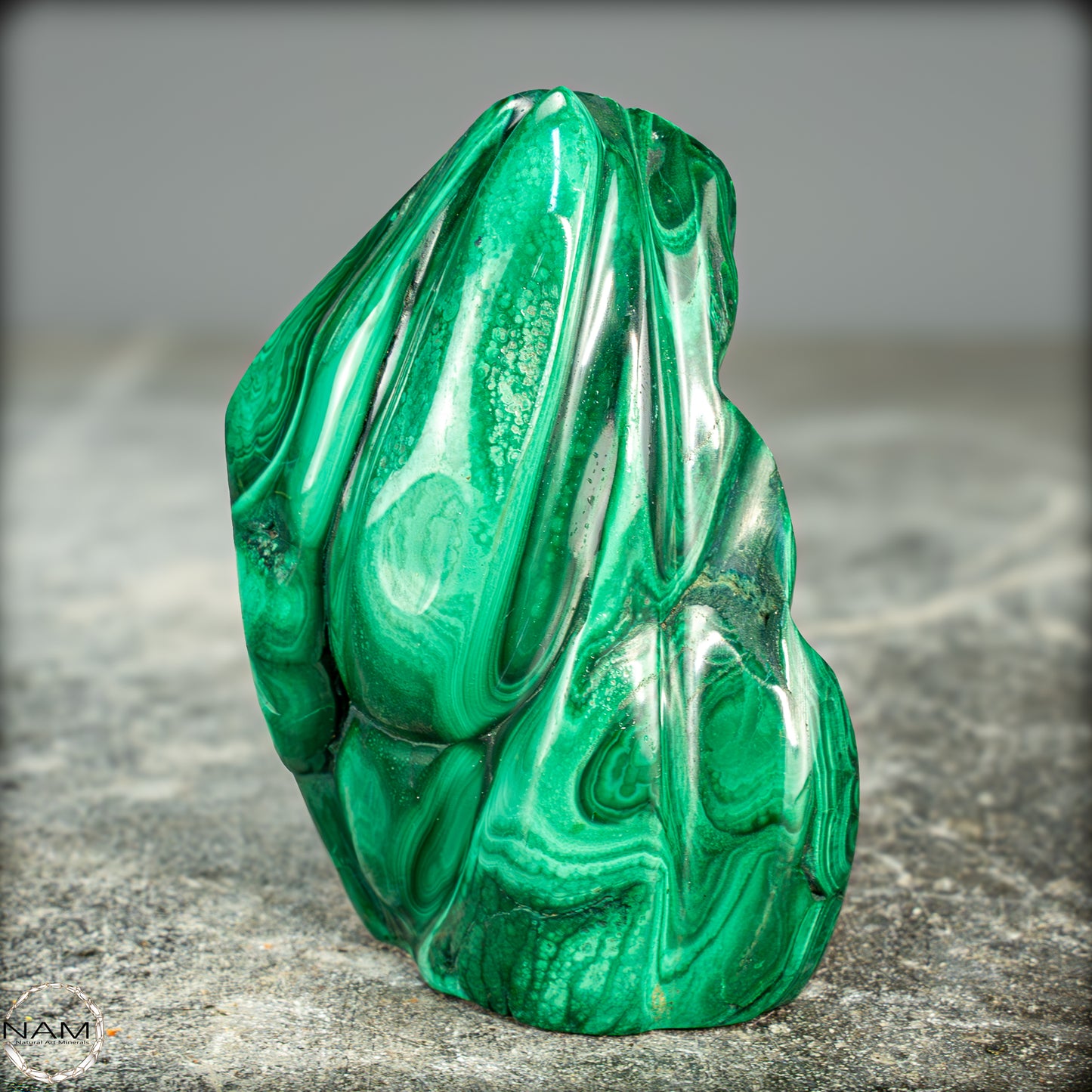 Die plastische Form wirkt lebendig und kraftvoll, fast skulptural, und lädt zum Betrachten und Berühren gleichermaßen ein. Malachit gilt traditionell als Stein des Schutzes und der Transformation – diese Freiform bringt seine energetischen Qualitäten ebenso wie seine visuelle Schönheit besonders eindrucksvoll zur Geltung.