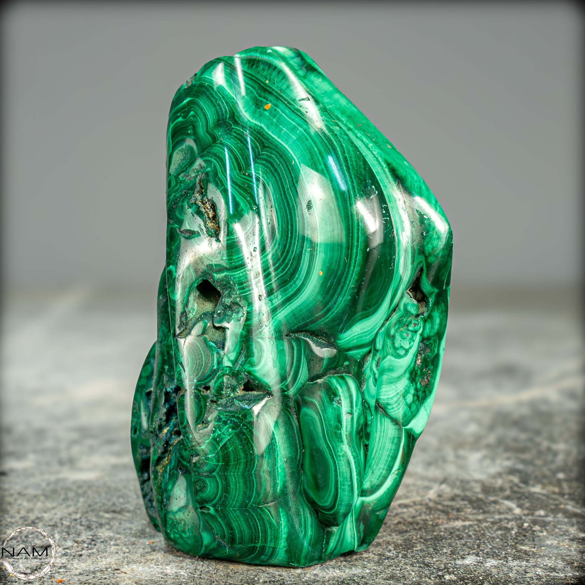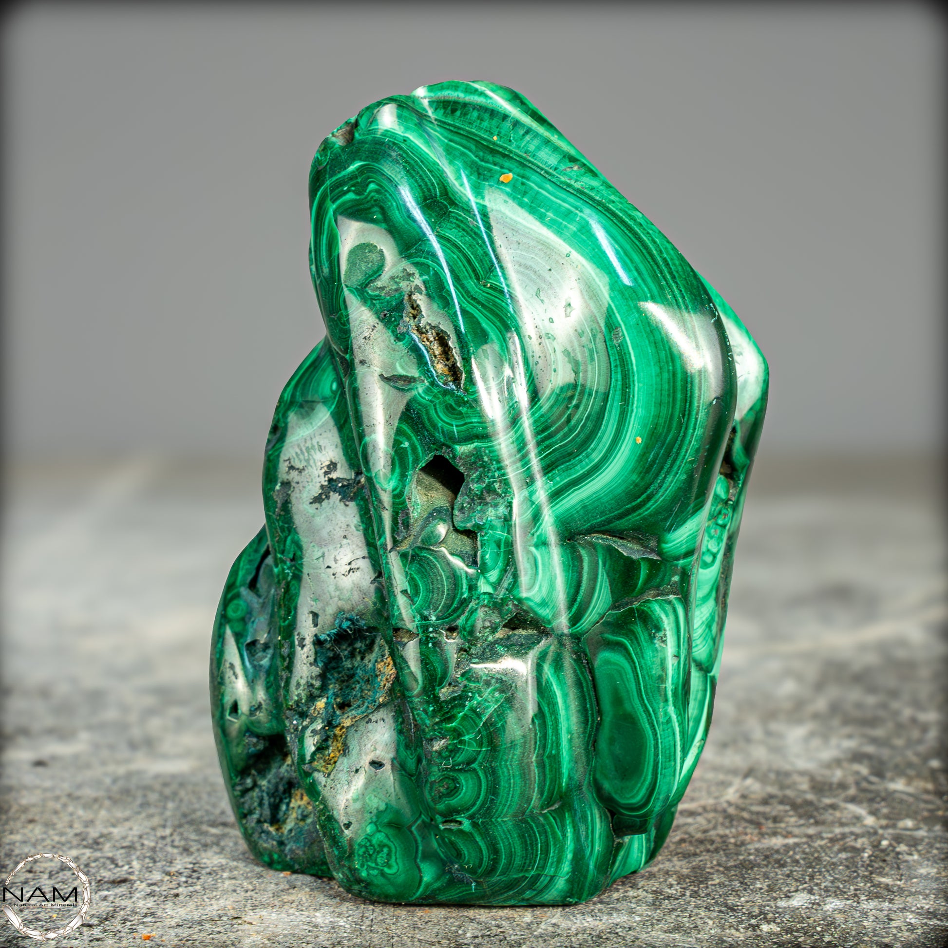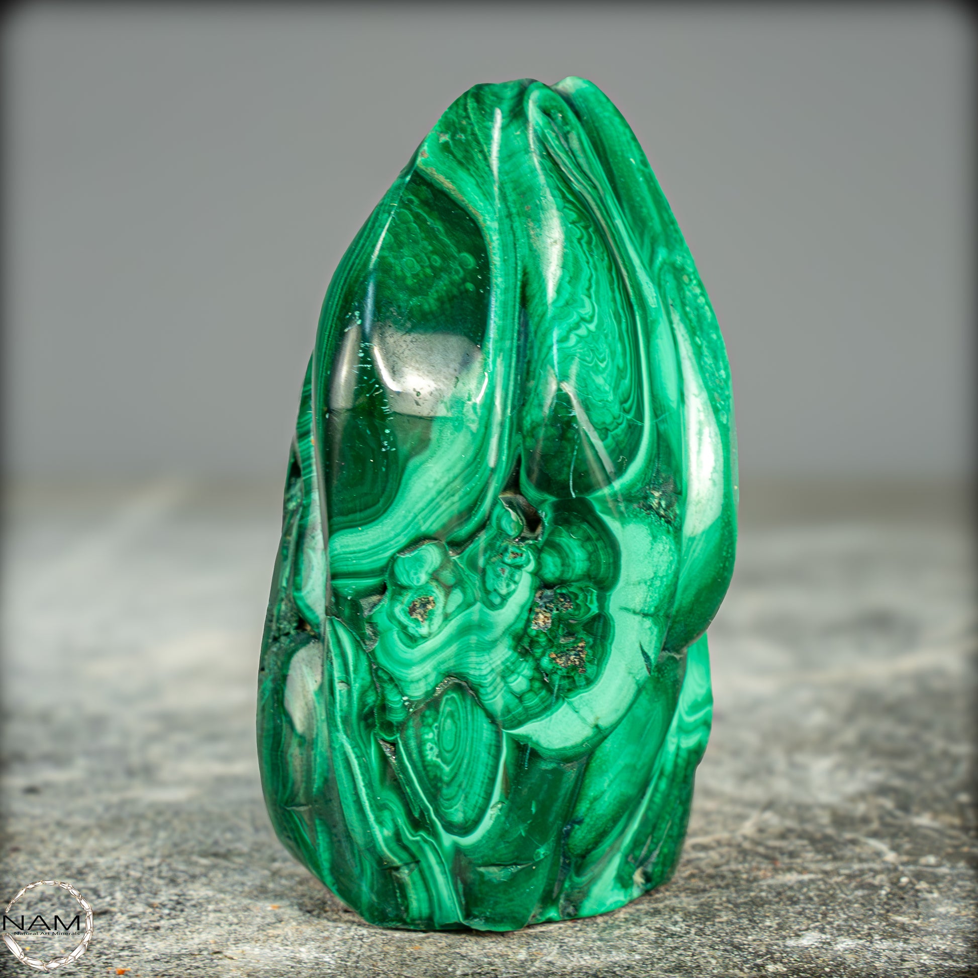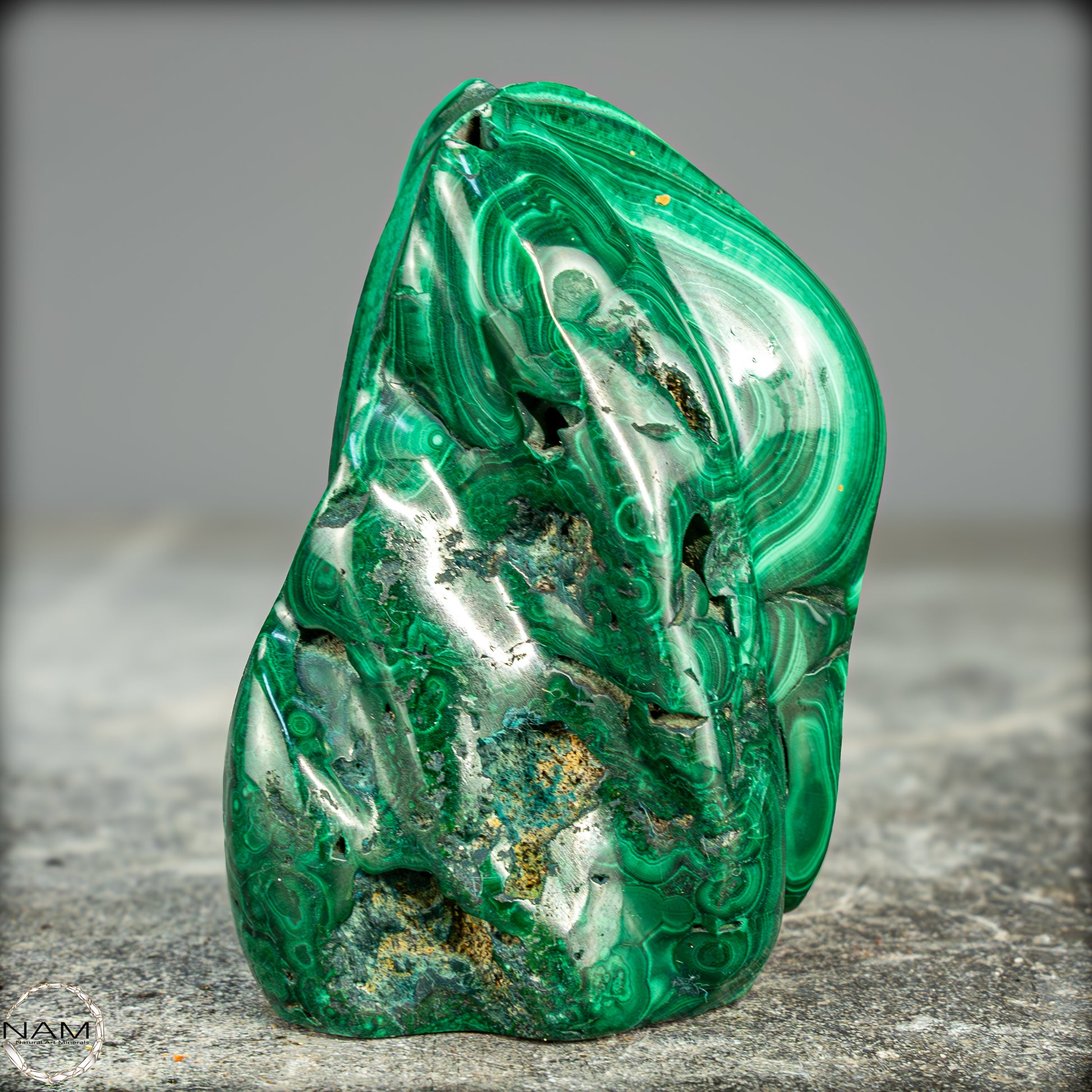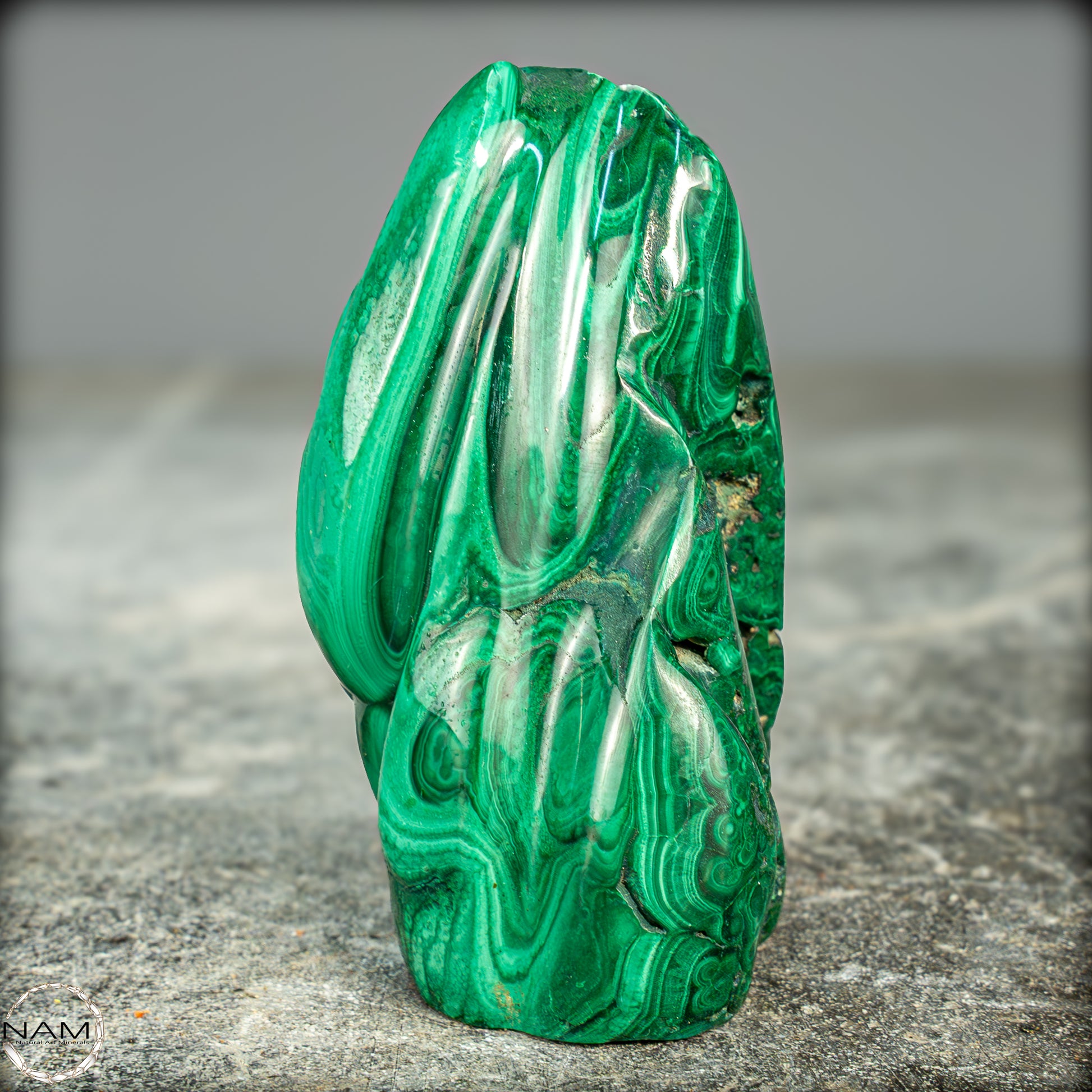 Die plastische Form wirkt lebendig und kraftvoll, fast skulptural, und lädt zum Betrachten und Berühren gleichermaßen ein. Malachit gilt traditionell als Stein des Schutzes und der Transformation – diese Freiform bringt seine energetischen Qualitäten ebenso wie seine visuelle Schönheit besonders eindrucksvoll zur Geltung.