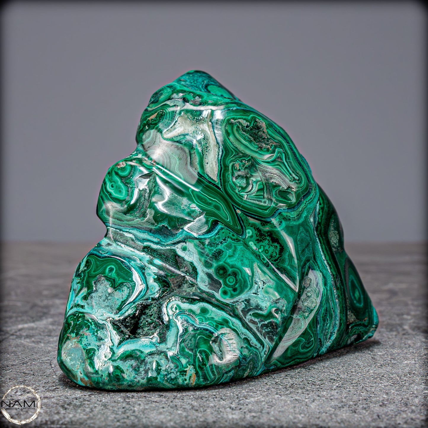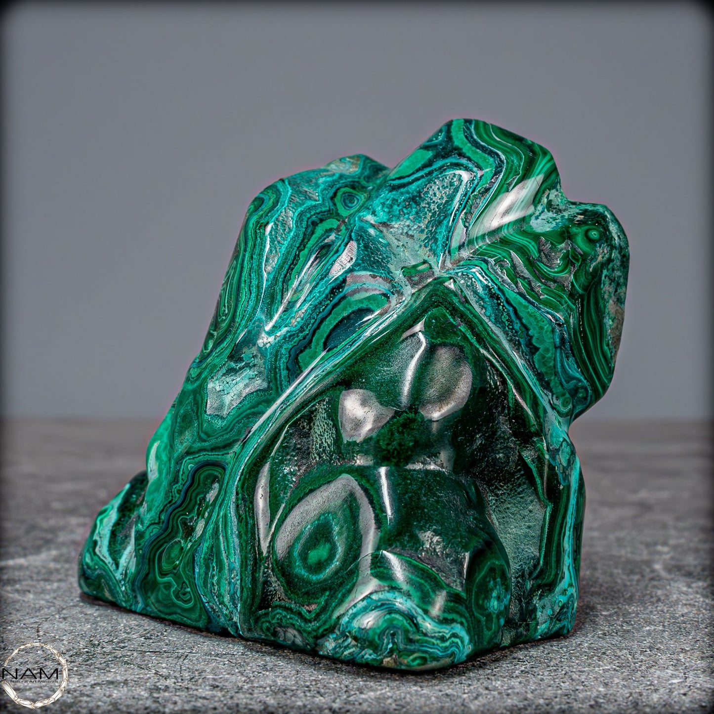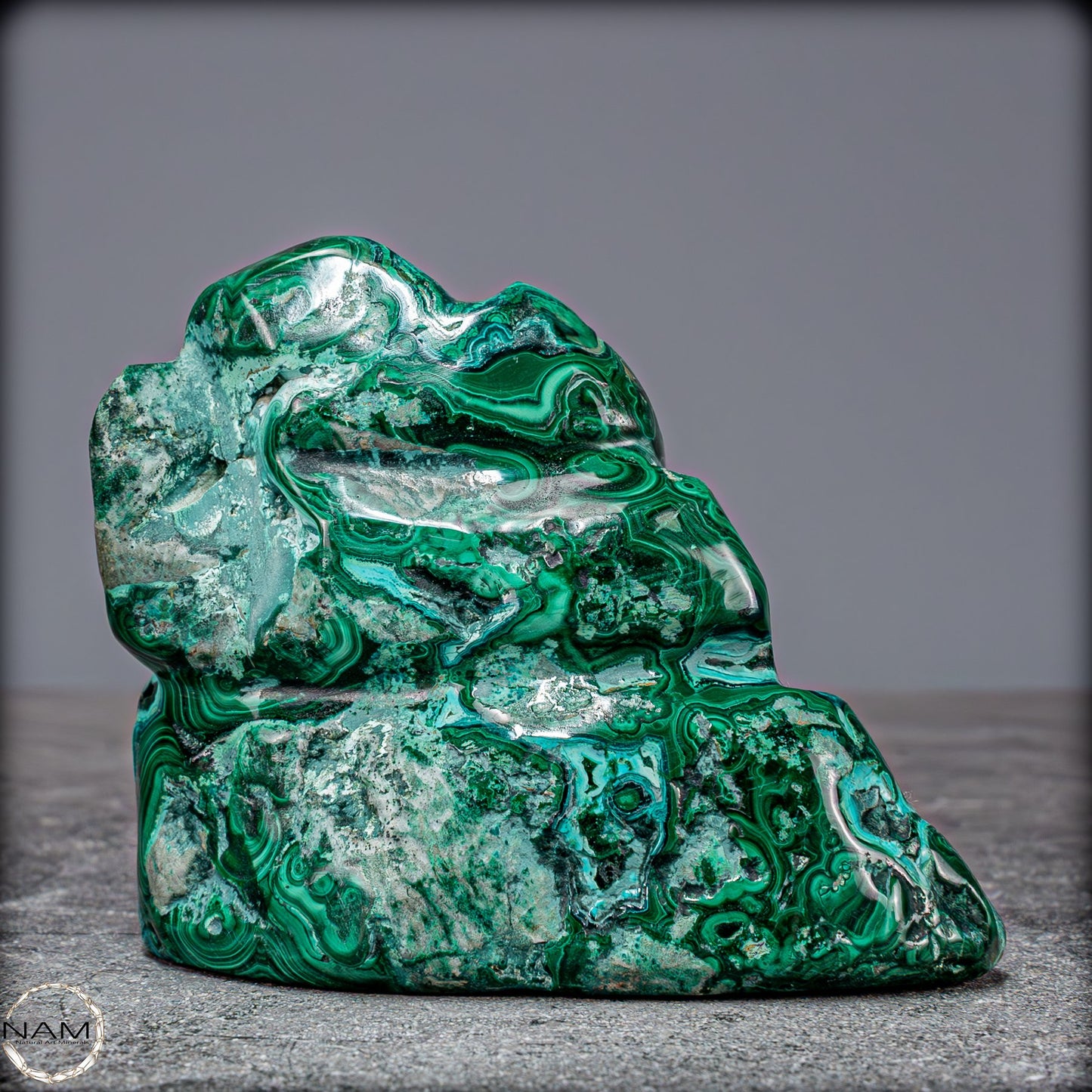 Ideal als dekoratives Herzstück in jedem Raum bringt dieses Kunstwerk nicht nur ästhetischen Genuss, sondern auch die beruhigende Energie beider Edelsteine. Malachit wird oft als Stein des Schutzes angesehen, während Chrysokolla für Harmonie und Frieden steht. Ob für Sammler, Edelsteinliebhaber oder als besonderes Geschenk, diese Freiform ist ein unvergleichliches Symbol der Schönheit und Kraft der Natur.