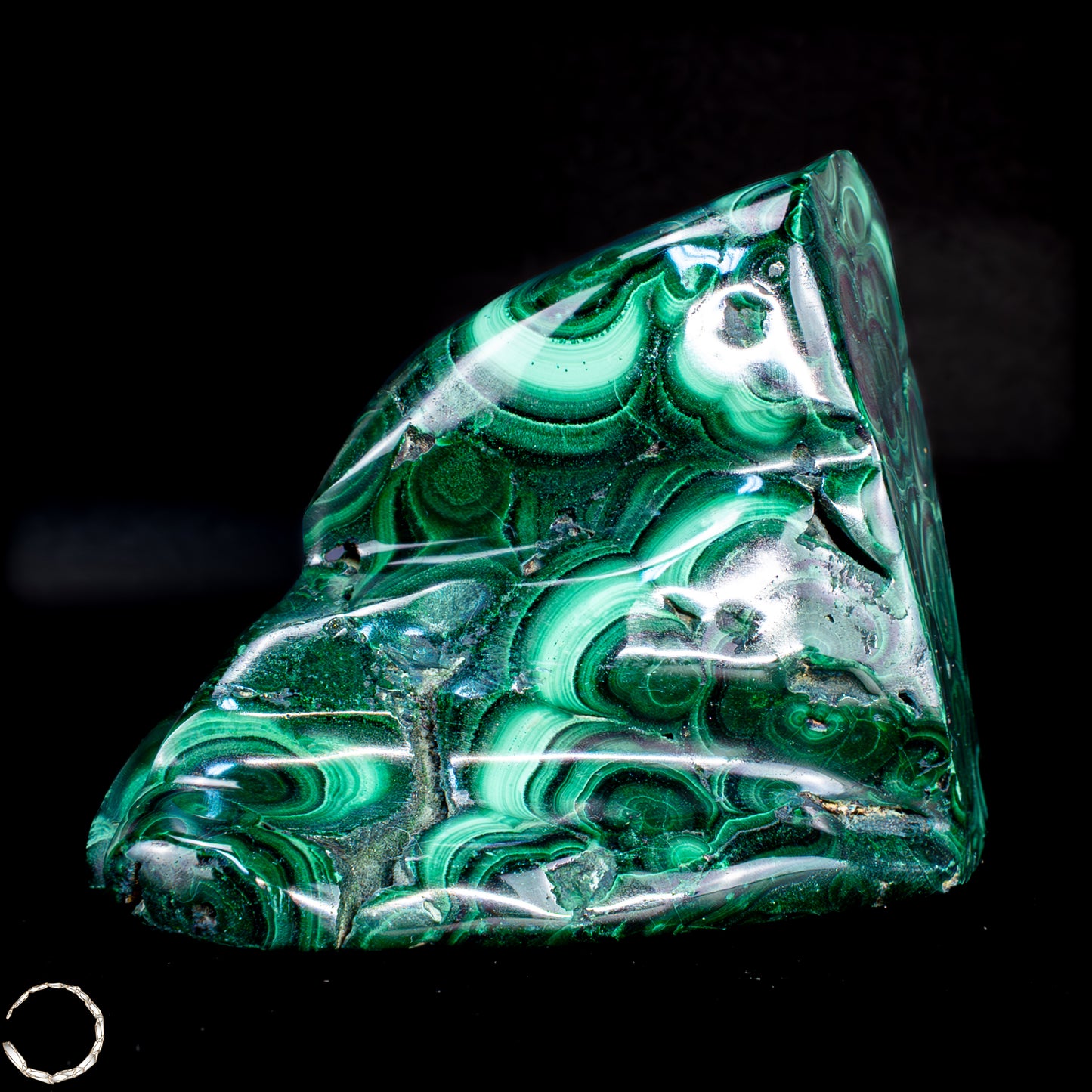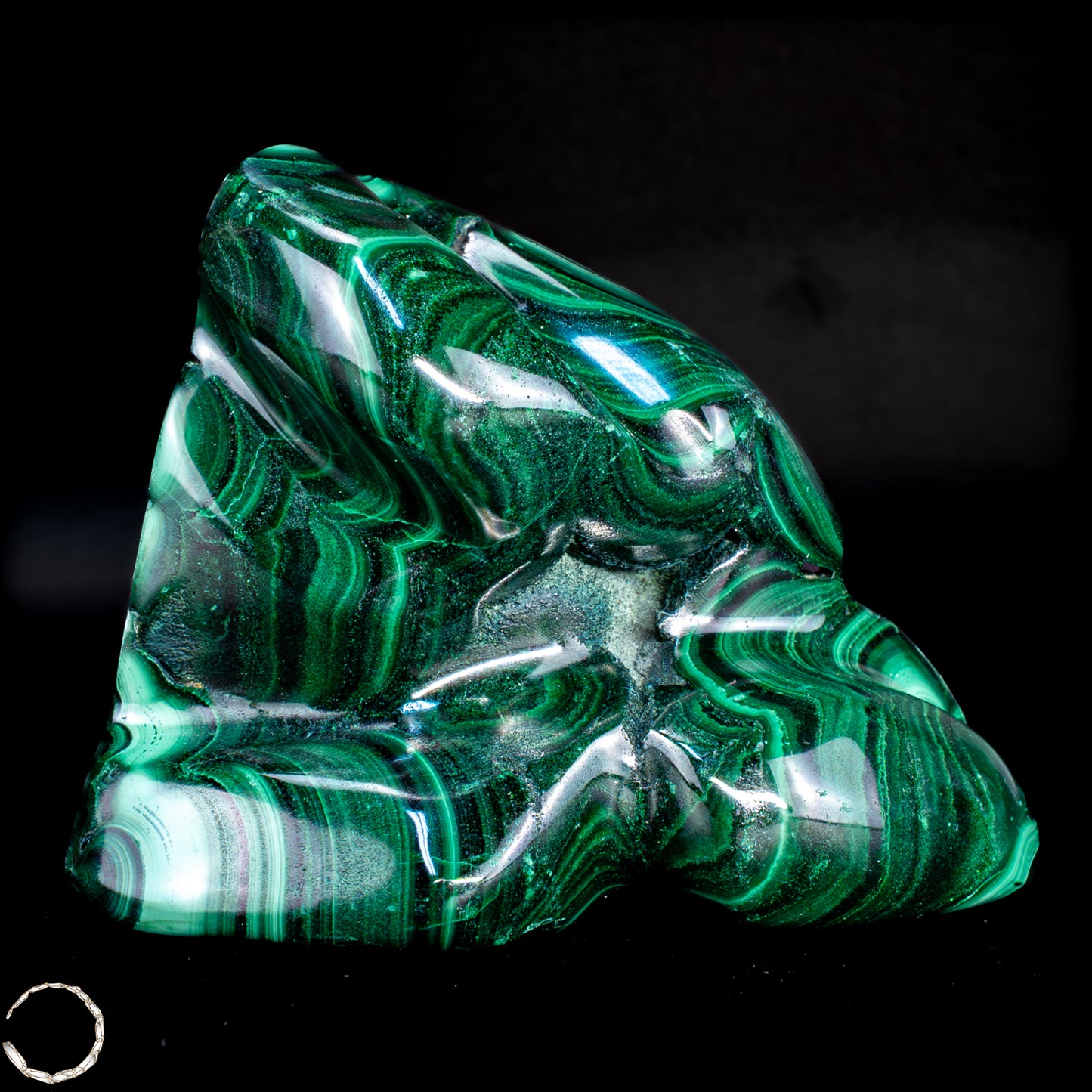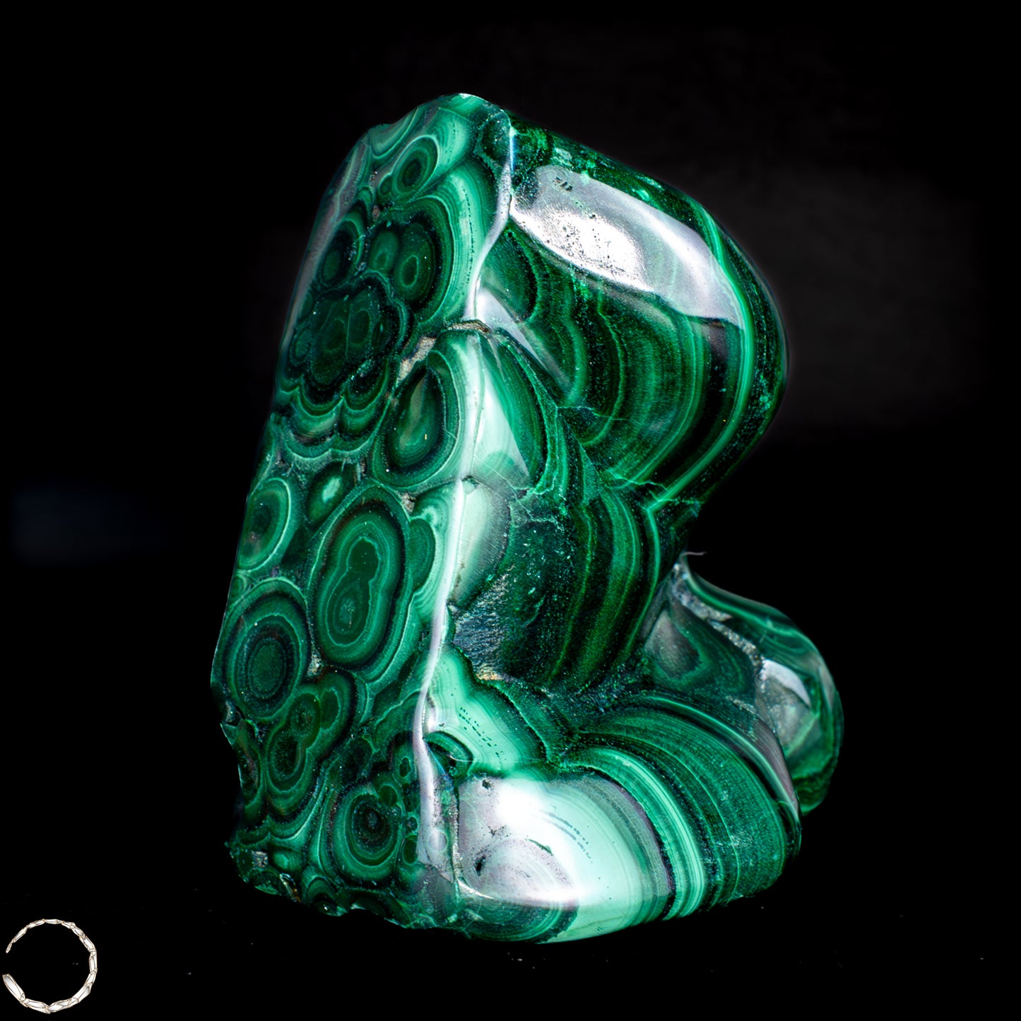 Diese außergewöhnliche Malachit-Politur zeigt das Mineral in seiner vollendeten Form: Mit intensiven Grüntönen, lebhaften Kontrasten und der typischen, konzentrischen Bänderung, die an Jahresringe oder Wellenmuster erinnert.