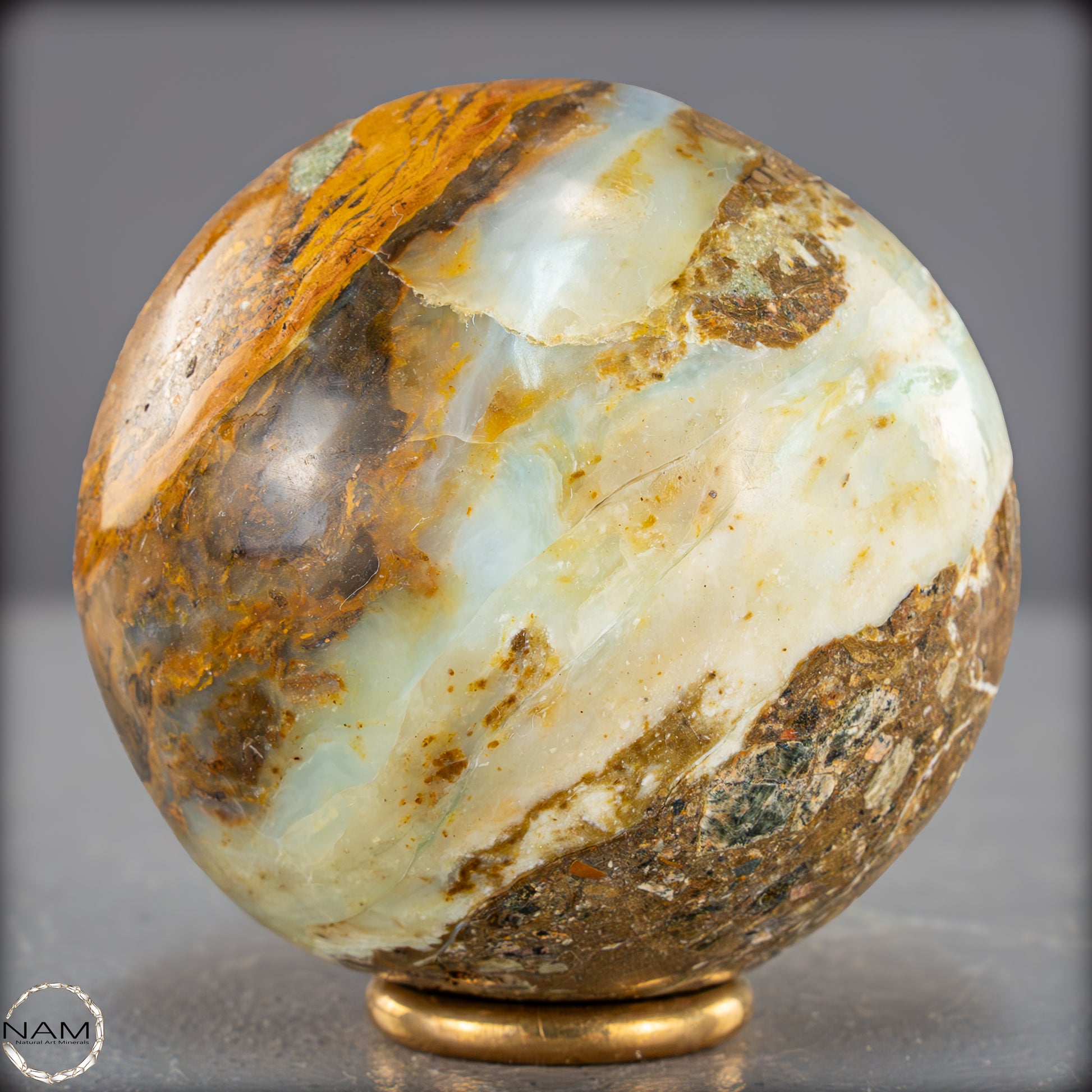 Diese prachtvolle Kugel aus peruanischem Andenopal zeigt ein eindrucksvolles Farbspiel aus zarten Blau- und Grüntönen, die an tropische Lagunen erinnern, durchzogen von erdigen Braun- und Ockerbereichen. Die kontrastreiche Kombination aus transluzenten Opalzonen und rustikalen Gesteinseinschlüssen verleiht dem Stück eine unverwechselbare, organische Schönheit.