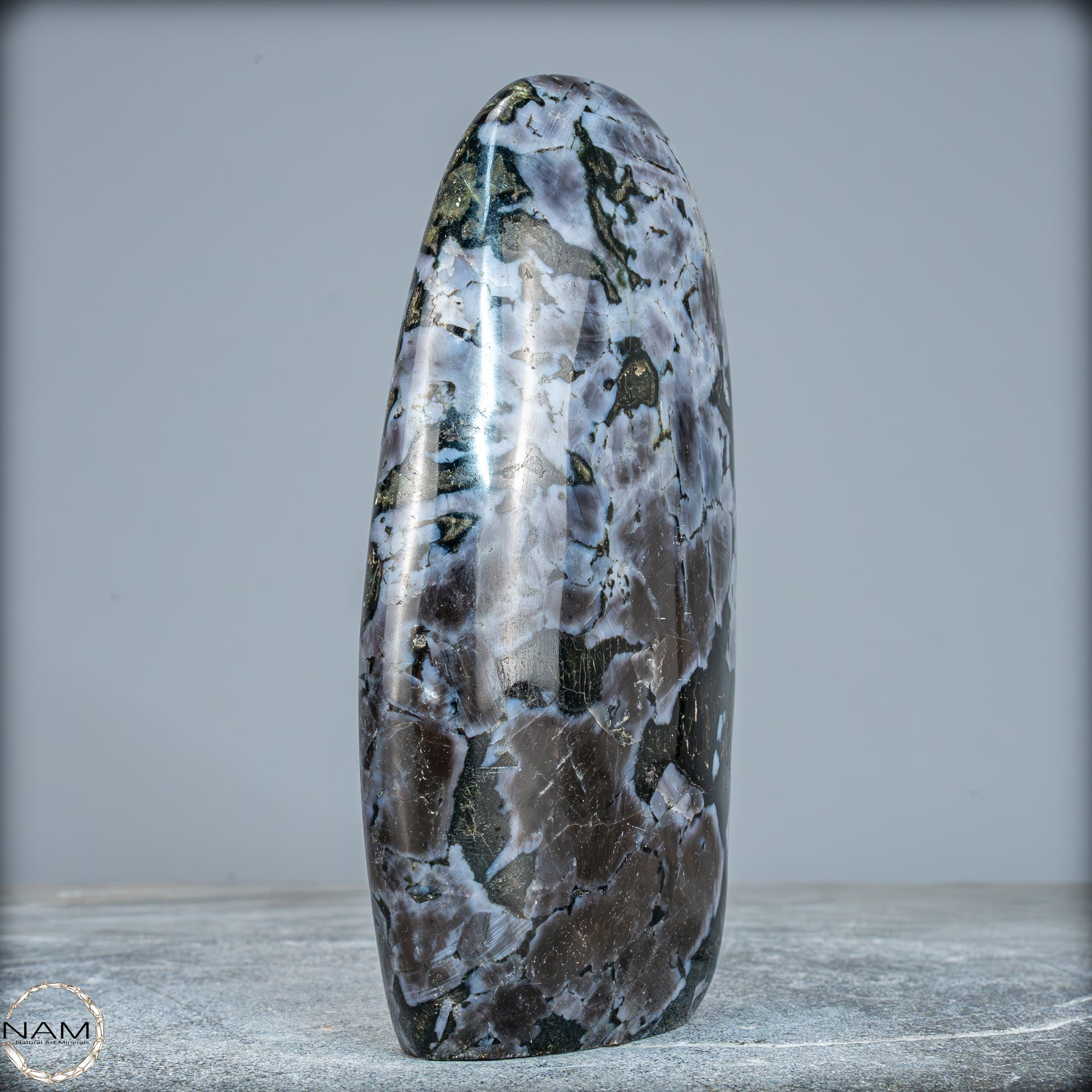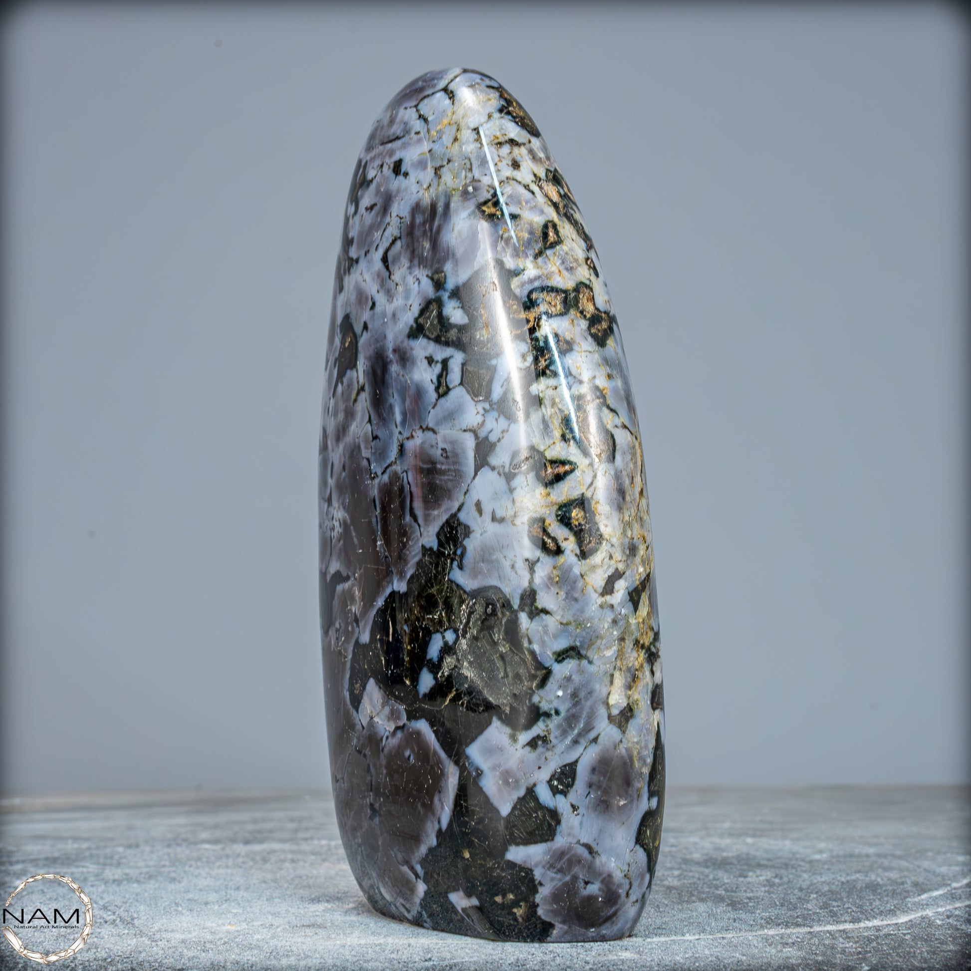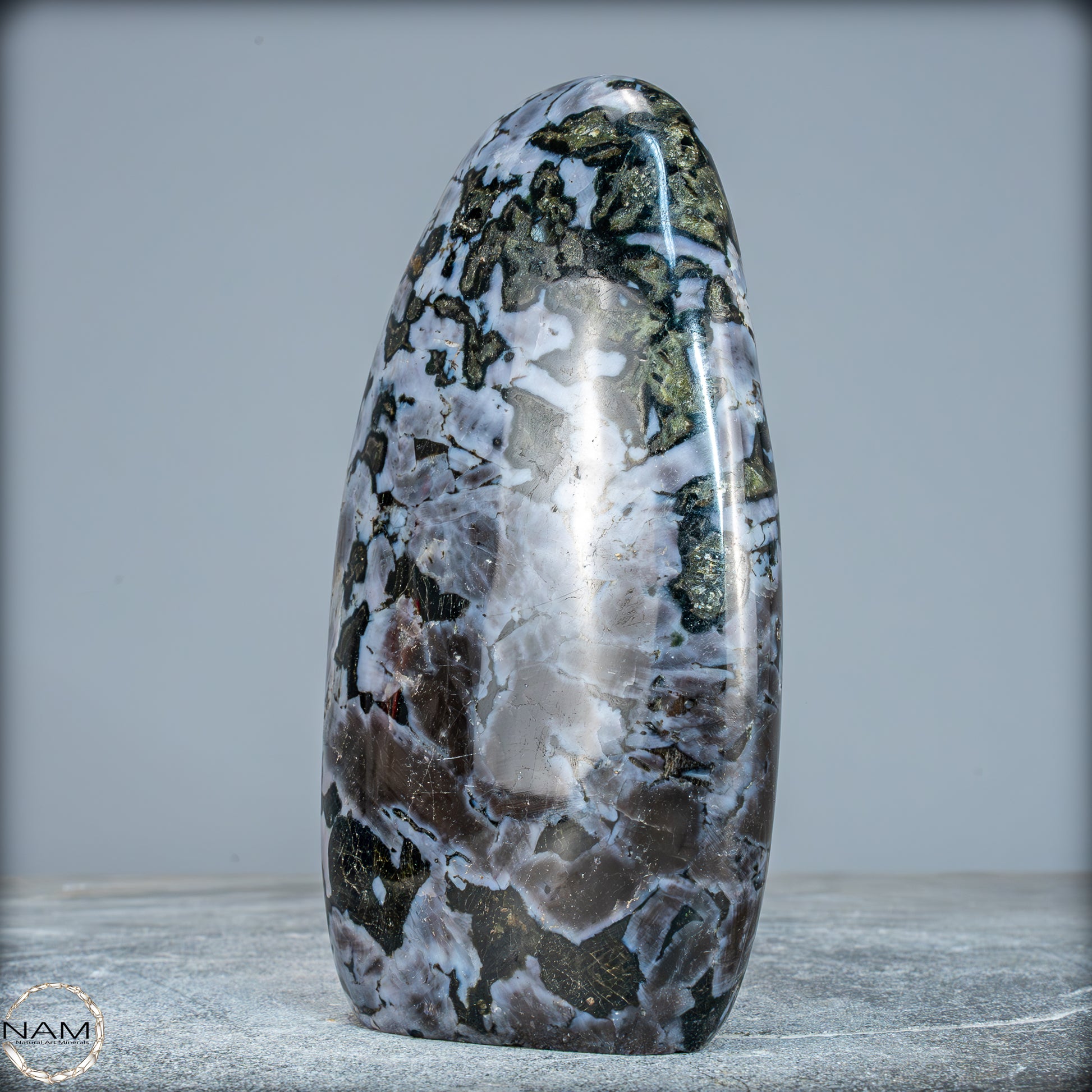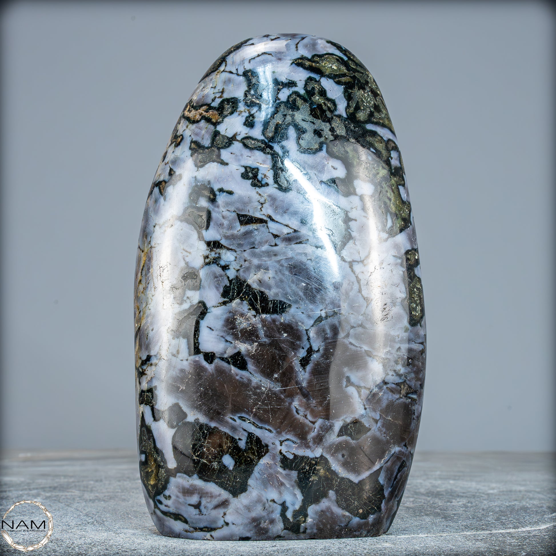 Diese außergewöhnliche Freiform aus Merlinit beeindruckt durch ihre kontrastreiche Farbvielfalt aus tiefem Schwarz, rauchigem Violett, milchigem Weiß und schiefergrauen Nuancen. Dunkle Adern und wolkige Strukturen durchziehen das gesamte Stück und erzeugen eine fast mystisch wirkende Tiefenwirkung. Einzelne Zonen erscheinen wie zerschmolzene Tinte auf hellem Papier – ein faszinierendes Spiel aus Licht und Schatten.