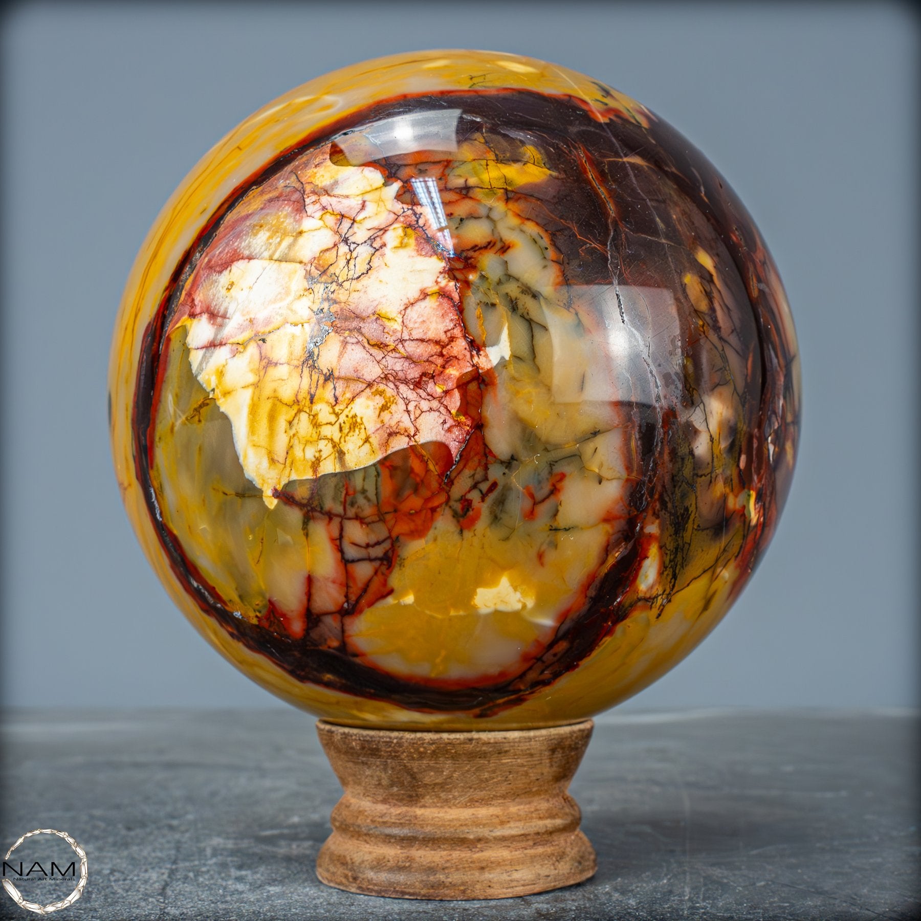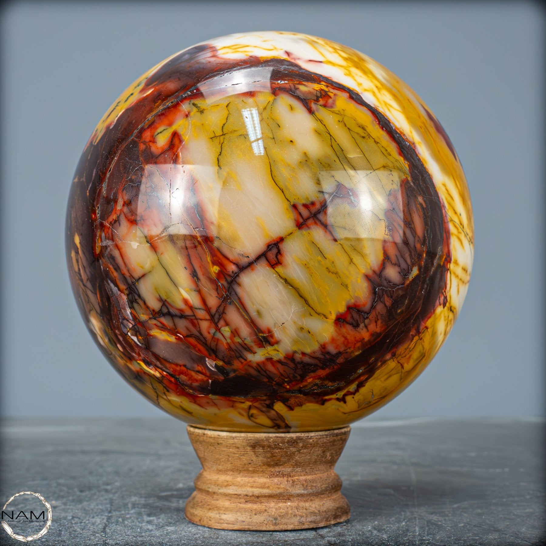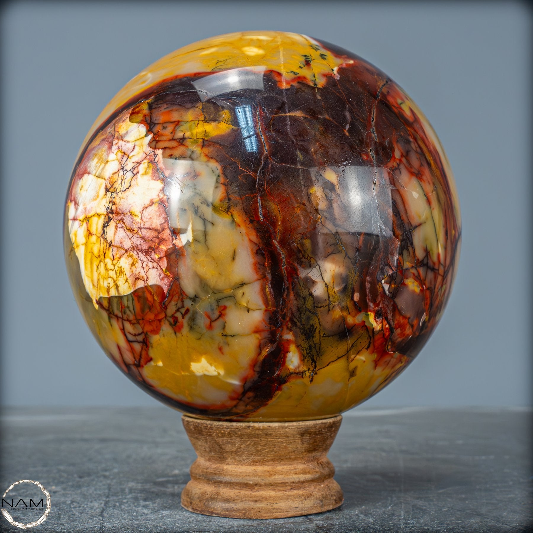 Diese prachtvolle Mookait-Kugel vereint die volle Schönheit und Tiefe der Natur in einem einzigen, kunstvoll geschliffenen Kristall. Mit ihren intensiven Farben – von leuchtendem Gelb über warmes Ocker bis hin zu tiefem Rot und sattem Braun – erinnert sie an die unendlichen Landschaften Australiens, dem Ursprungsort dieses außergewöhnlichen Steins. Jede Ader, jede feine Zeichnung in der Oberfläche erzählt von Jahrmillionen der Erdgeschichte und macht diese Kugel zu einem einzigartigen Naturkunstwerk.