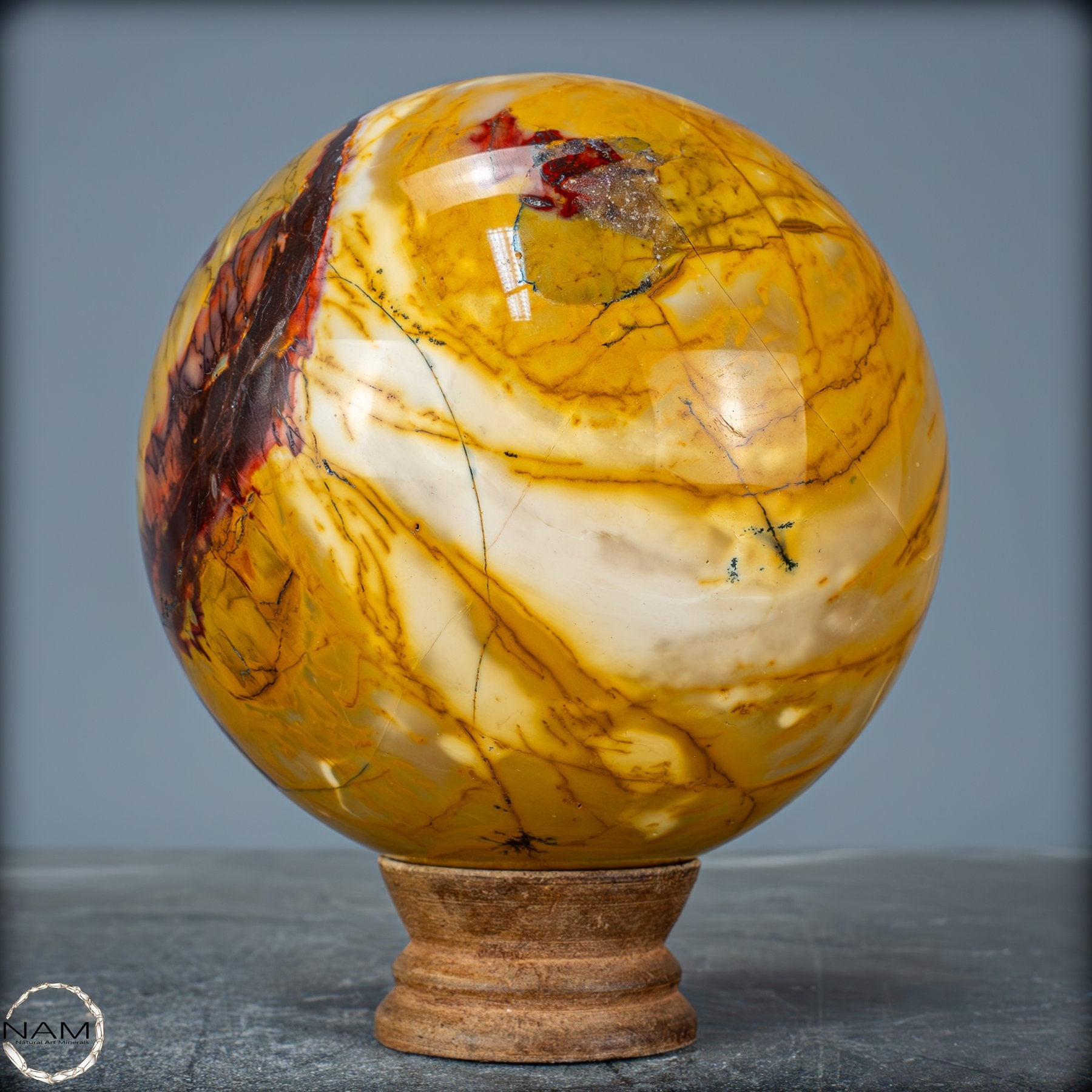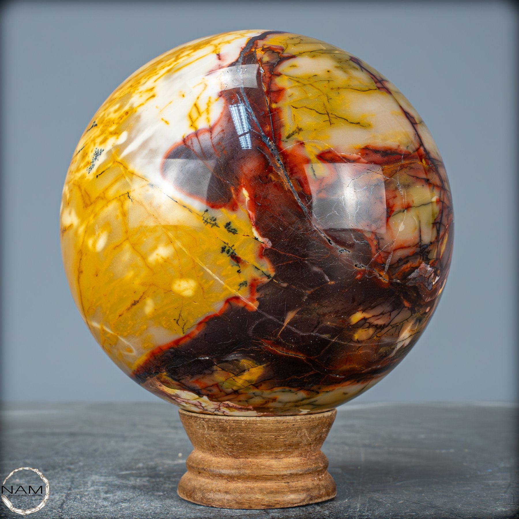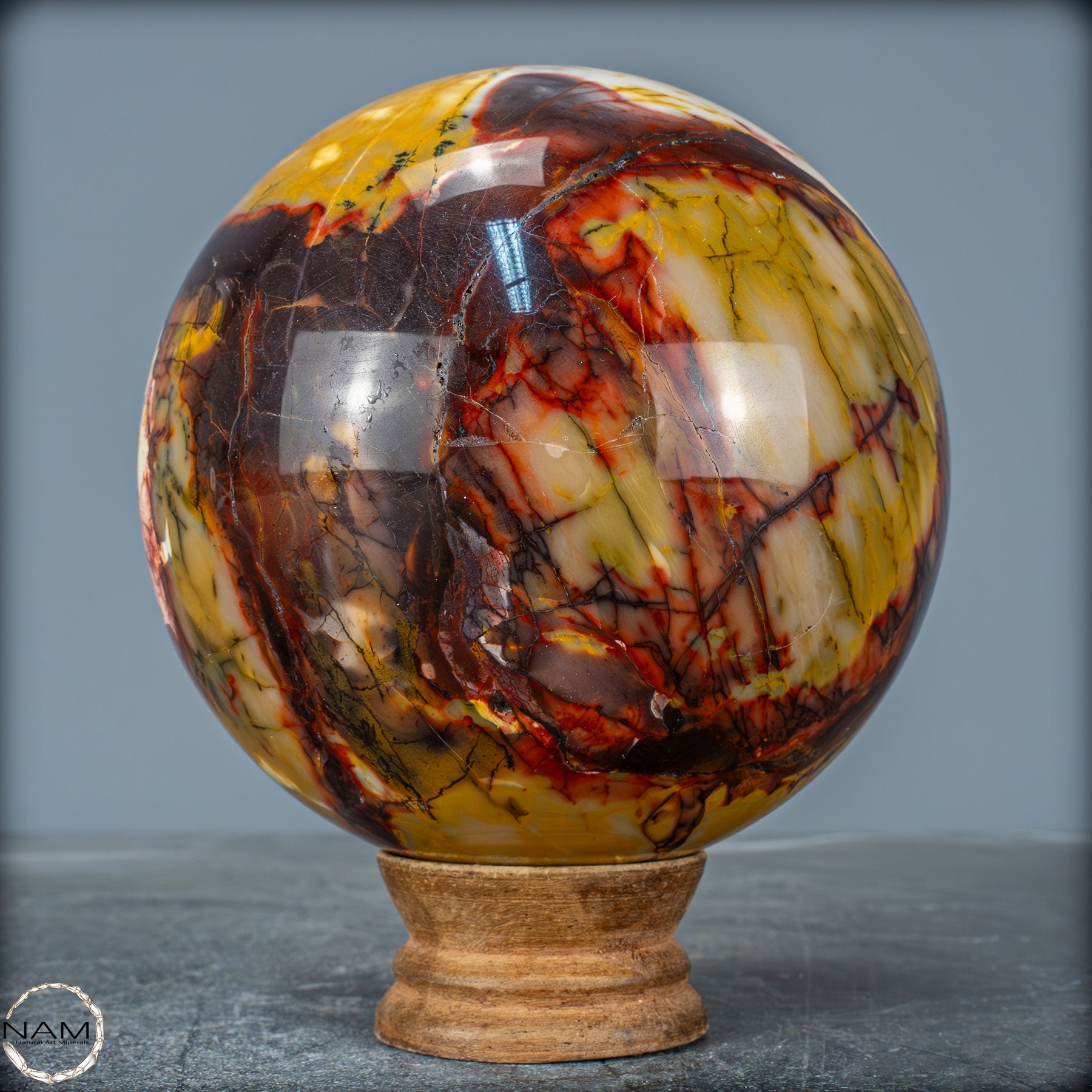 Diese prachtvolle Mookait-Kugel vereint die volle Schönheit und Tiefe der Natur in einem einzigen, kunstvoll geschliffenen Kristall. Mit ihren intensiven Farben – von leuchtendem Gelb über warmes Ocker bis hin zu tiefem Rot und sattem Braun – erinnert sie an die unendlichen Landschaften Australiens, dem Ursprungsort dieses außergewöhnlichen Steins. Jede Ader, jede feine Zeichnung in der Oberfläche erzählt von Jahrmillionen der Erdgeschichte und macht diese Kugel zu einem einzigartigen Naturkunstwerk.
