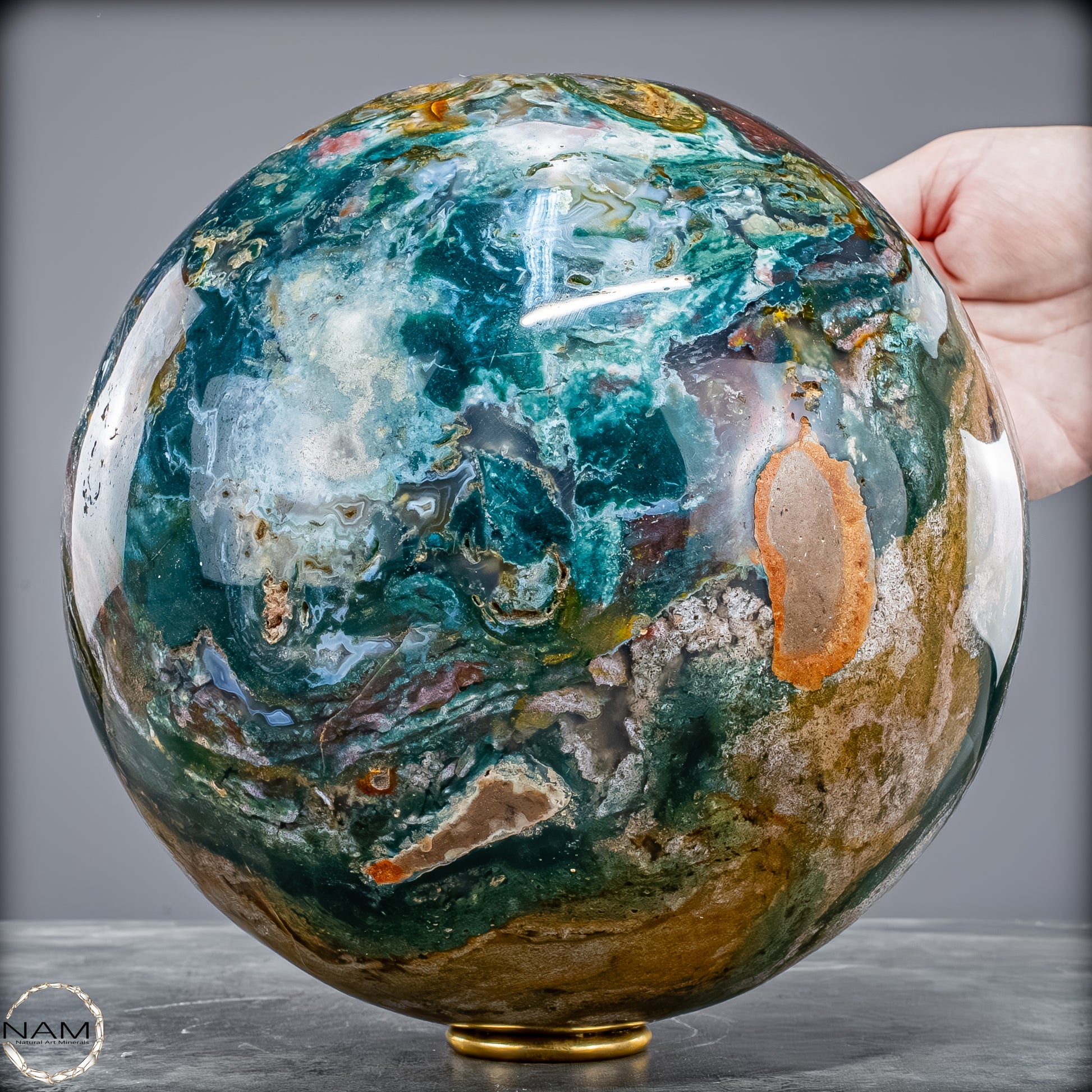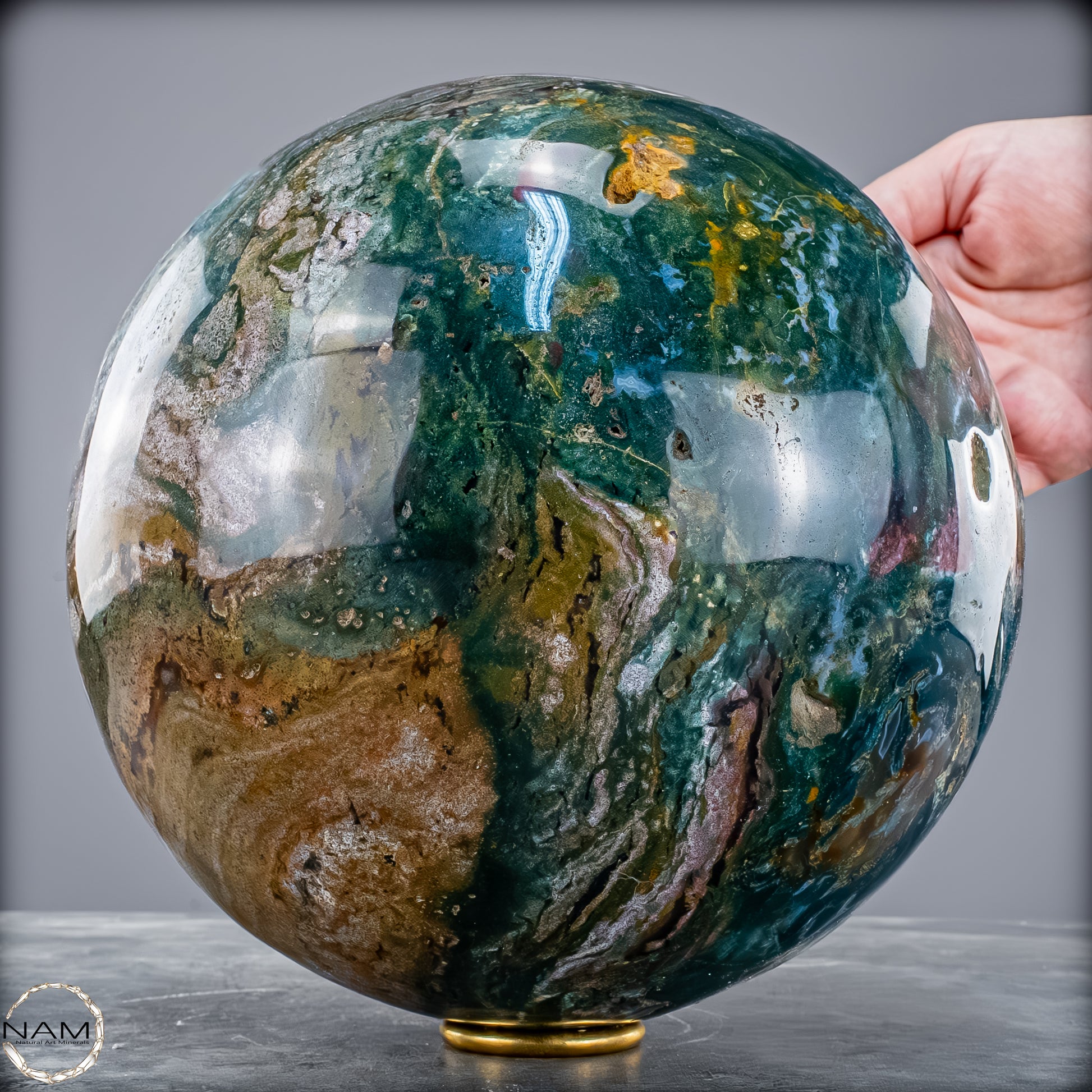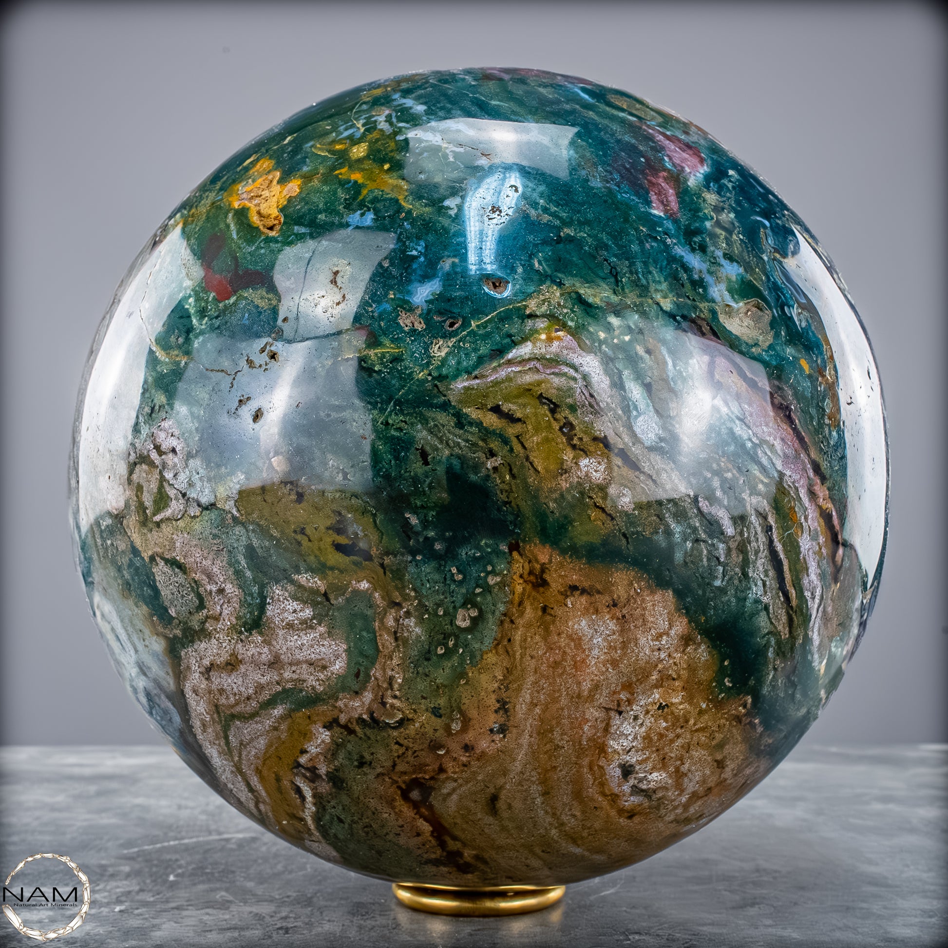 Diese atemberaubende Ocean Jasper Kugel mit einem Gewicht von 10 Kilogramm ist ein echtes Naturkunstwerk – kraftvoll, lebendig und harmonisch zugleich. Die Kugel zeigt ein beeindruckendes Zusammenspiel aus tiefem Meeresgrün, sanftem Blau, erdigem Braun und goldenen Akzenten, das an Küstenlandschaften erinnert, in denen Land und Meer ineinander übergehen.
