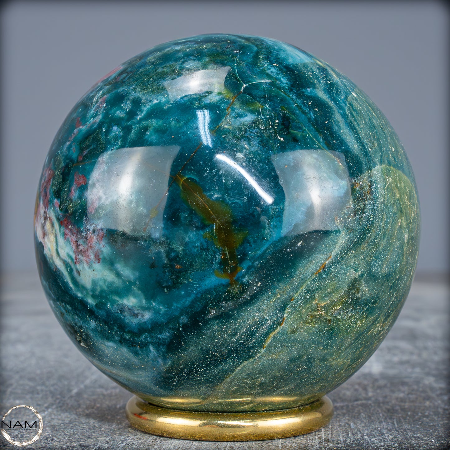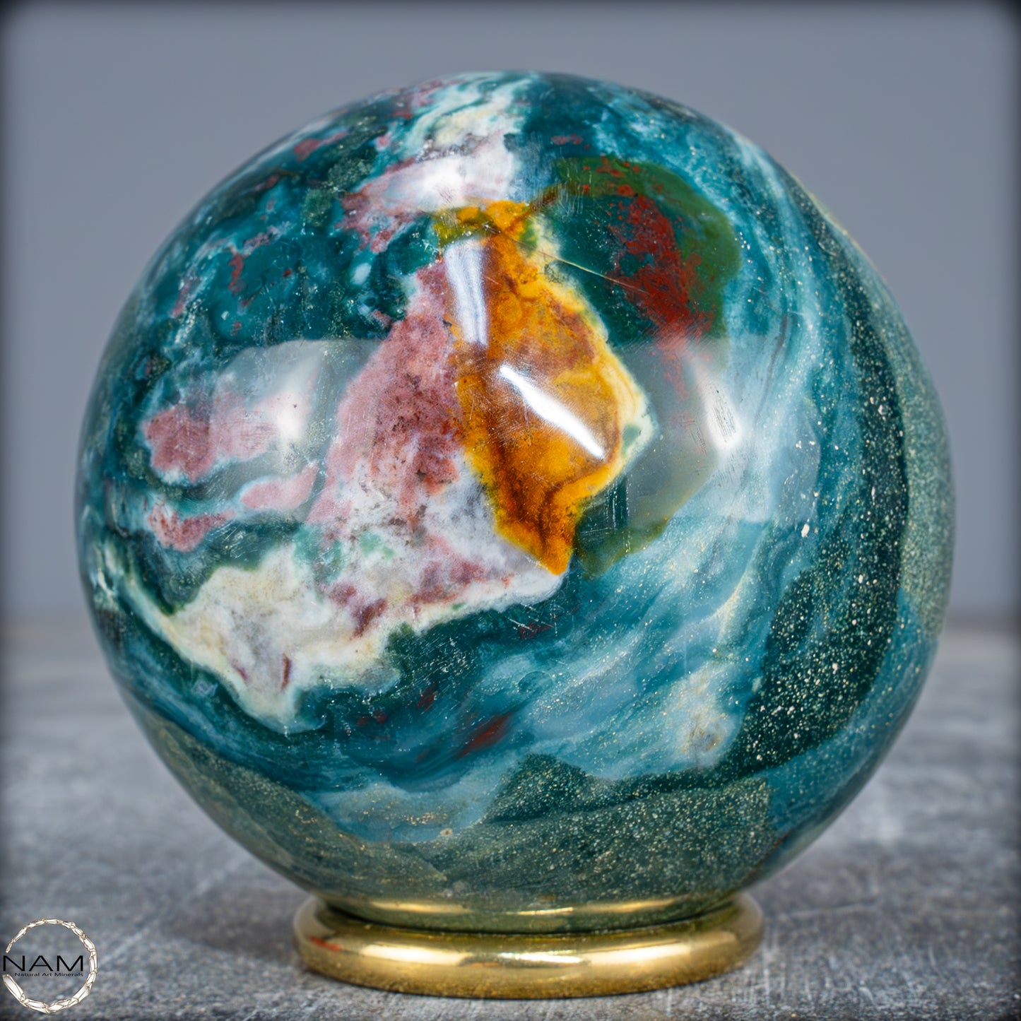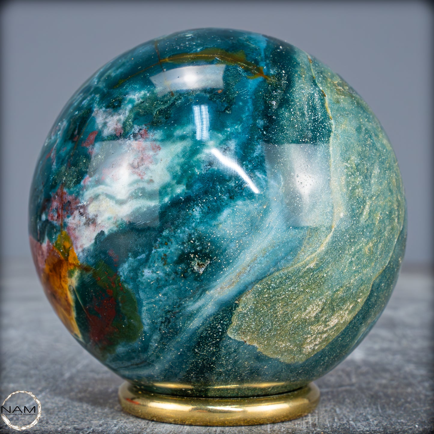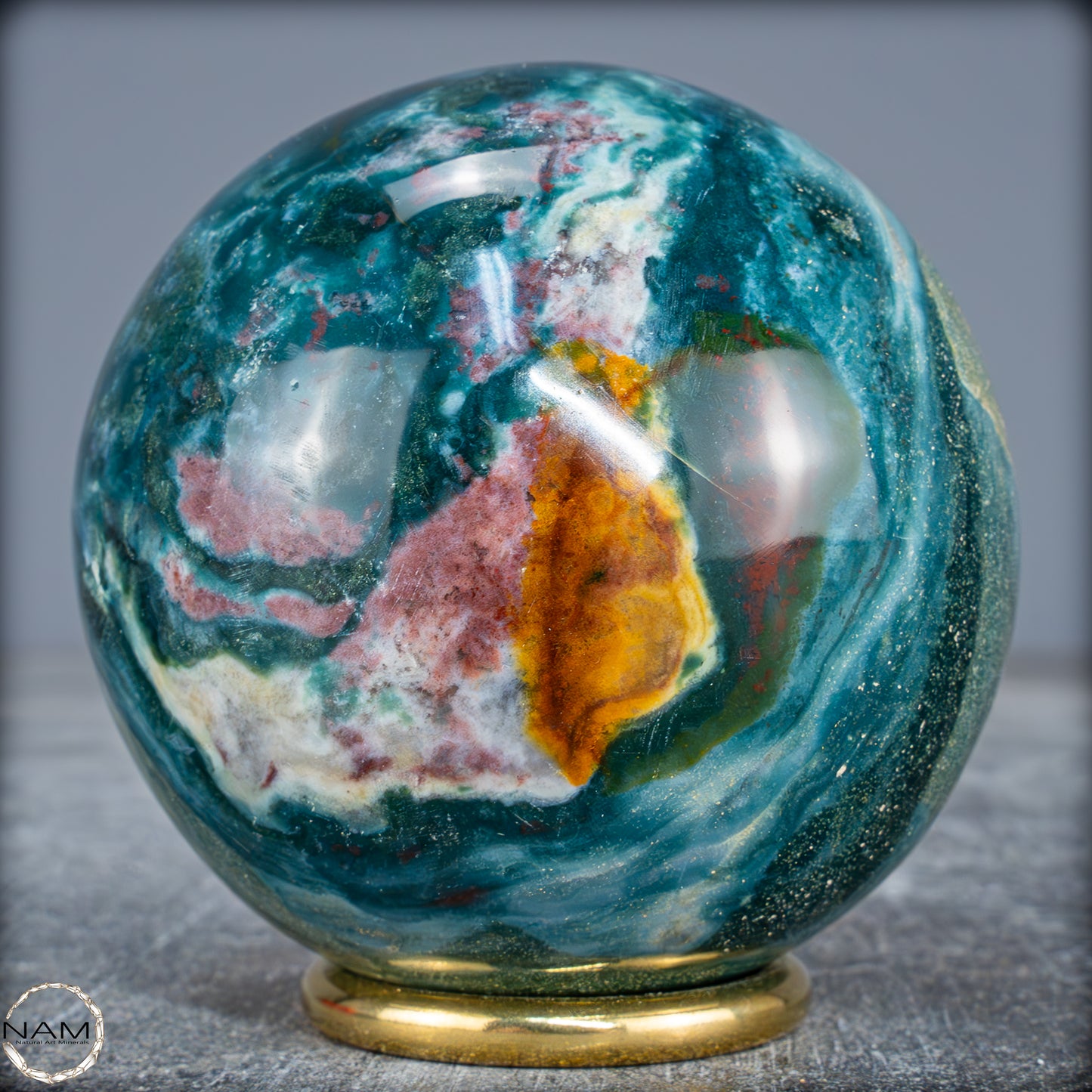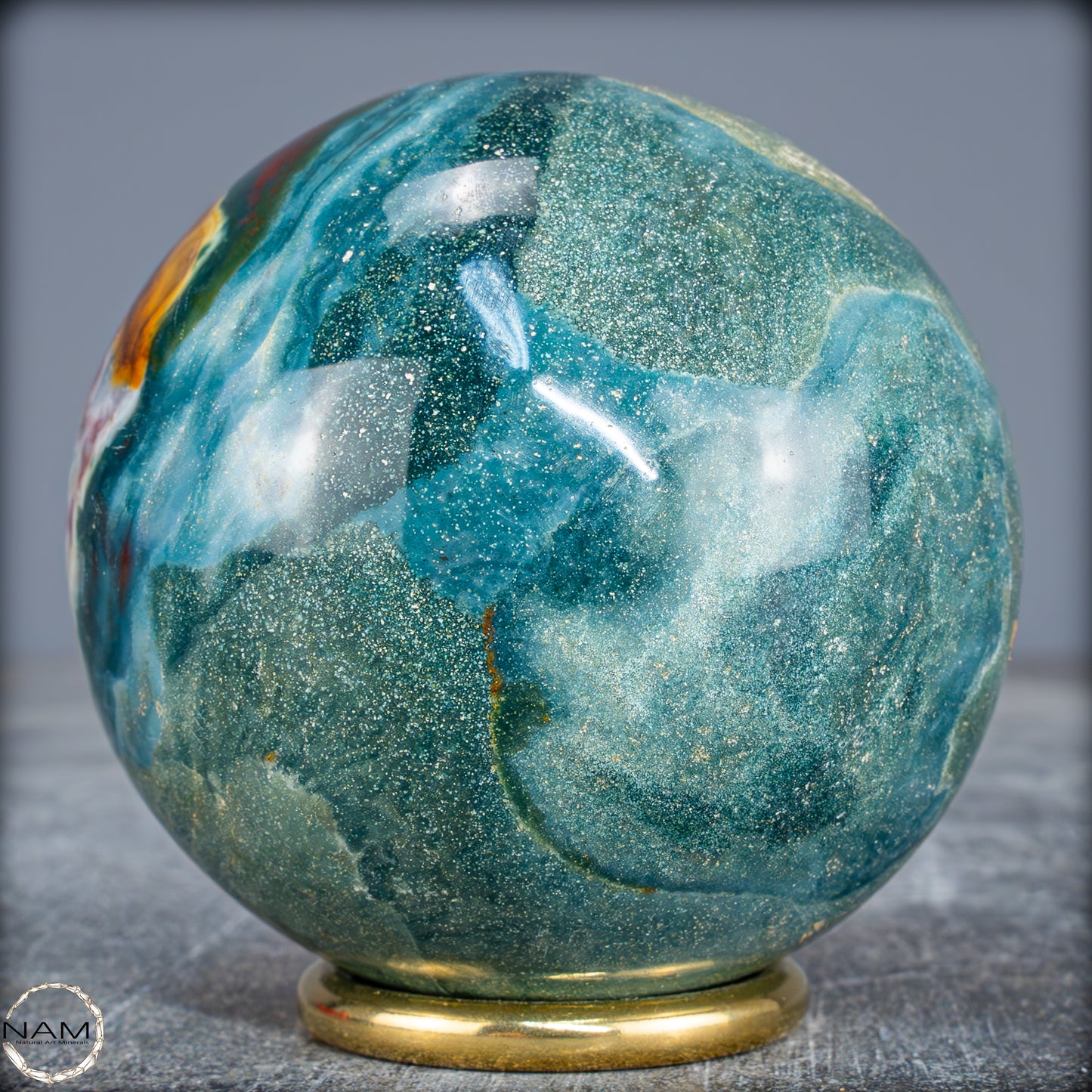 Die fein kristallinen Strukturen im Inneren verleihen der Kugel Tiefe und ein sanftes Glitzern, das sich je nach Lichteinfall subtil verändert. Ocean Jasper ist bekannt für seine beruhigende und ausgleichende Wirkung – er soll dabei helfen, innere Spannungen zu lösen und ein Gefühl von Stabilität und Klarheit zu fördern.