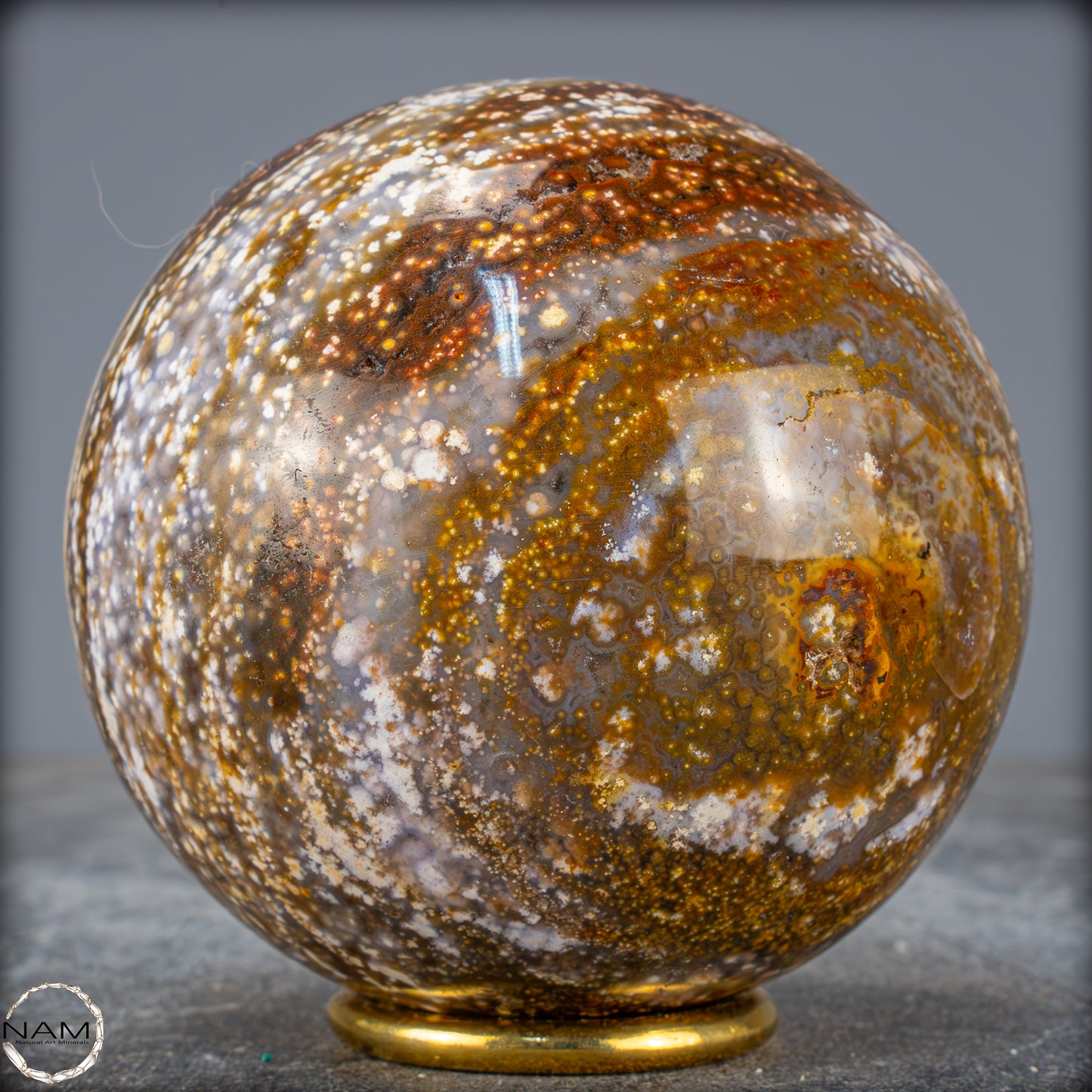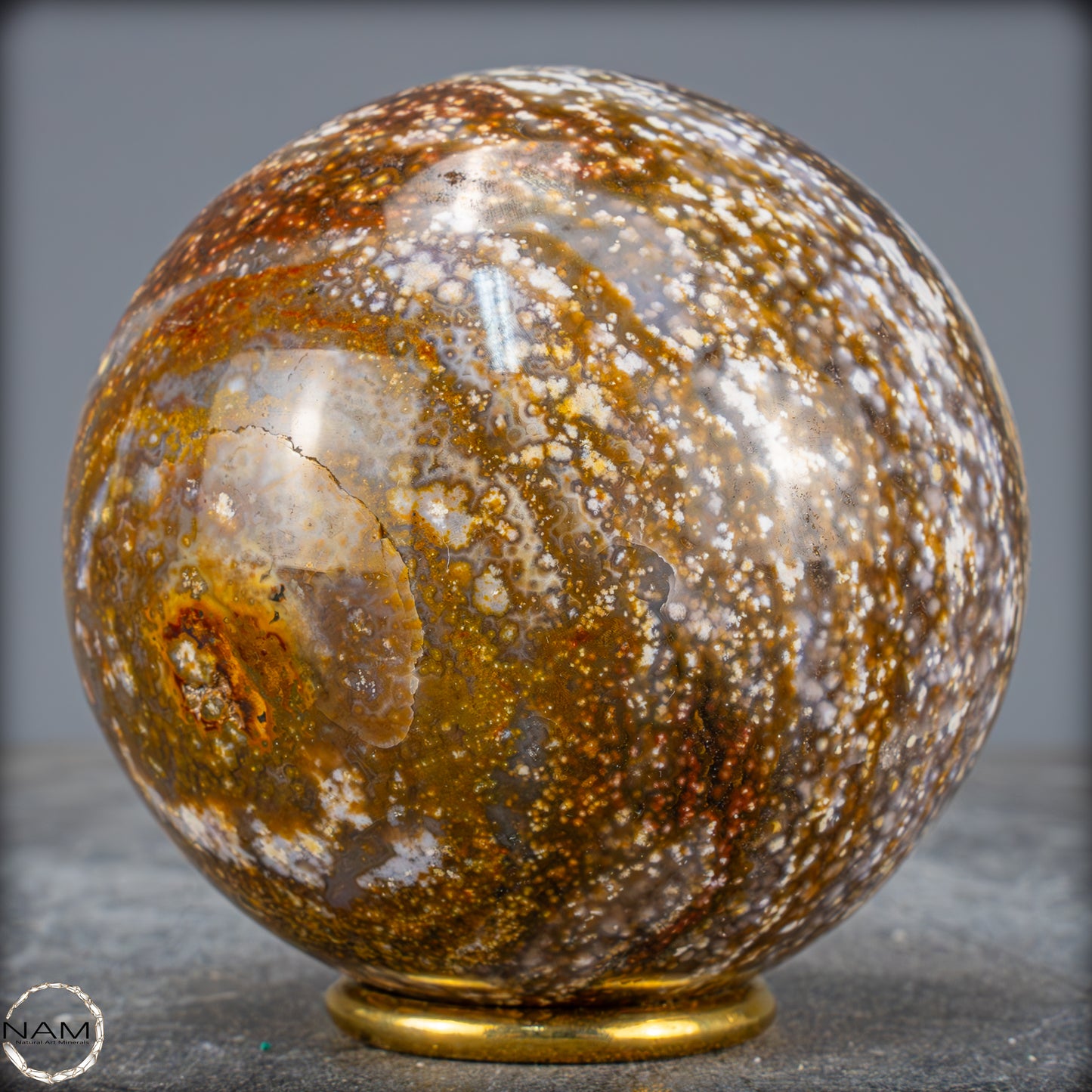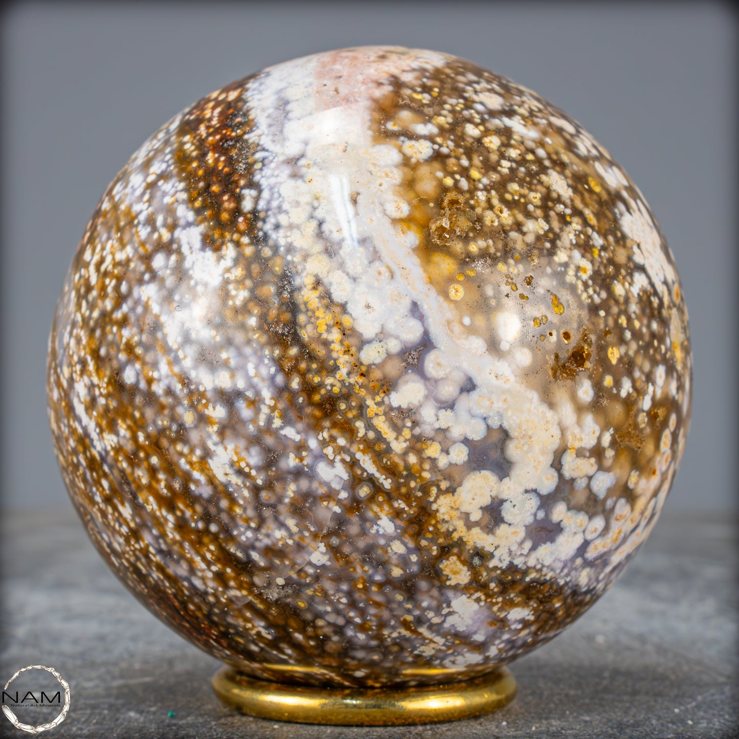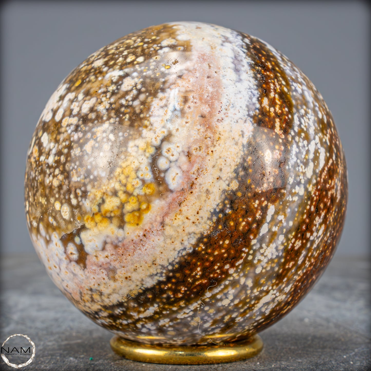 Diese außergewöhnliche Kugel aus Ocean Jasper aus Madagaskar fasziniert durch ihre reiche Musterung in warmen Braun- und Beigetönen, durchzogen von cremeweißen und gelblichen Tupfen und Adern. Die feinen, organisch wirkenden Strukturen erinnern an mikroskopische Korallenformationen oder sprenkelnde Sternenfelder und verleihen der Kugel eine beinahe galaktische Anmutung. Besonders bemerkenswert ist der harmonische Wechsel zwischen hellen, durchscheinenden Bereichen und dichter gezeichneten, fast schimmernden Zonen, die dem Stück Tiefe und Charakter verleihen. Ein wirkungsvolles Sammlerobjekt und dekorativer Blickfang mit natürlicher Raffinesse.