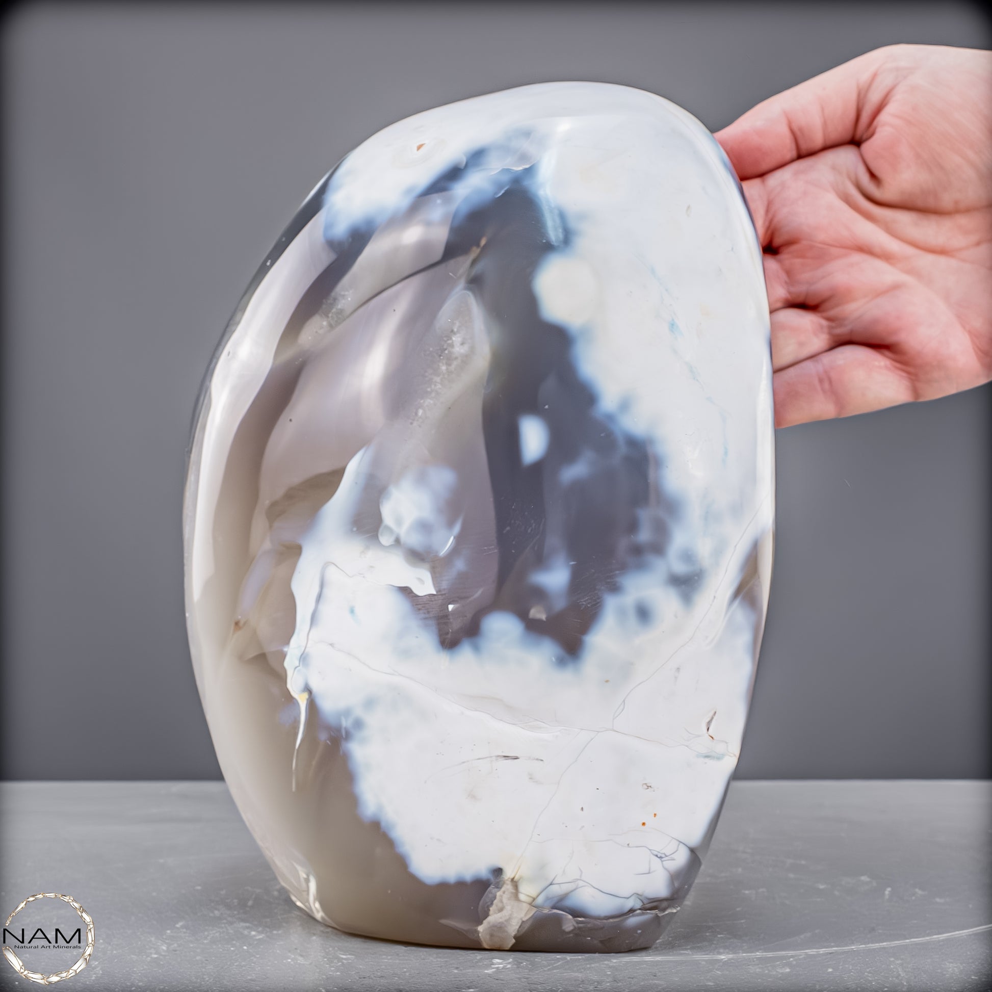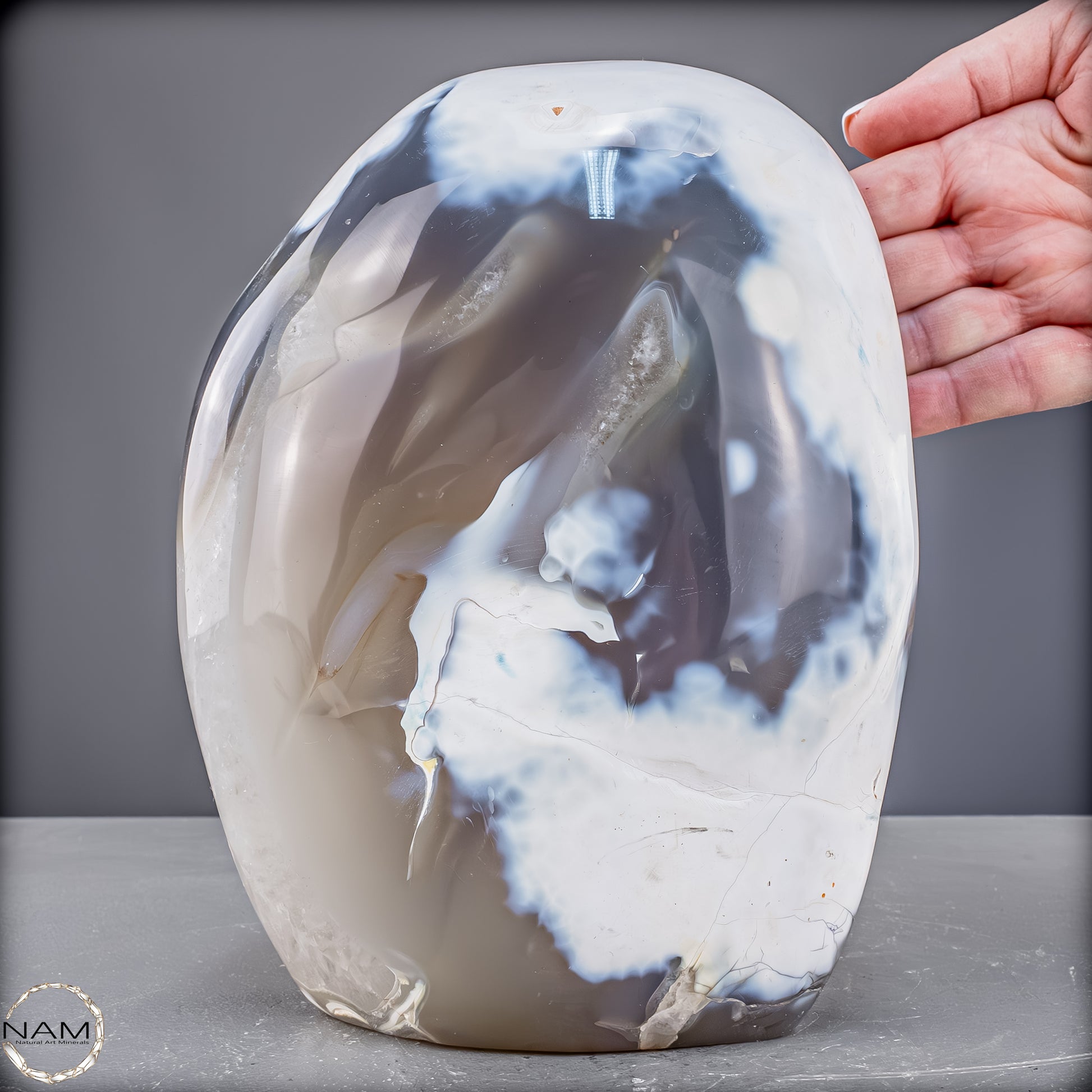 Diese wunderschöne Freiform aus Orca-Achat besticht durch ihre charakteristischen Kontraste in tiefem Schwarz, rauchigem Grau und sanftem Weiß. Besonders auffällig ist das markante Bänderungsmuster im Zentrum, das an die stilisierte Zeichnung eines Orcawals erinnert – daher auch der Name dieses besonderen Steins. Die sanft polierte Oberfläche bringt die fließenden Übergänge und natürlichen Strukturen eindrucksvoll zur Geltung und verleiht dem Stück eine schnell flüssige, bewegte Optik. Orca-Achat ist nicht nur ein optischer Hingucker, sondern auch ein faszinierendes Mineral mit symbolischer Tiefe – perfekt für Sammler*innen oder als elegantes Dekorobjekt.