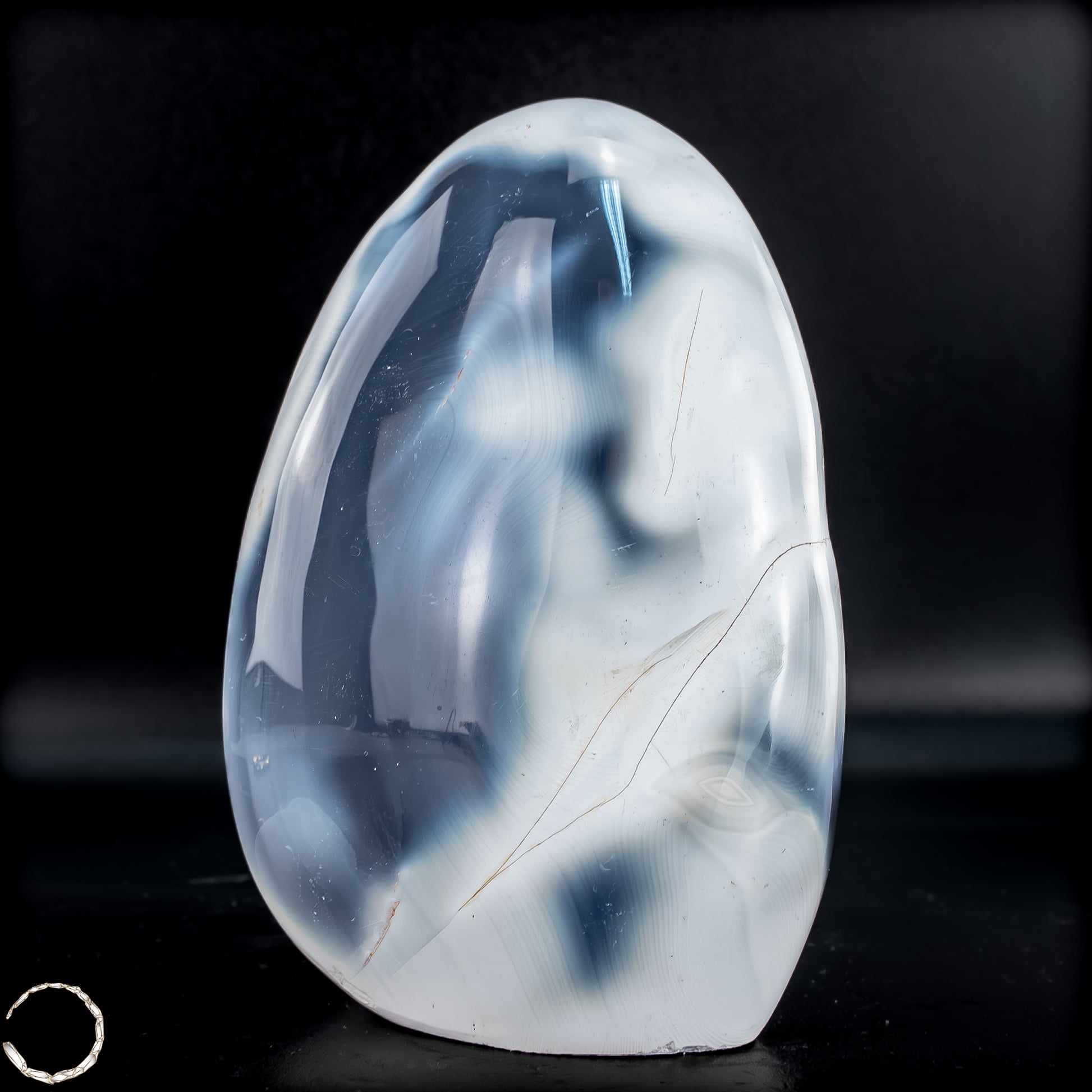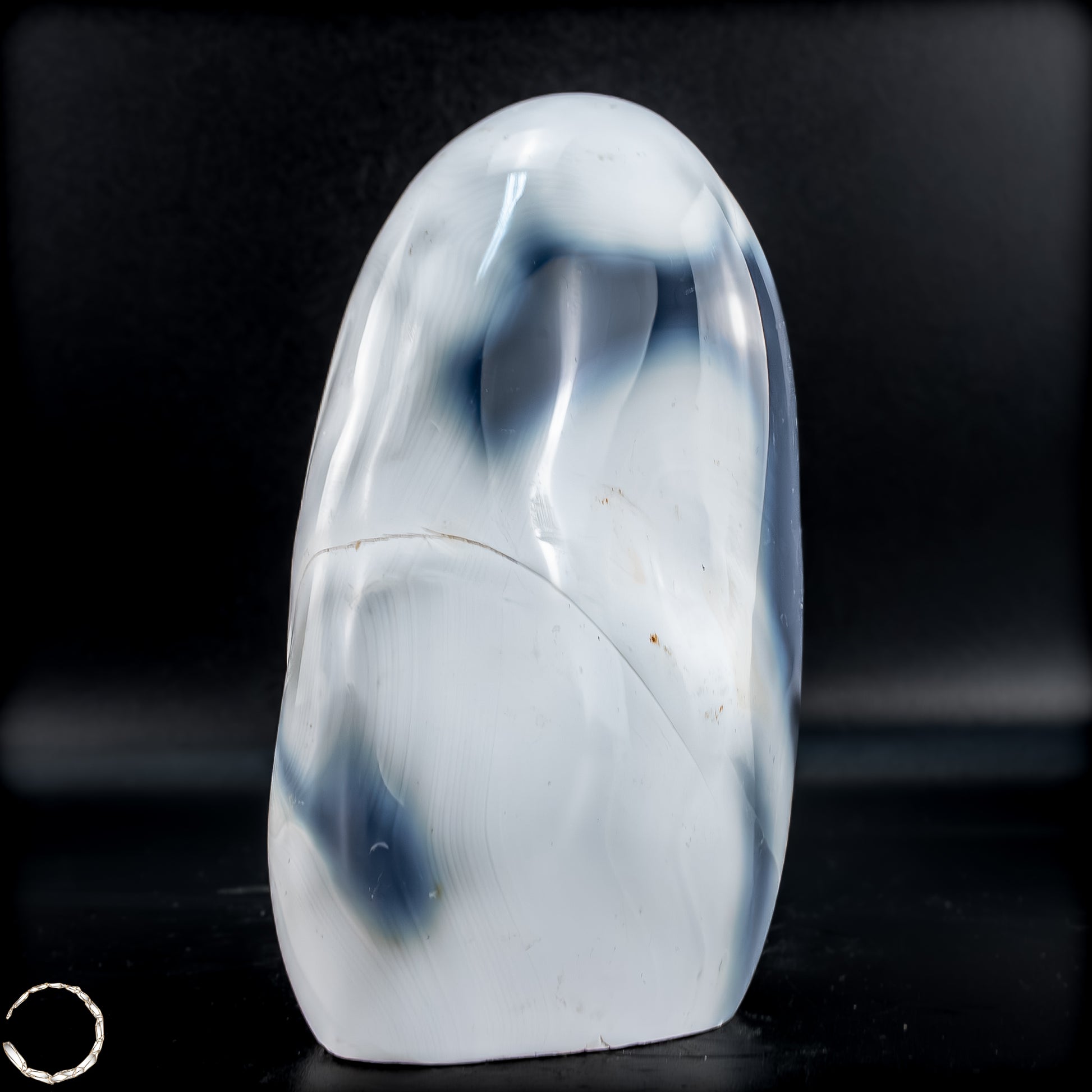 Diese wunderschöne Freiform aus Orca-Achat besticht durch ihre charakteristischen Kontraste in tiefem Schwarz, rauchigem Grau und sanftem Weiß. Besonders auffällig ist das markante Bänderungsmuster im Zentrum, das an die stilisierte Zeichnung eines Orcawals erinnert – daher auch der Name dieses besonderen Steins. Die sanft polierte Oberfläche bringt die fließenden Übergänge und natürlichen Strukturen eindrucksvoll zur Geltung und verleiht dem Stück eine schnell flüssige, bewegte Optik. Orca-Achat ist nicht nur ein optischer Hingucker, sondern auch ein faszinierendes Mineral mit symbolischer Tiefe – perfekt für Sammler*innen oder als elegantes Dekorobjekt.