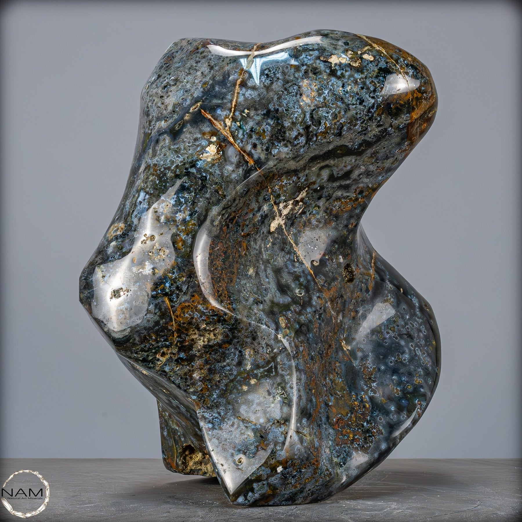 Durch die kunstvolle Freiform-Schlifftechnik erhält der Ocean Achat eine moderne, fließende Silhouette, die perfekt in Wohnräume, Arbeitsbereiche oder spirituelle Umgebungen passt. Dieses außergewöhnliche Stück symbolisiert Ruhe, Tiefe und natürliche Harmonie – ein Ausdruck reiner Erdenergie und zeitloser Schönheit.