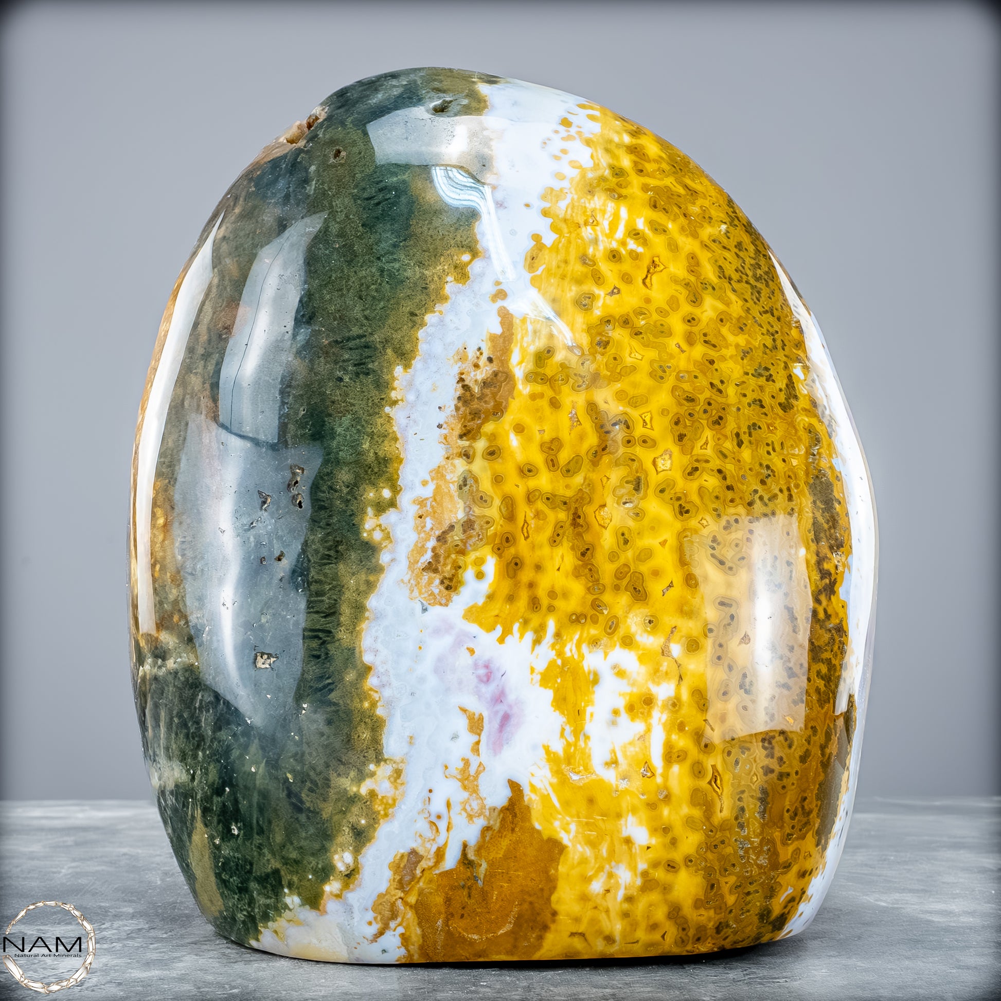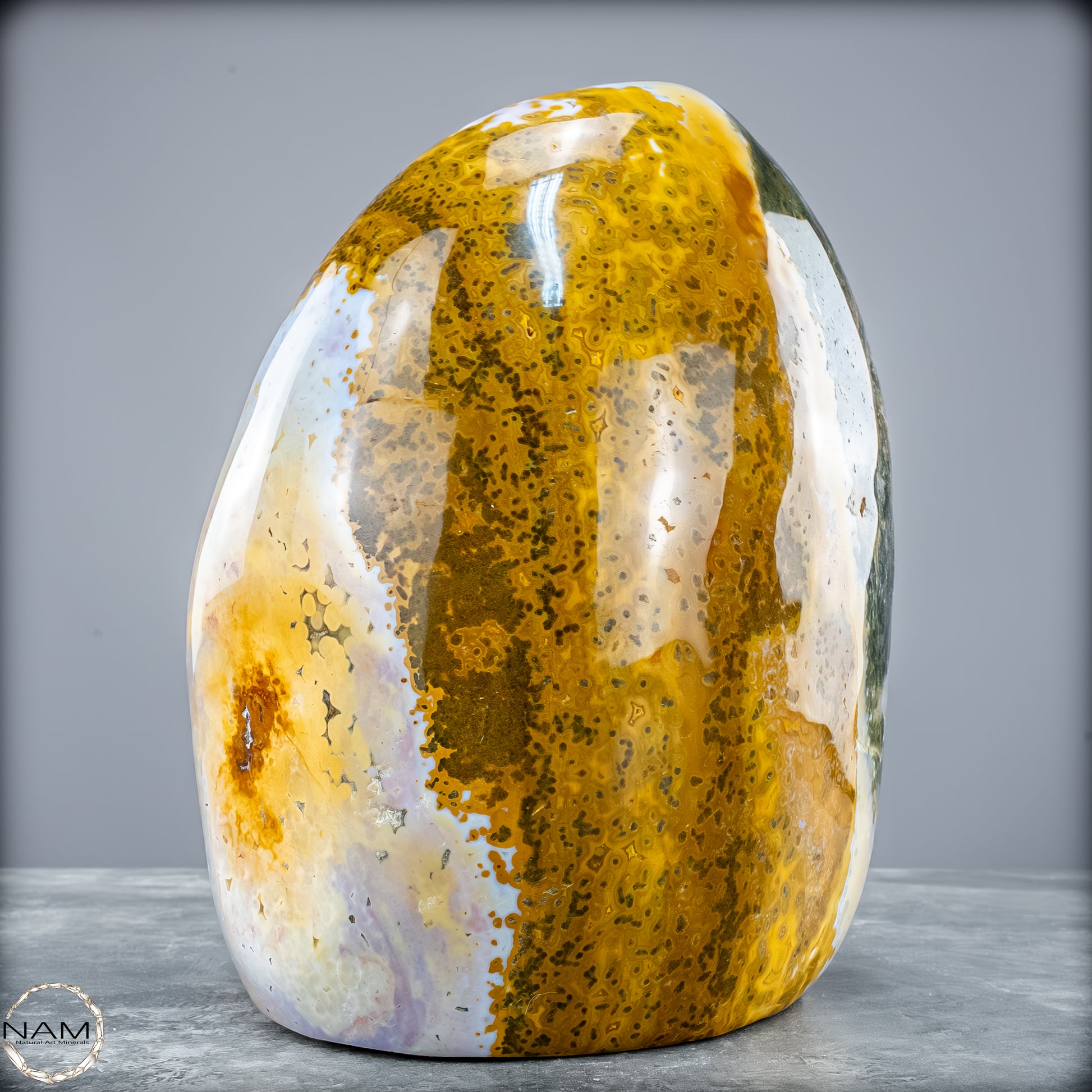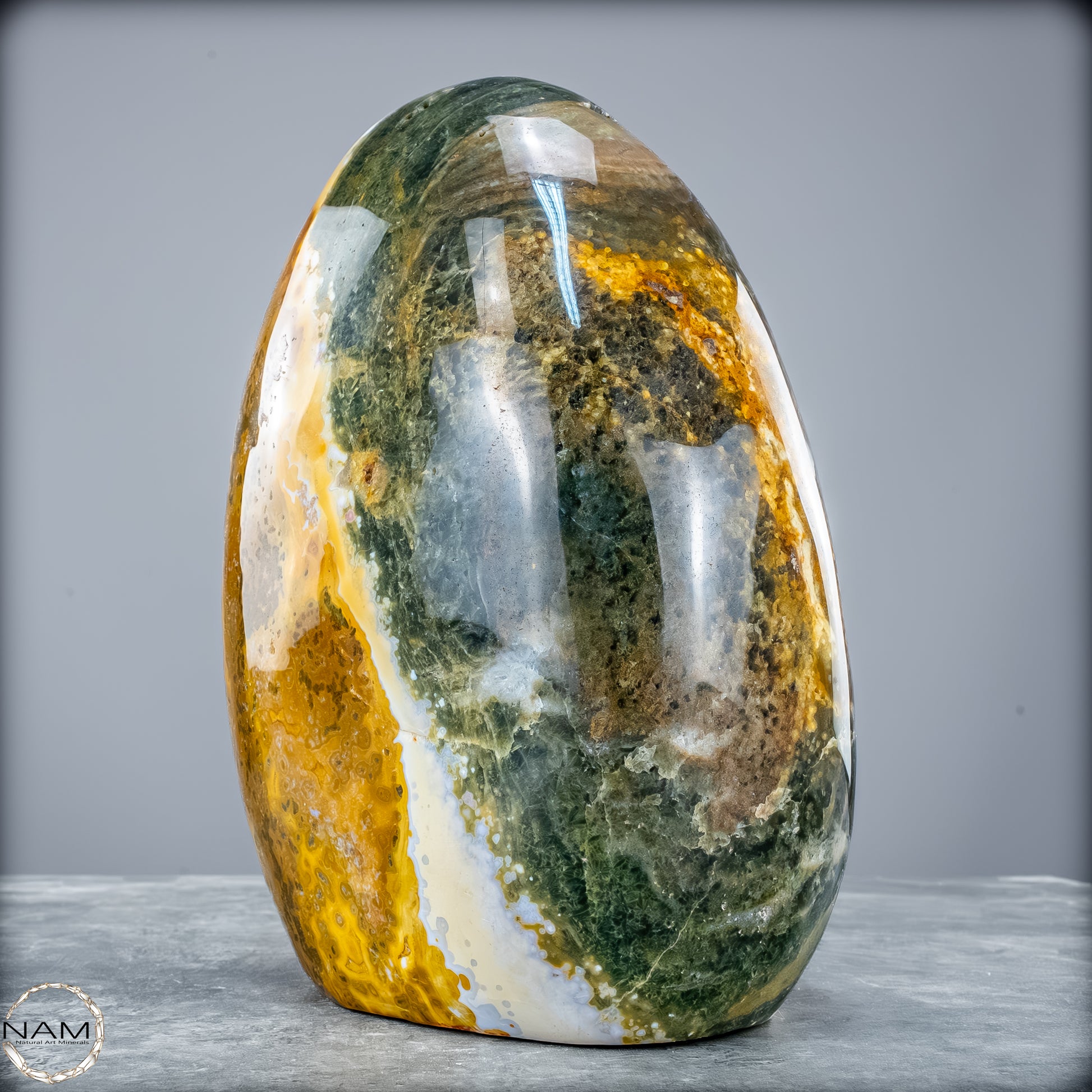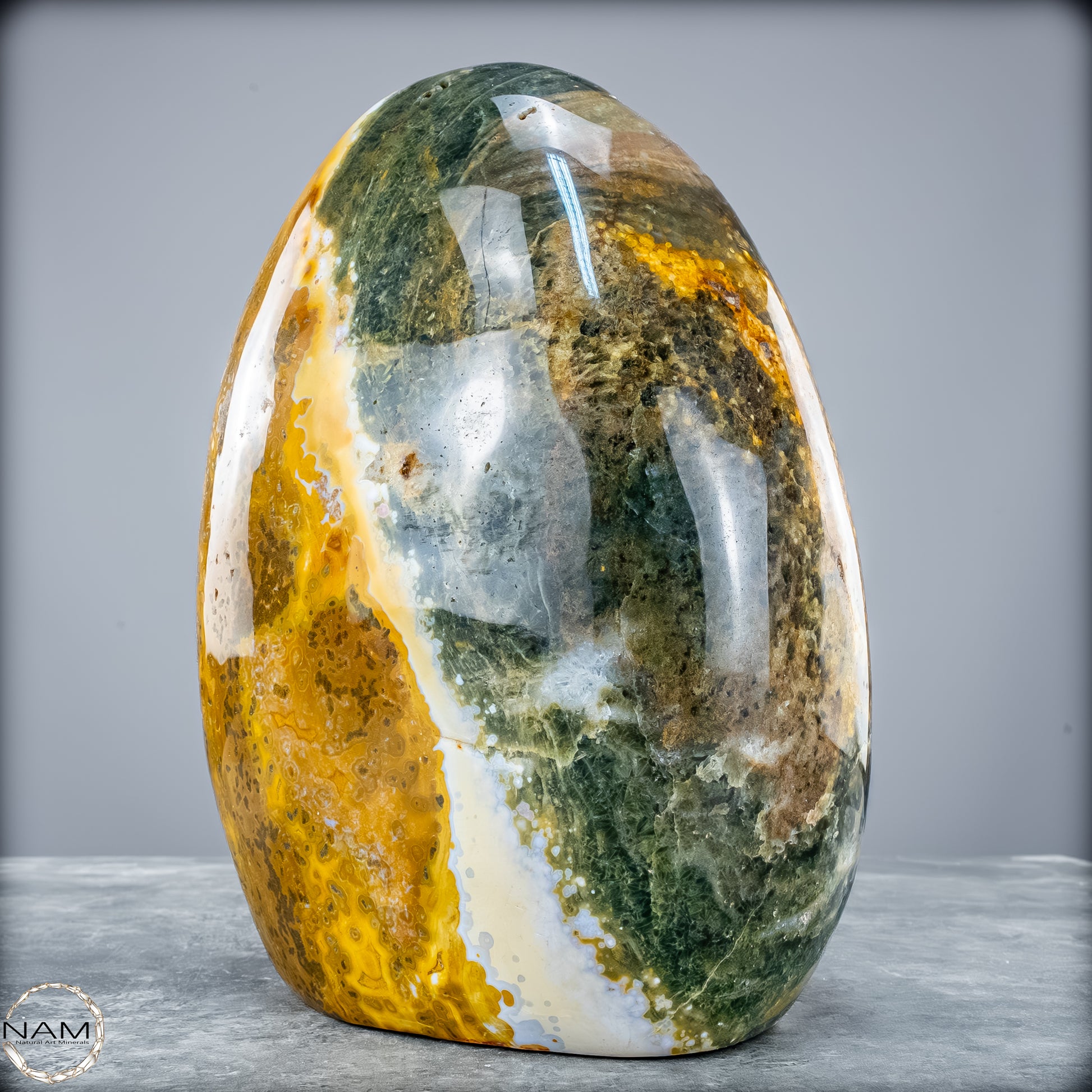 Ocean Jasper gilt als Stein der Freude und des inneren Gleichgewichts. Seine vielfältigen Farben und Muster sollen beruhigend wirken und emotionale Klarheit fördern. Die harmonische Ausstrahlung dieser Freiform macht sie nicht nur zu einem einzigartigen Blickfang, sondern auch zu einem inspirierenden Begleiter in jedem Raum.