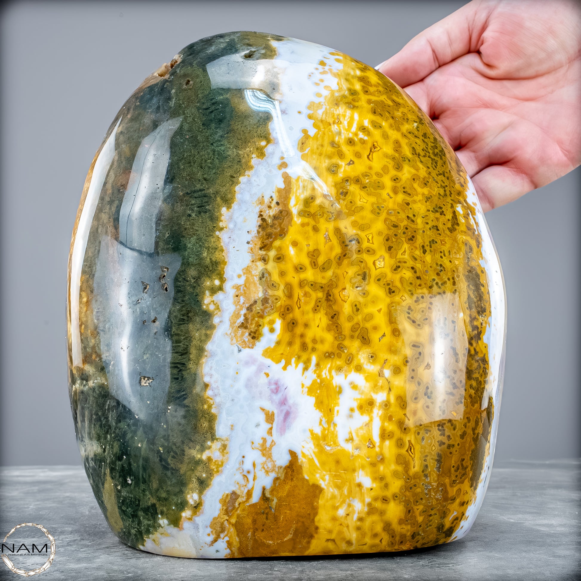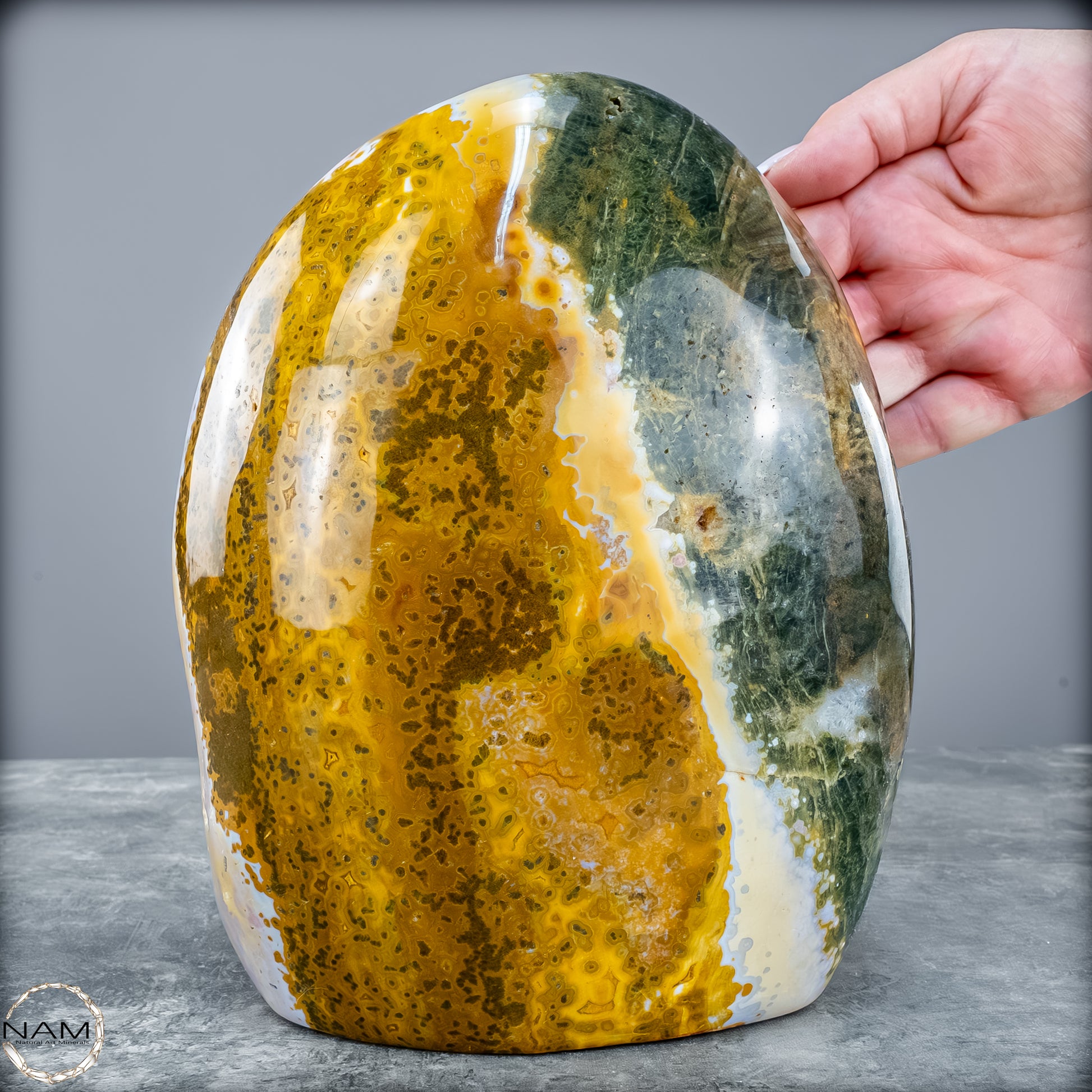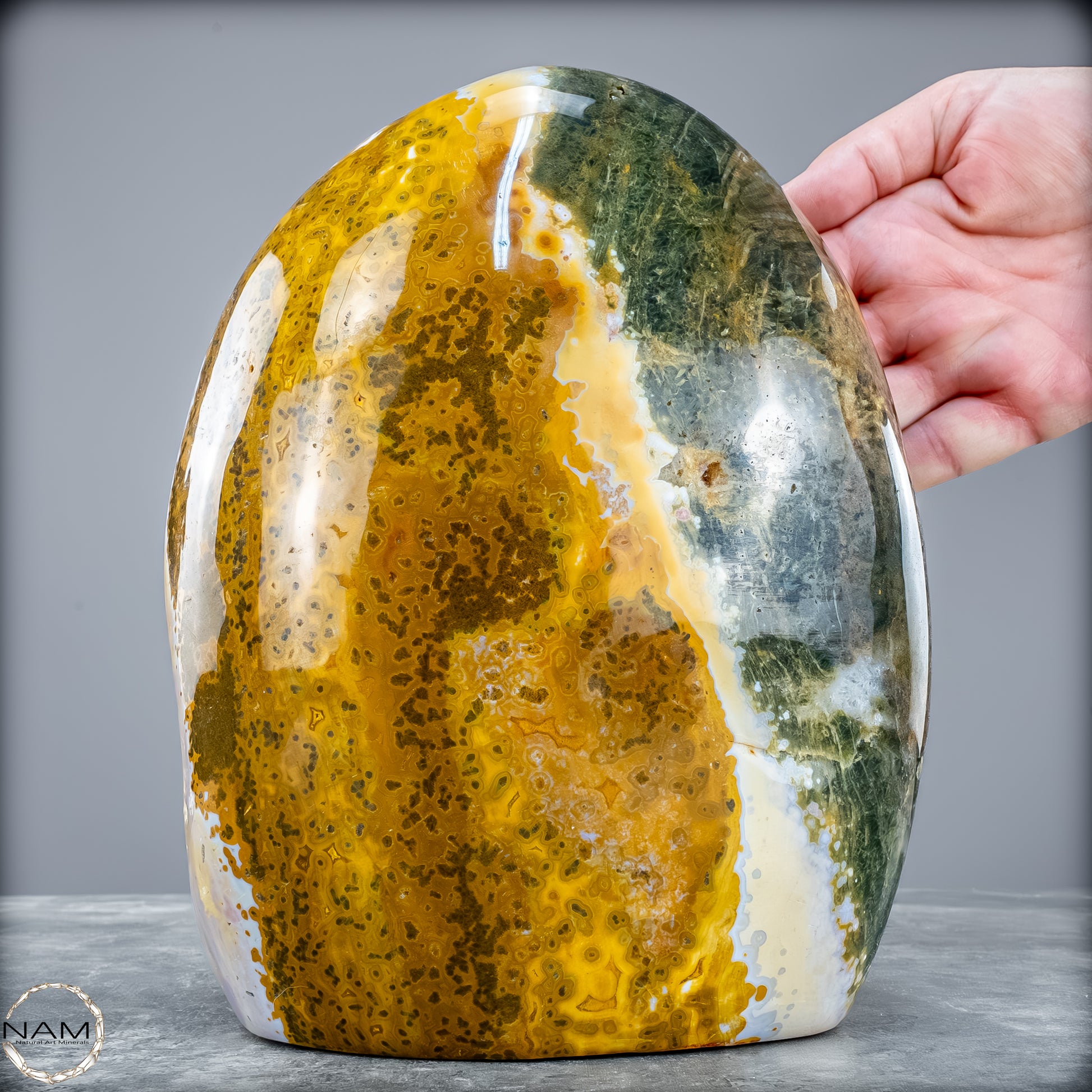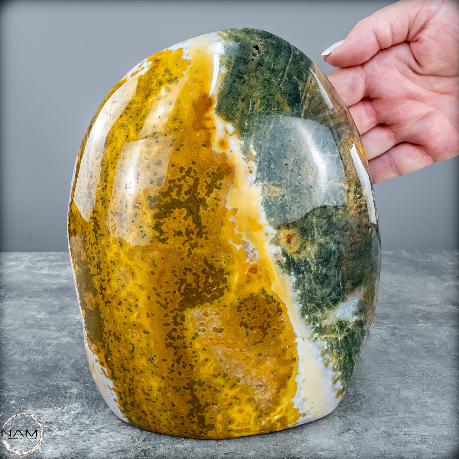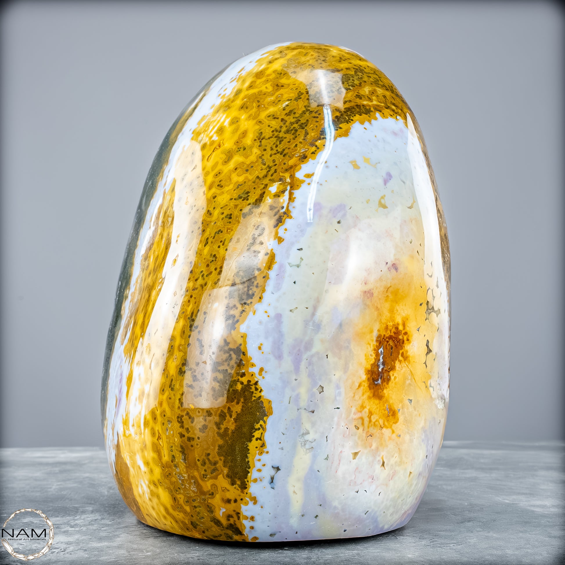 Ocean Jasper gilt als Stein der Freude und des inneren Gleichgewichts. Seine vielfältigen Farben und Muster sollen beruhigend wirken und emotionale Klarheit fördern. Die harmonische Ausstrahlung dieser Freiform macht sie nicht nur zu einem einzigartigen Blickfang, sondern auch zu einem inspirierenden Begleiter in jedem Raum.