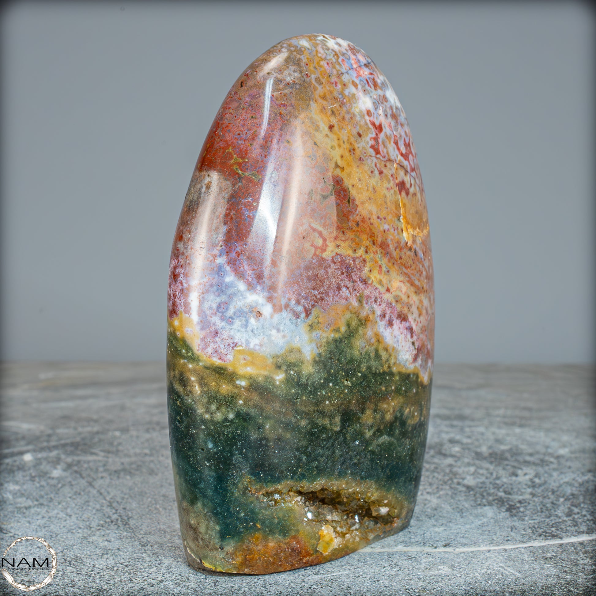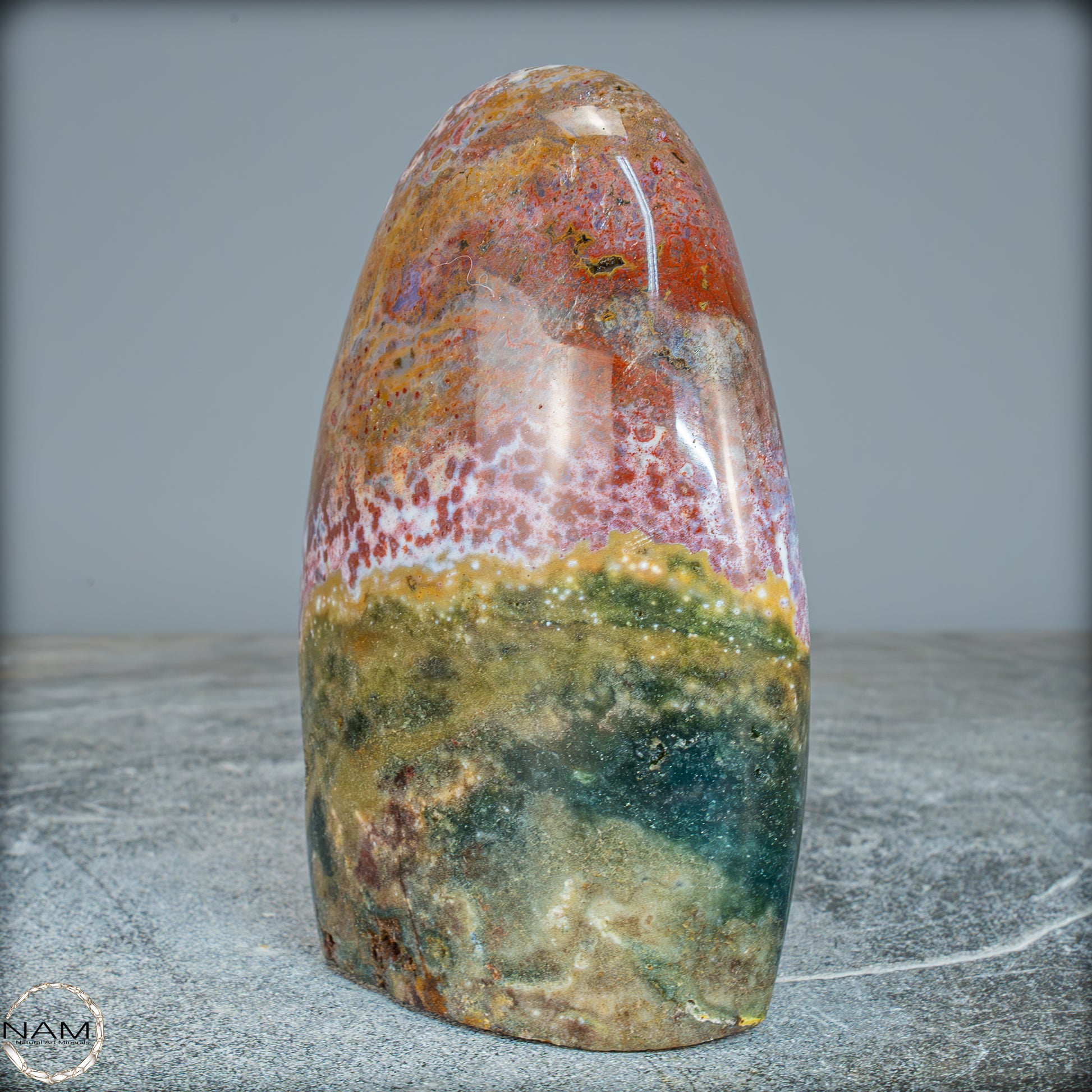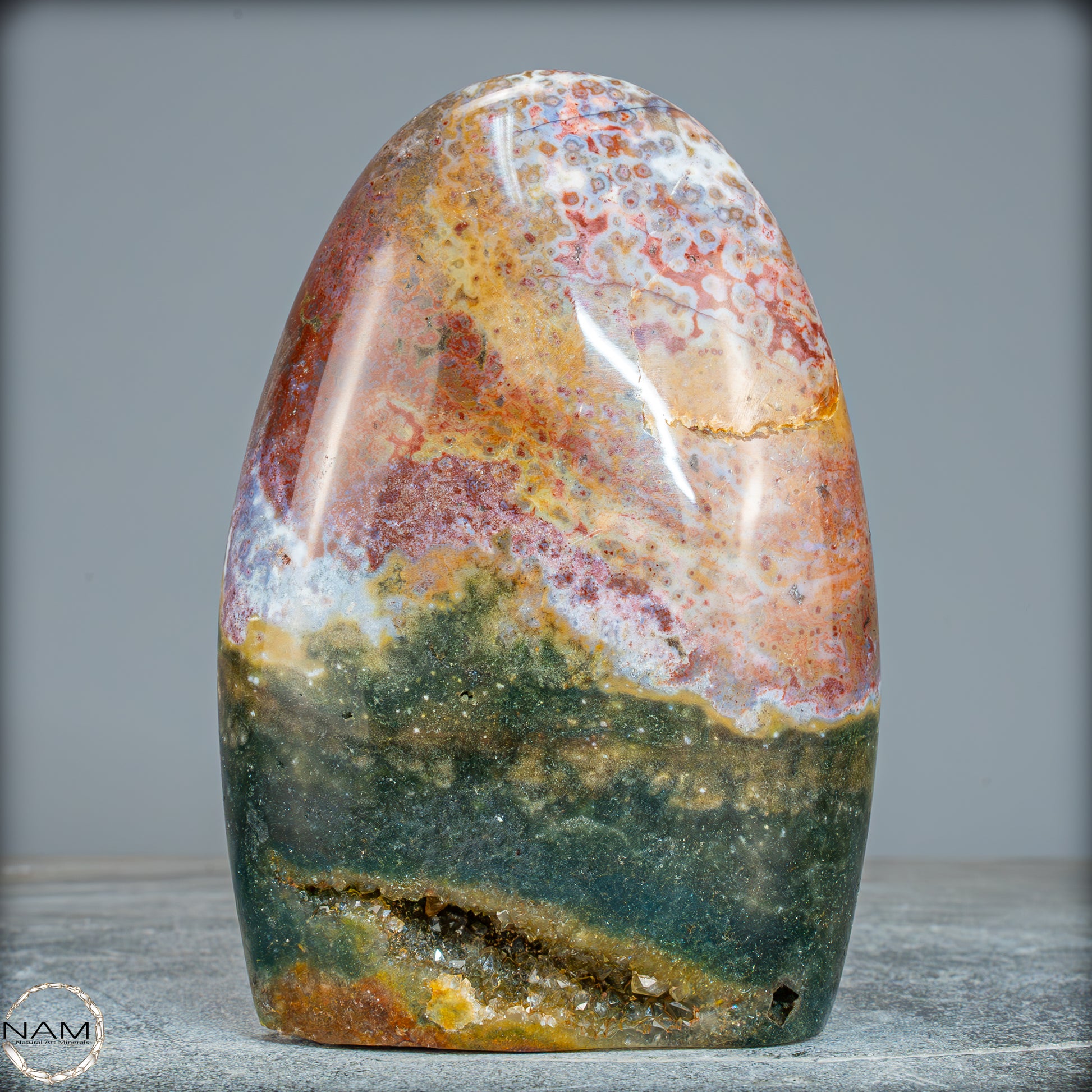 Ocean Jasper gilt als Stein der Freude und des inneren Gleichgewichts. Seine vielfältigen Farben und Muster sollen beruhigend wirken und emotionale Klarheit fördern. Die harmonische Ausstrahlung dieser Freiform macht sie nicht nur zu einem einzigartigen Blickfang, sondern auch zu einem inspirierenden Begleiter in jedem Raum.