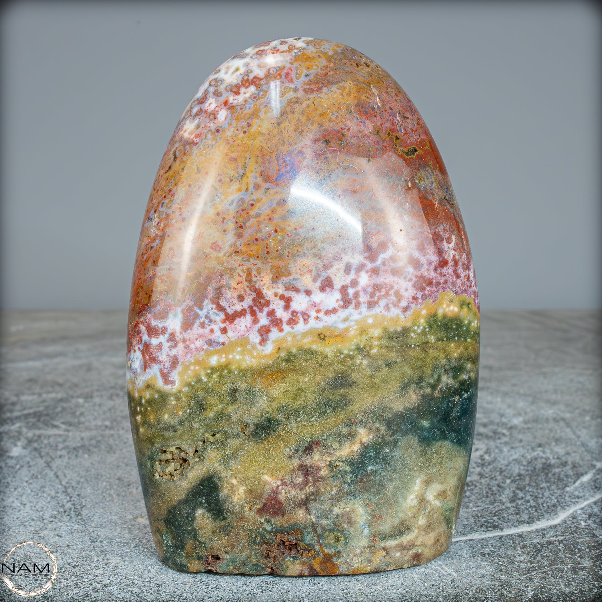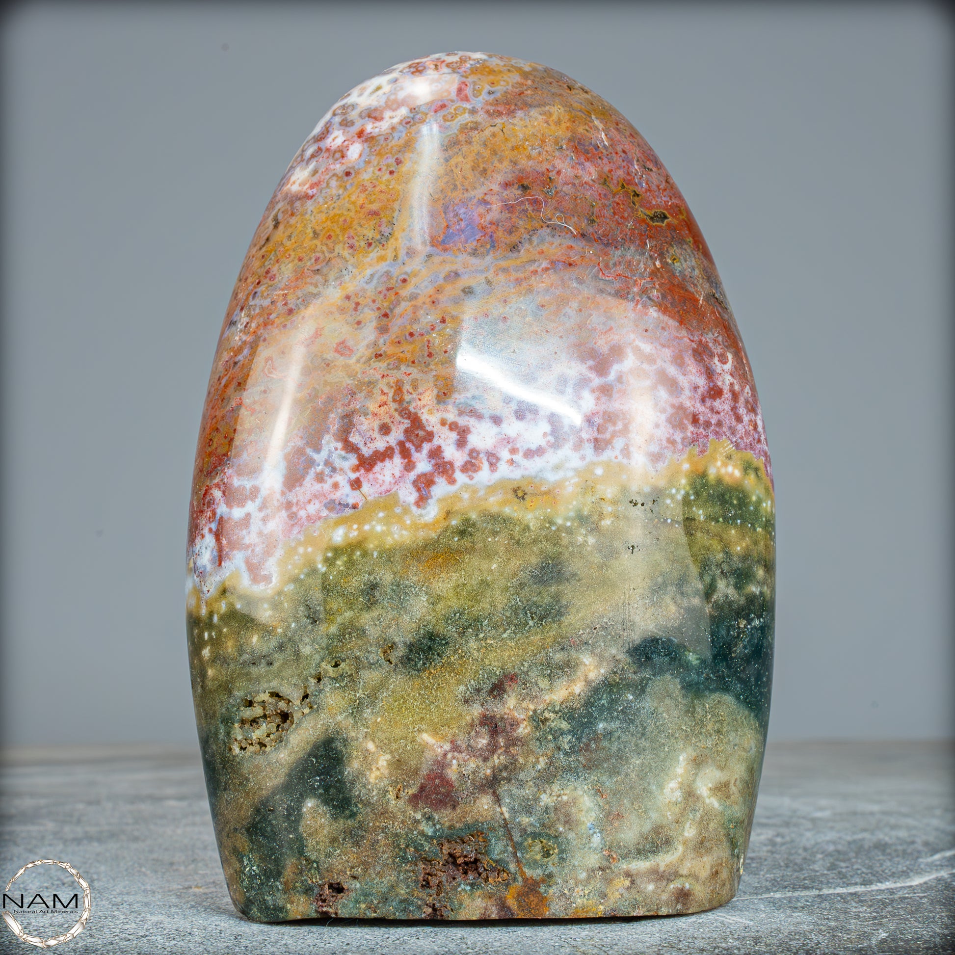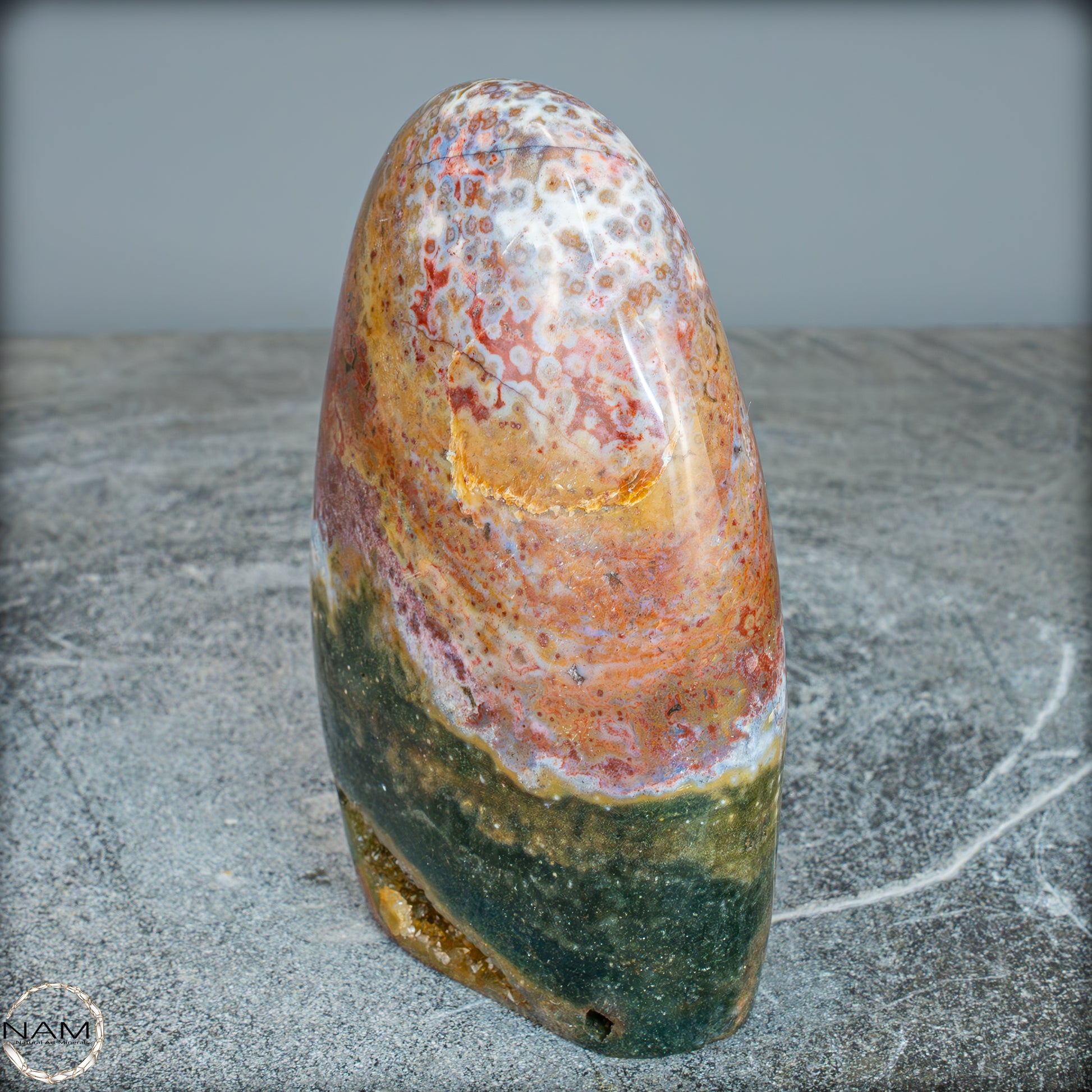 Ocean Jasper gilt als Stein der Freude und des inneren Gleichgewichts. Seine vielfältigen Farben und Muster sollen beruhigend wirken und emotionale Klarheit fördern. Die harmonische Ausstrahlung dieser Freiform macht sie nicht nur zu einem einzigartigen Blickfang, sondern auch zu einem inspirierenden Begleiter in jedem Raum.