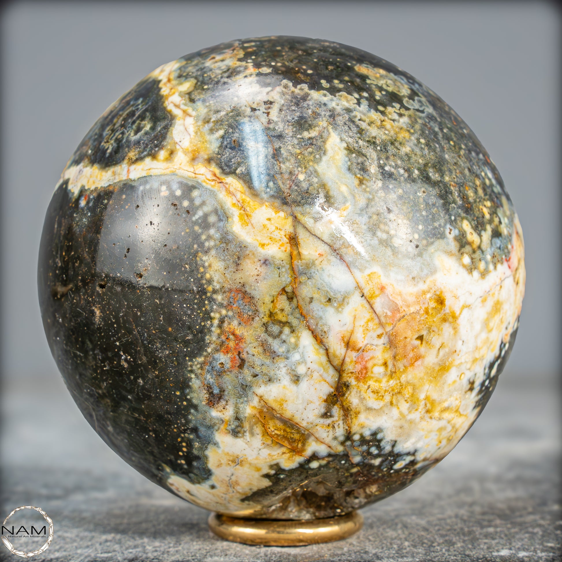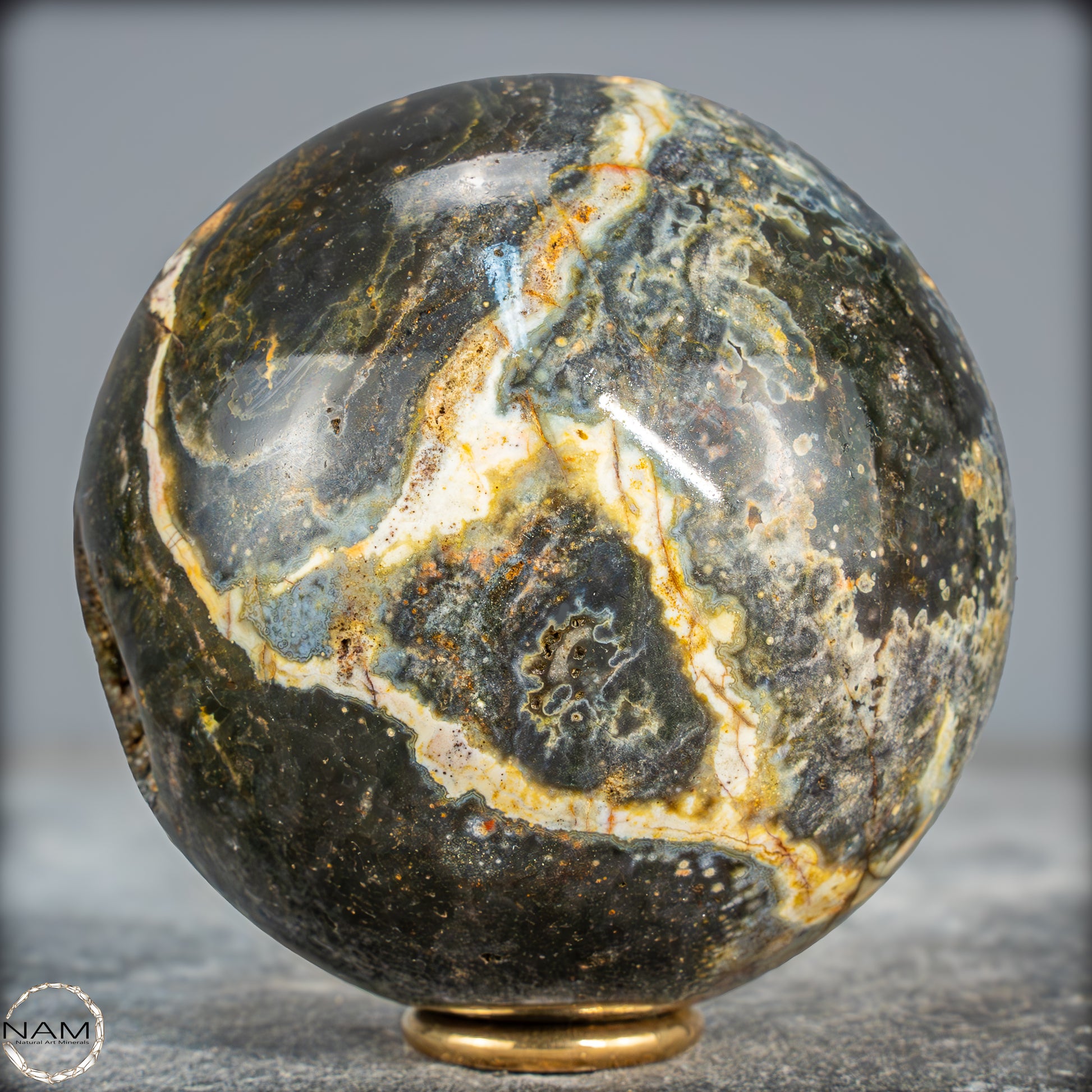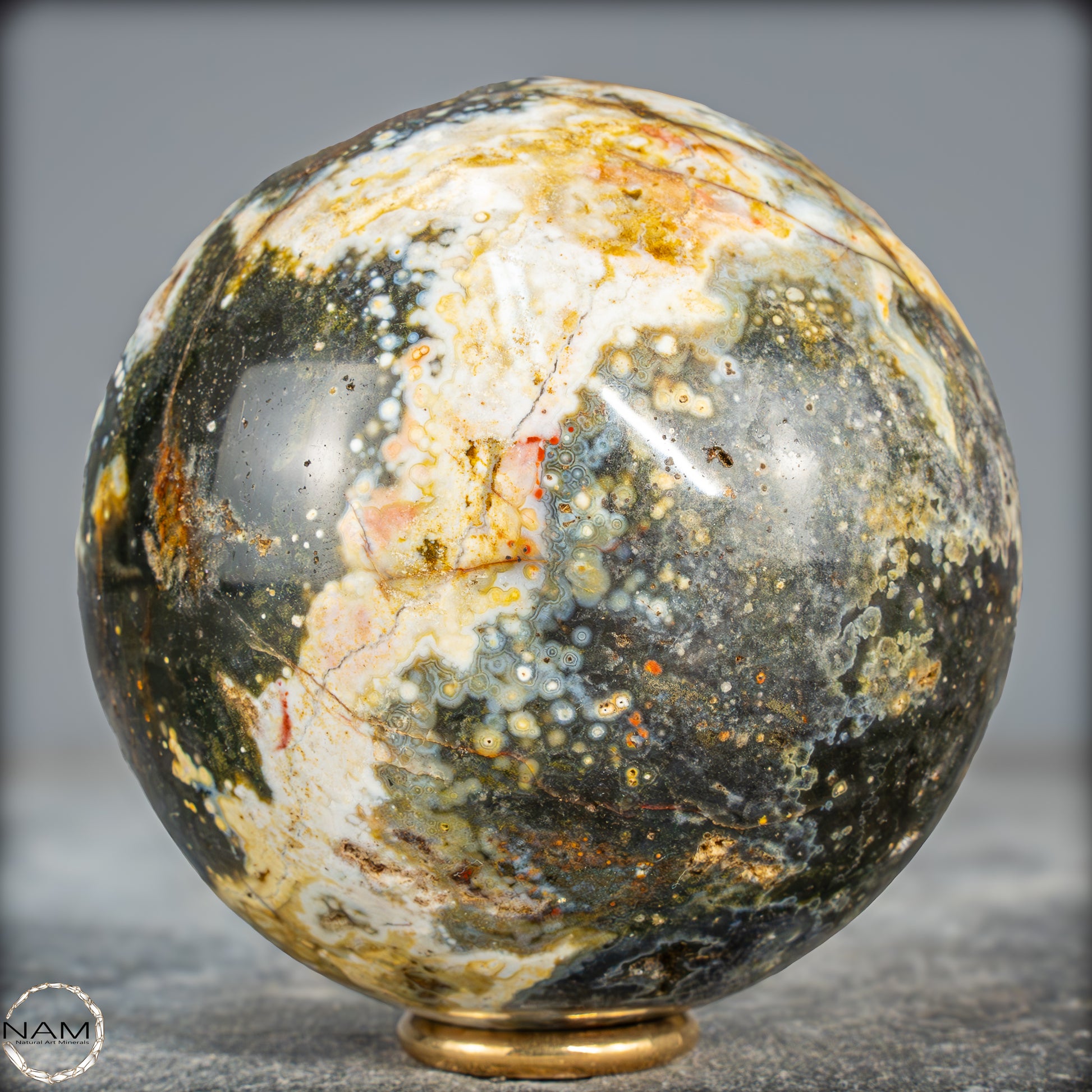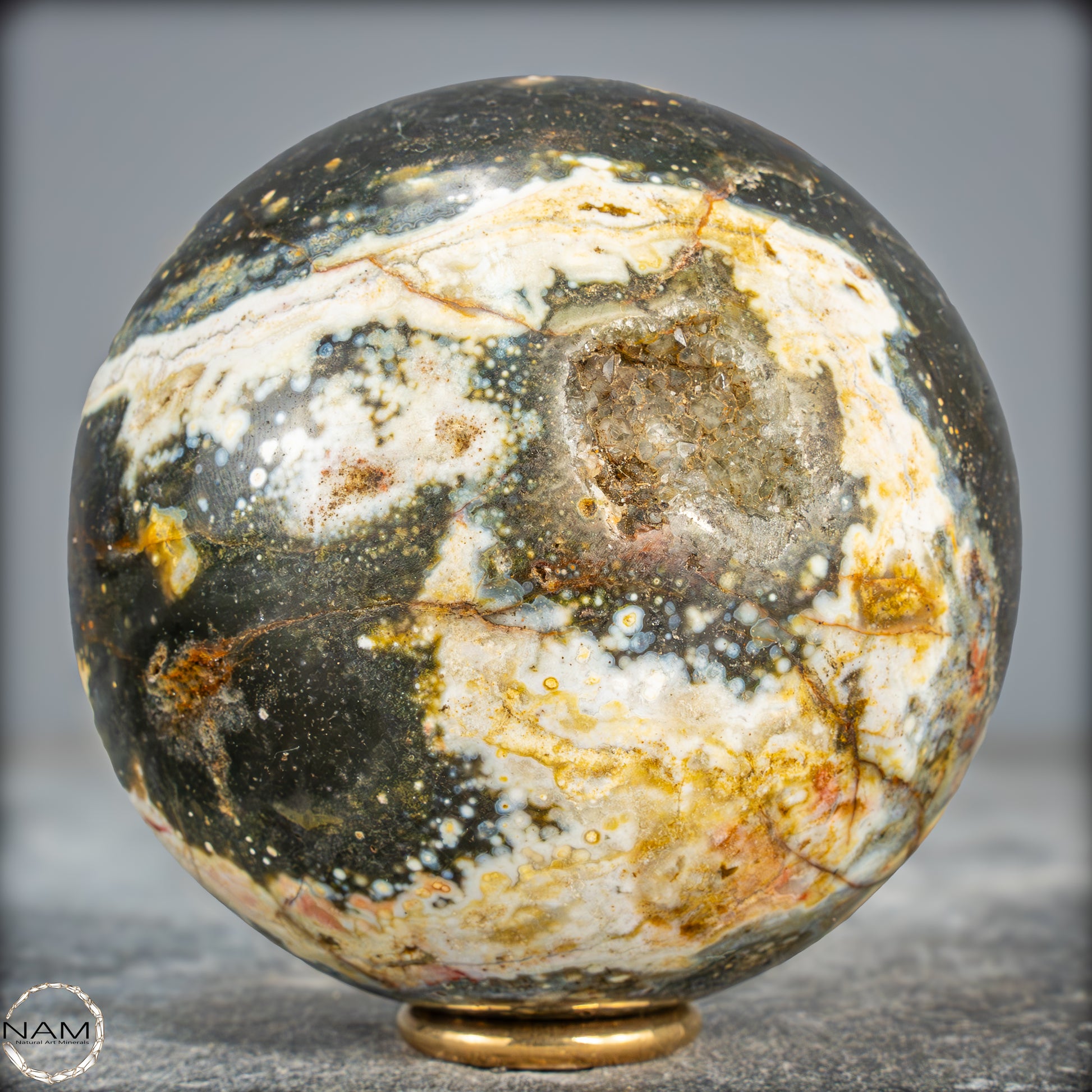 Diese Ocean Jasper Kugel präsentiert eine faszinierende Mischung aus tiefem Moosgrün, warmen Gelb- und Goldtönen sowie kontrastreichen weißen und cremefarbenen Adern. Mehrere kleine Drusenöffnungen geben den Blick auf funkelnde Kristalle im Inneren frei und verleihen der Oberfläche zusätzliche Tiefe und Lebendigkeit. Die komplexen Muster wirken wie eine Landkarte aus mineralischen Farben, in der sich helle Linien und wolkige Übergänge harmonisch verweben.