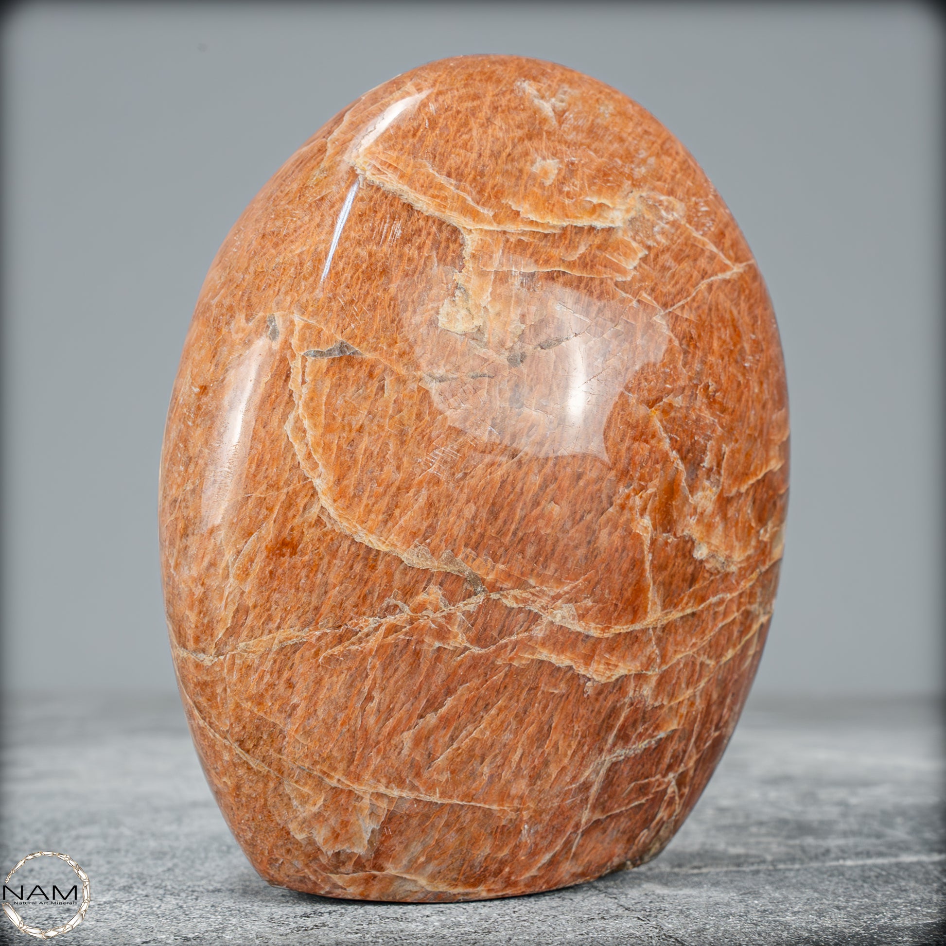 Diese edle Freiform aus Pfirsich-Mondstein zeigt sich in einem warmen, harmonischen Orangeton mit feinen, goldenen Lichtreflexen. Die sanfte Farbe erinnert an den zarten Schimmer eines Sonnenuntergangs, eingefangen in polierter, seidiger Oberfläche.