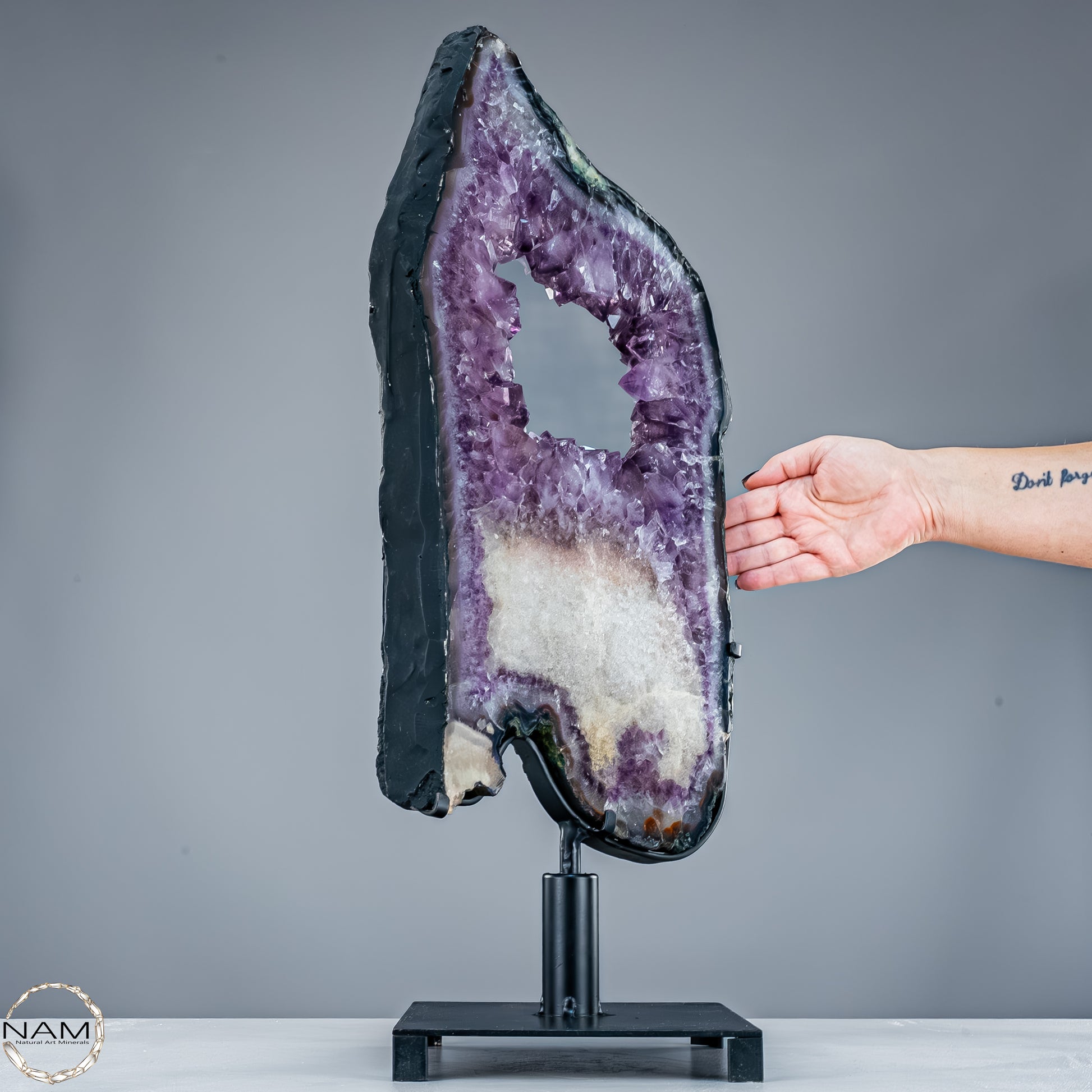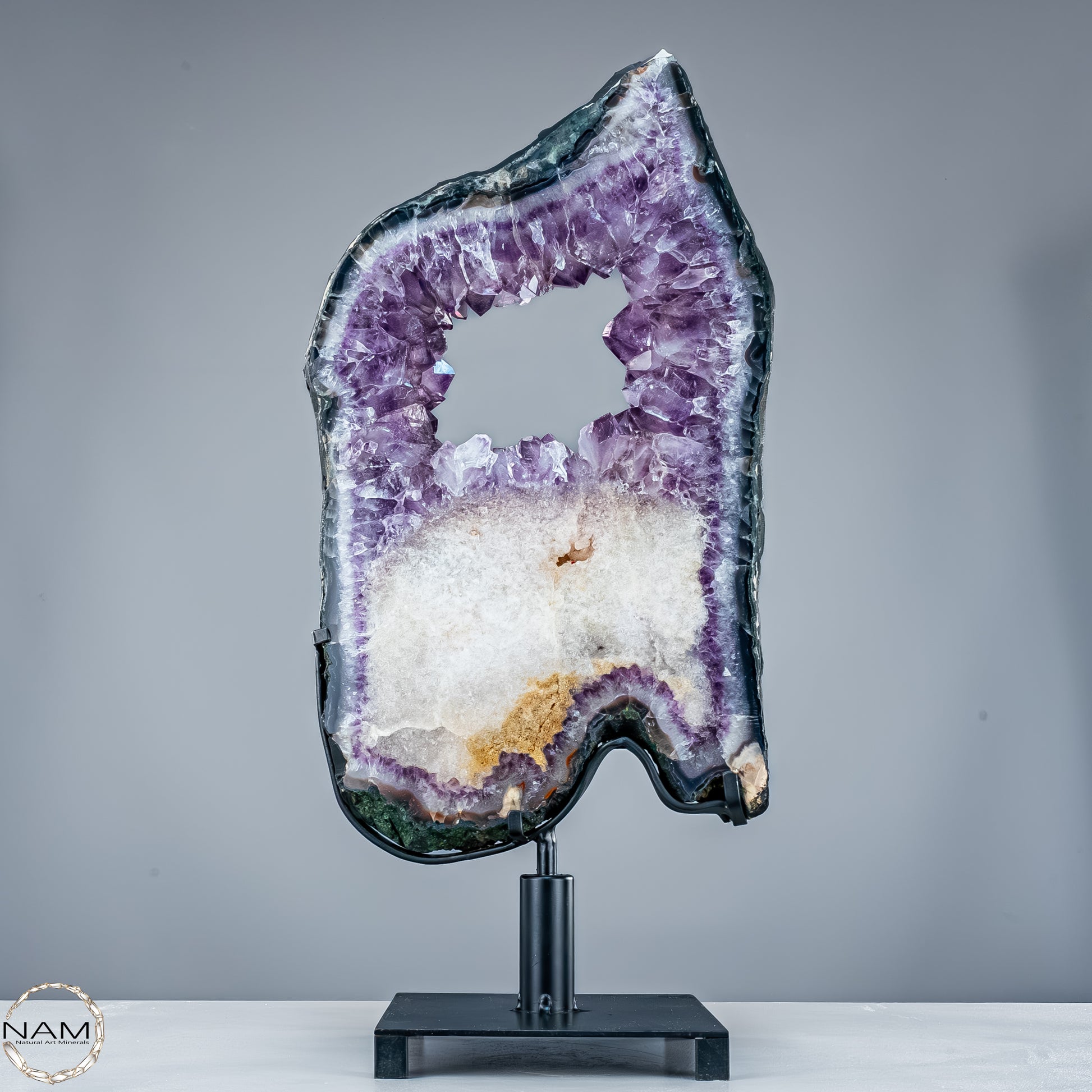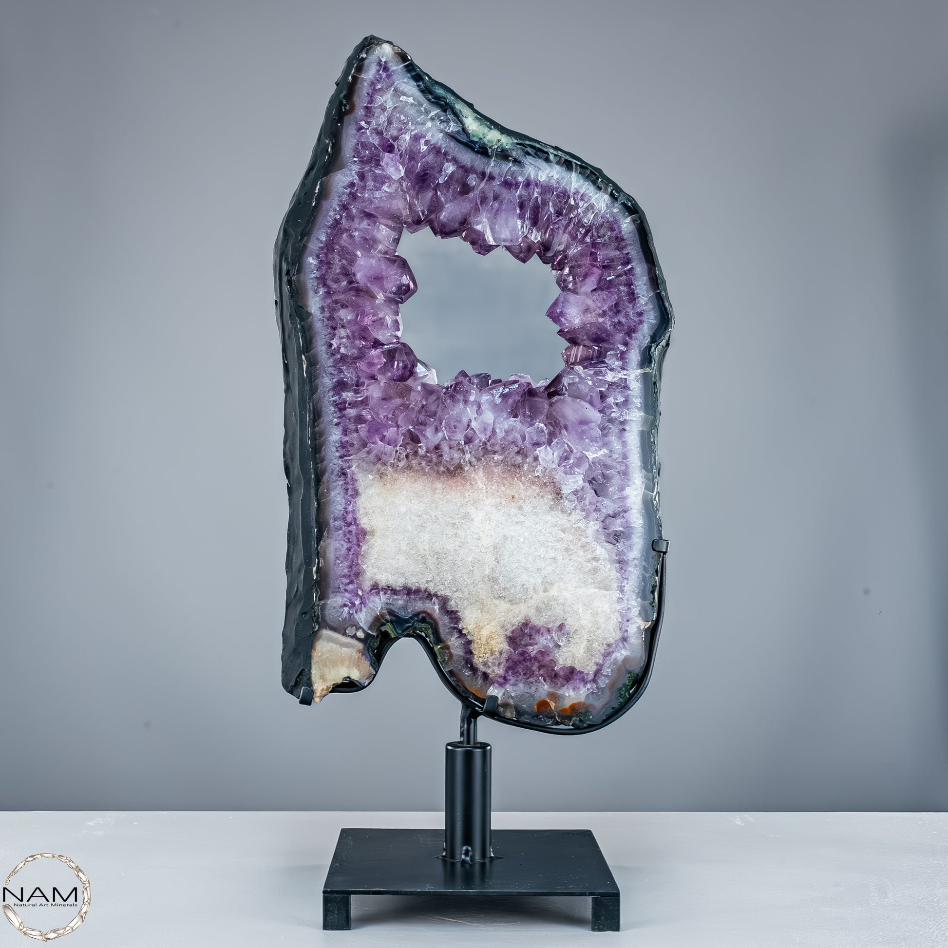 Diese außergewöhnliche Amethyst-Scheibe auf Ständer vereint die majestätische Kraft des violetten Quarzes mit einem seltenen Detail: zart rosafarbene Amethystkristalle im Zentrum der Formation, eingebettet in ein natürliches Fenster aus funkelndem Kristall. Mit einem Gewicht von 11 kg und perfekt eingefasst in einen stabilen Metallständer, wird dieses Stück zu einem Blickfang jeder Sammlung oder Raumgestaltung.