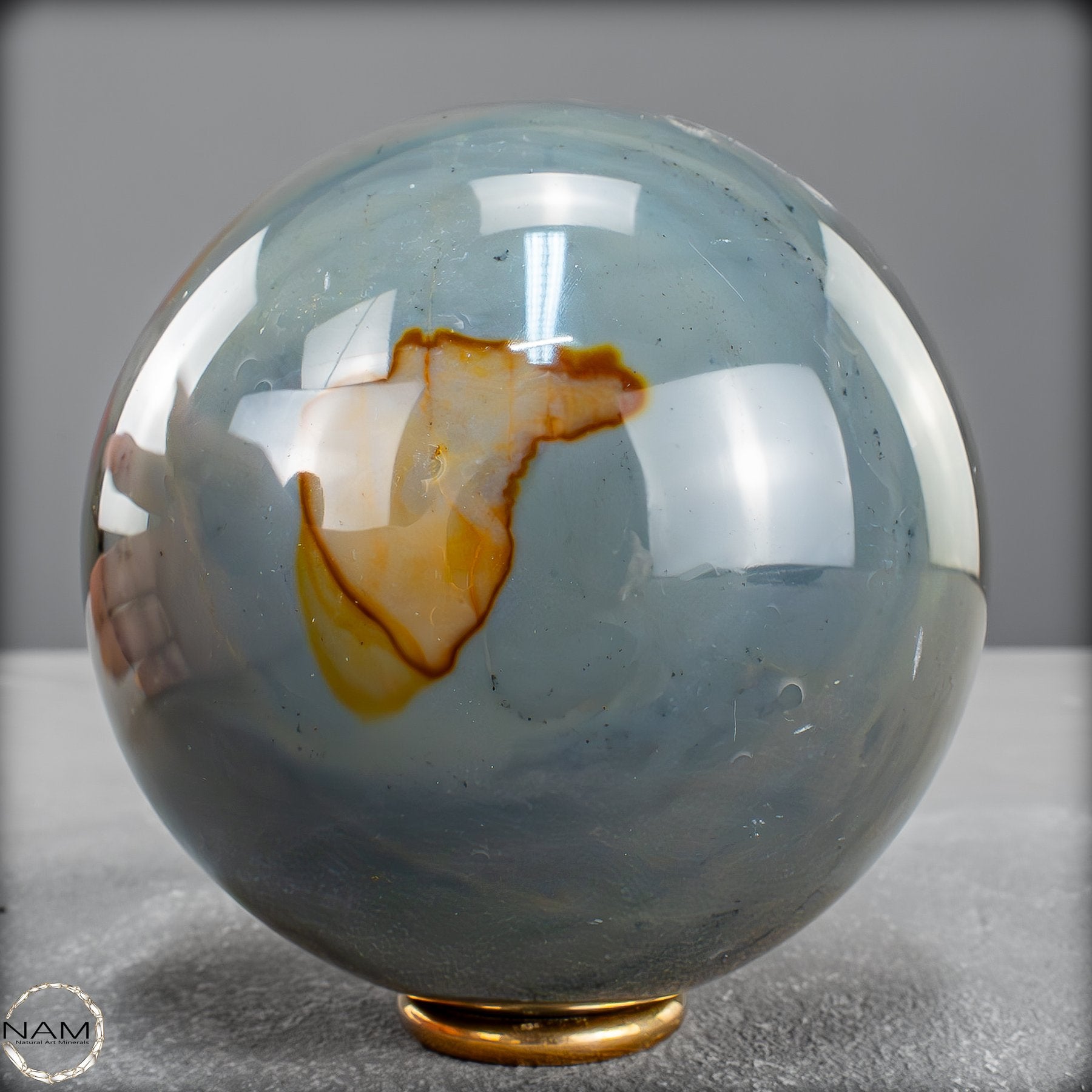 Jeder Abschnitt der Kugel wirkt wie ein abstraktes Gemälde, geschaffen von der Hand der Natur – kraftvoll, lebendig und zugleich voller Eleganz. Polychromer Jaspis ist bekannt als Stein der Erdung und Vitalität: Er schenkt innere Stabilität, Energie und Ausgeglichenheit, während er die Verbindung zur Erde stärkt und eine beruhigende Wärme ausstrahlt.