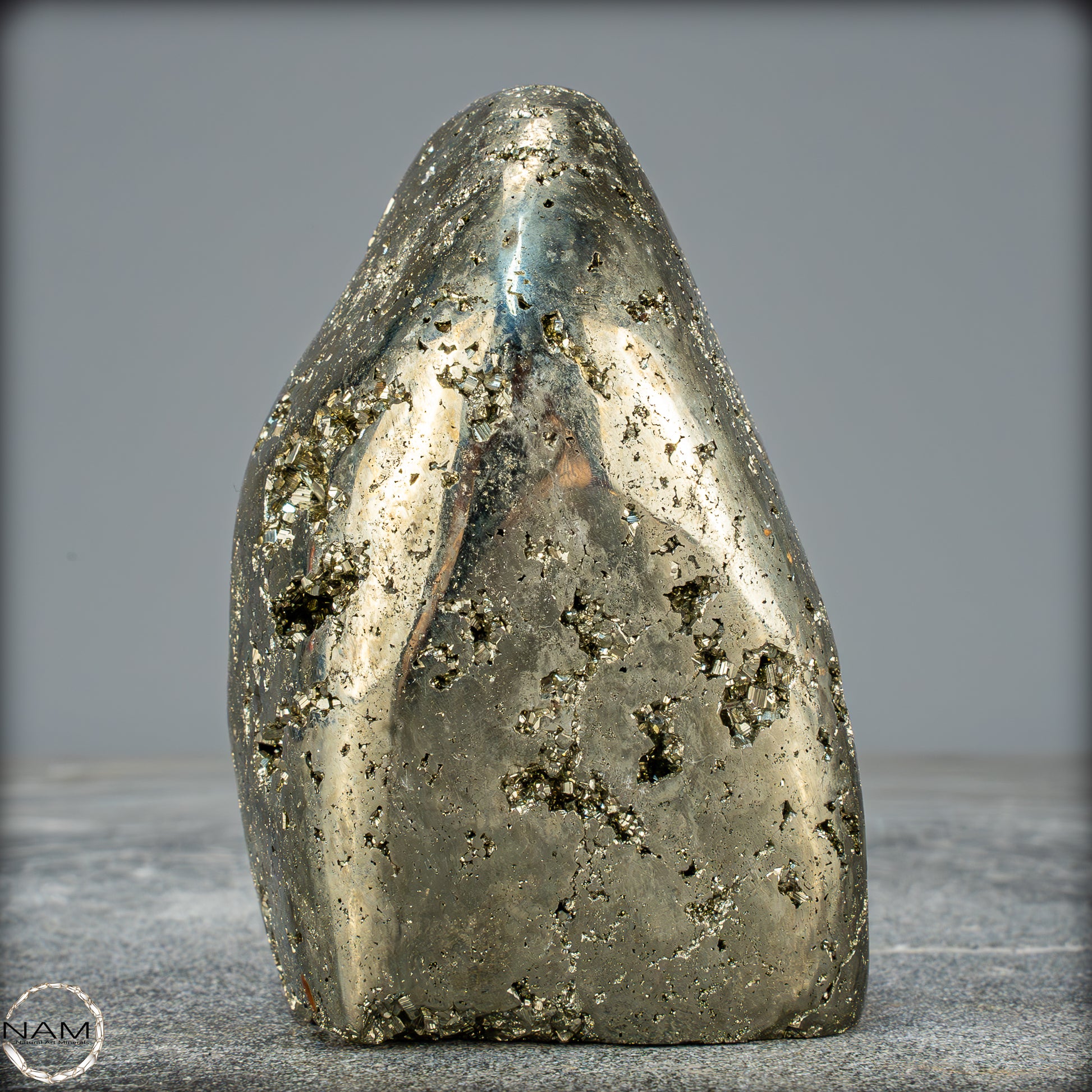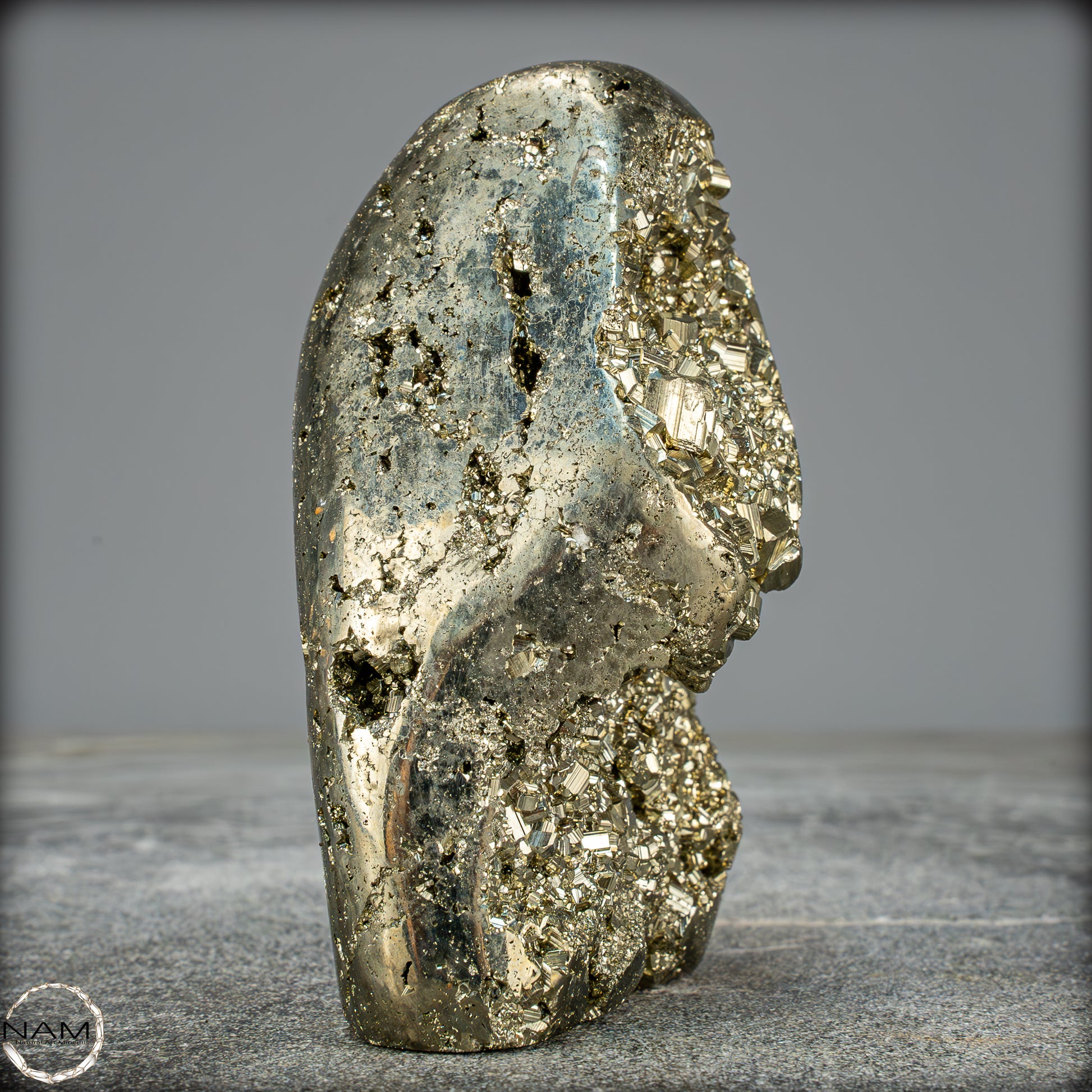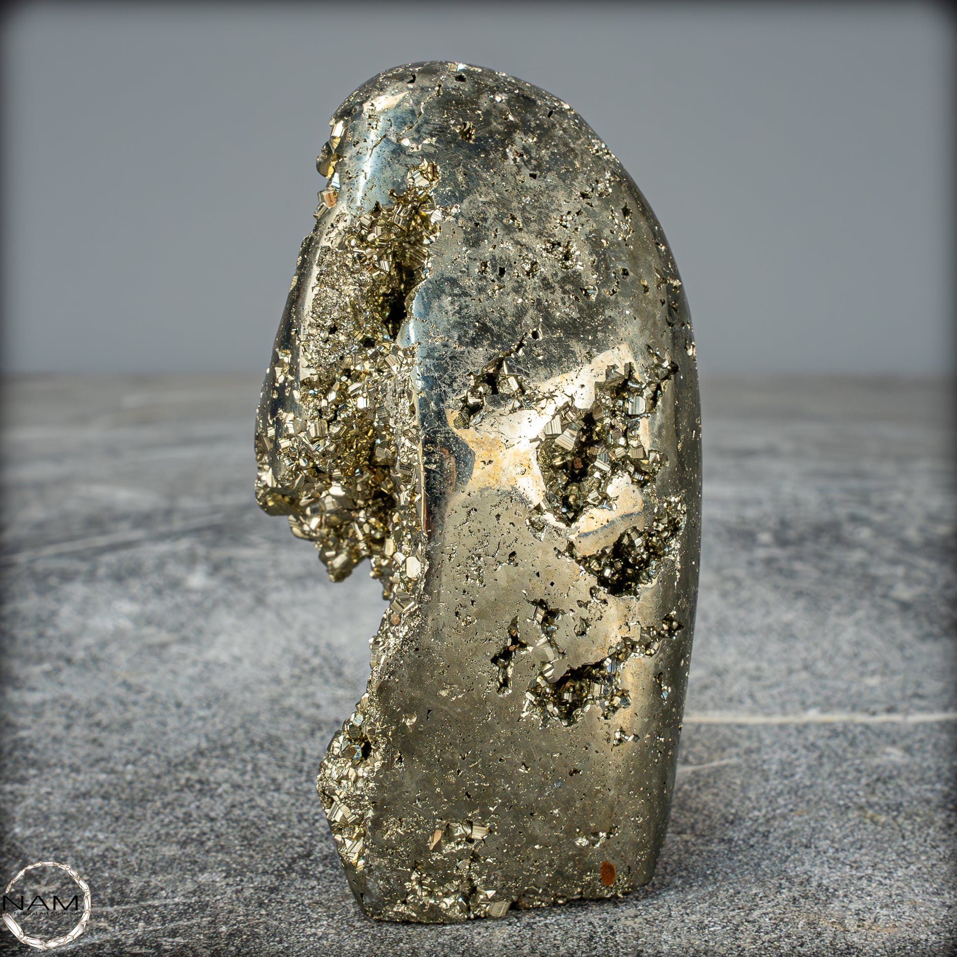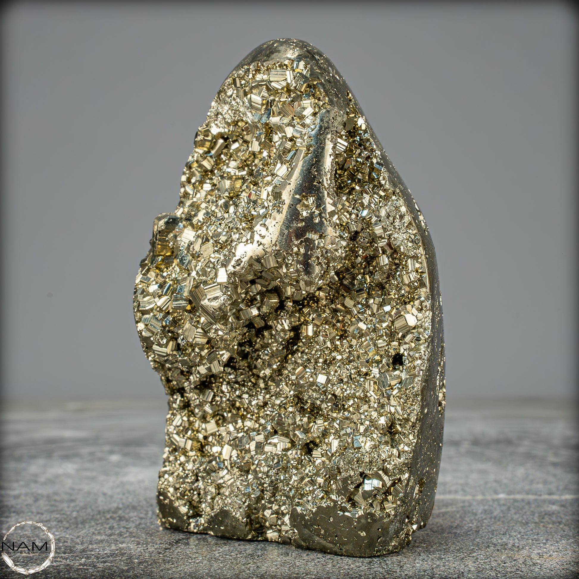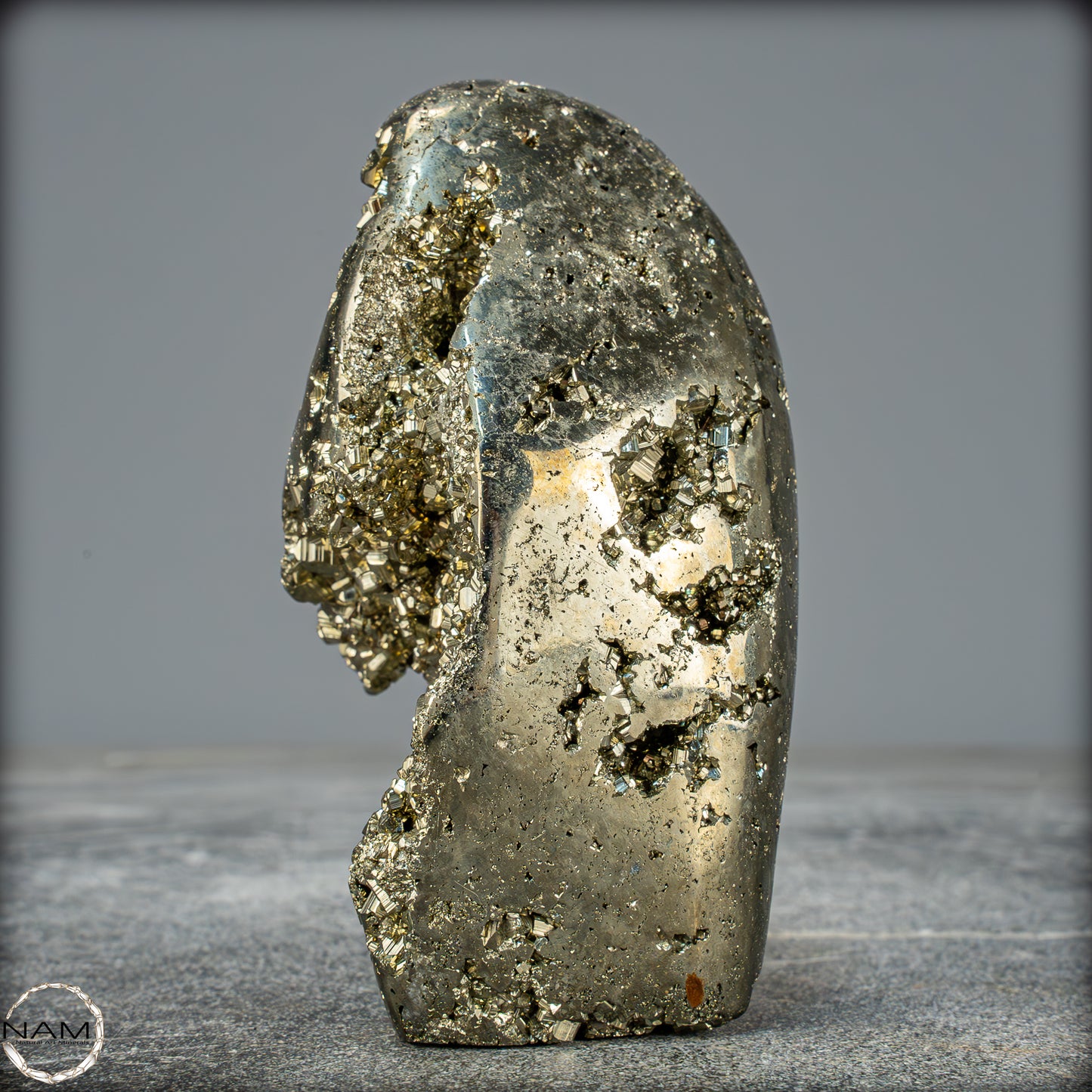 Diese spektakuläre Pyrit-Stufe besticht durch ihre außergewöhnlich ausgeprägten kubischen Kristalle mit markanten Wachstumsstrukturen und einer strahlend metallischen Goldfärbung. Die würfelförmigen Flächen sind teils glatt, teils mit feinen Linien durchzogen und zeigen die typische Struktur des „Katzengoldes“ in beeindruckender Perfektion. In den Vertiefungen befinden sich zusätzlich kleine schwarze Einschlüsse, vermutlich Sphalerit oder Galenit, die für Kontraste sorgen. Begleitet wird das Ensemble von weißen Quarzfragmenten, die zwischen den Pyritflächen eingelagert sind und die geometrische Klarheit der Kristalle zusätzlich betonen. Die Kombination aus Glanz, Textur und Klarheit macht dieses Stück zu einem Highlight für jede Sammlung kristalliner Mineralien.