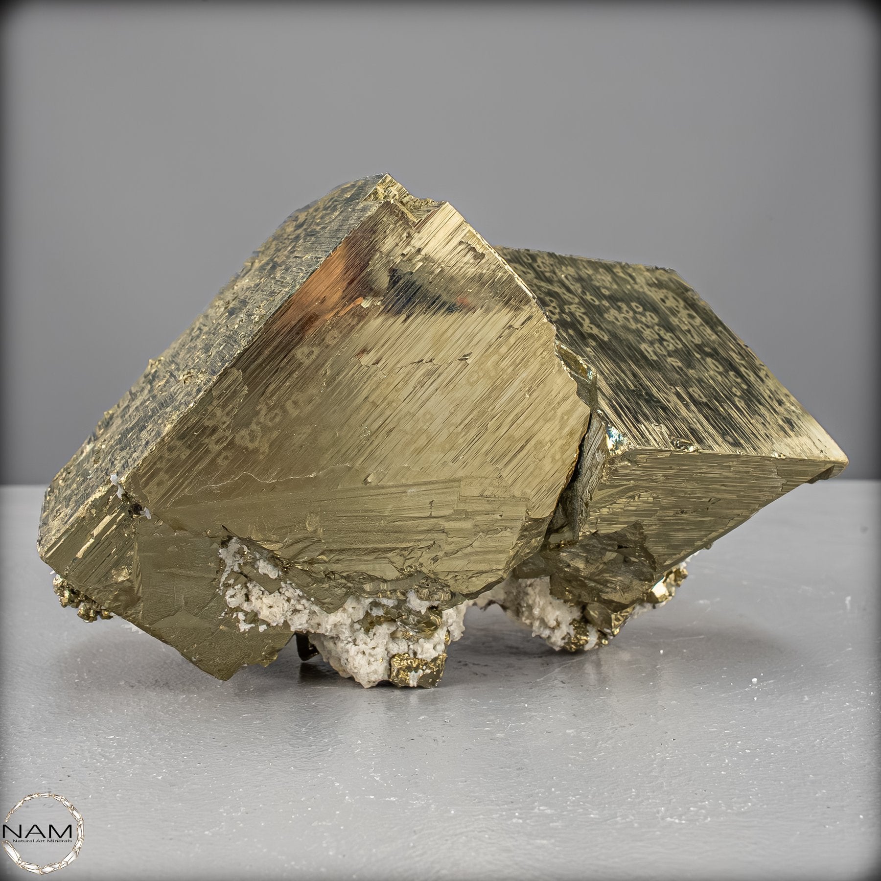 Dieses beeindruckende Pyrit-Exemplar präsentiert sich als kraftvoller, geometrisch wirkender Kristallkörper mit markanten, goldmetallisch glänzenden Flächen, die eine beinahe skulpturale Präsenz ausstrahlen. Die großen, klar abgegrenzten Kristallflächen zeigen die für Pyrit typischen, fein linierten Strukturen, die im Licht wie geätzte Muster wirken und dem Stück eine technische, fast futuristische Ästhetik verleihen.