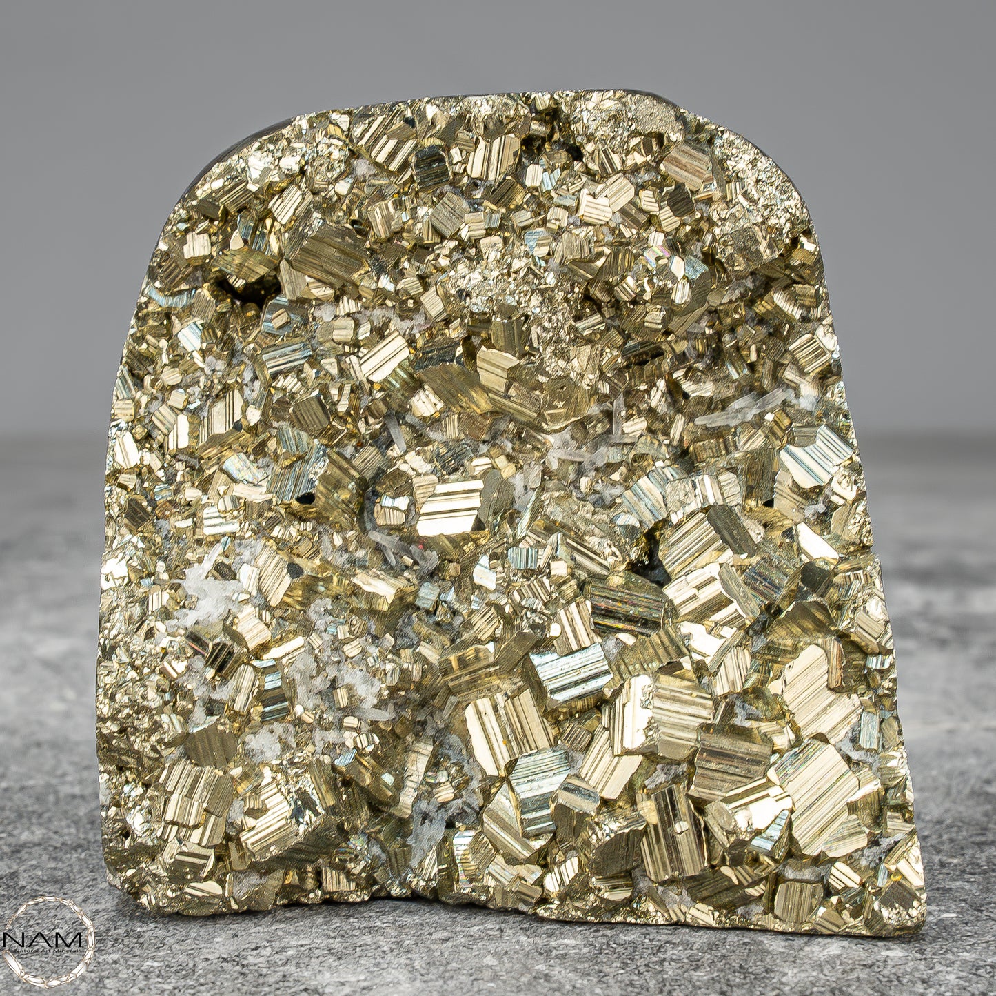 Diese spektakuläre Pyrit-Stufe besticht durch ihre außergewöhnlich ausgeprägten kubischen Kristalle mit markanten Wachstumsstrukturen und einer strahlend metallischen Goldfärbung. Die würfelförmigen Flächen sind teils glatt, teils mit feinen Linien durchzogen und zeigen die typische Struktur des „Katzengoldes“ in beeindruckender Perfektion. In den Vertiefungen befinden sich zusätzlich kleine schwarze Einschlüsse, vermutlich Sphalerit oder Galenit, die für Kontraste sorgen. Begleitet wird das Ensemble von weißen Quarzfragmenten, die zwischen den Pyritflächen eingelagert sind und die geometrische Klarheit der Kristalle zusätzlich betonen. Die Kombination aus Glanz, Textur und Klarheit macht dieses Stück zu einem Highlight für jede Sammlung kristalliner Mineralien.