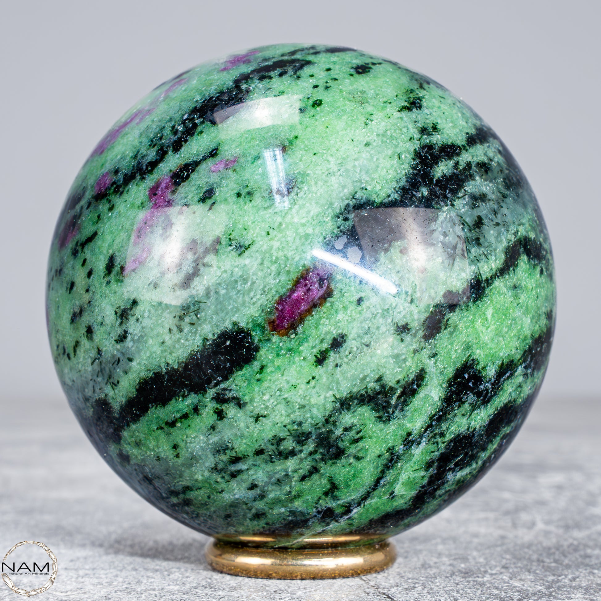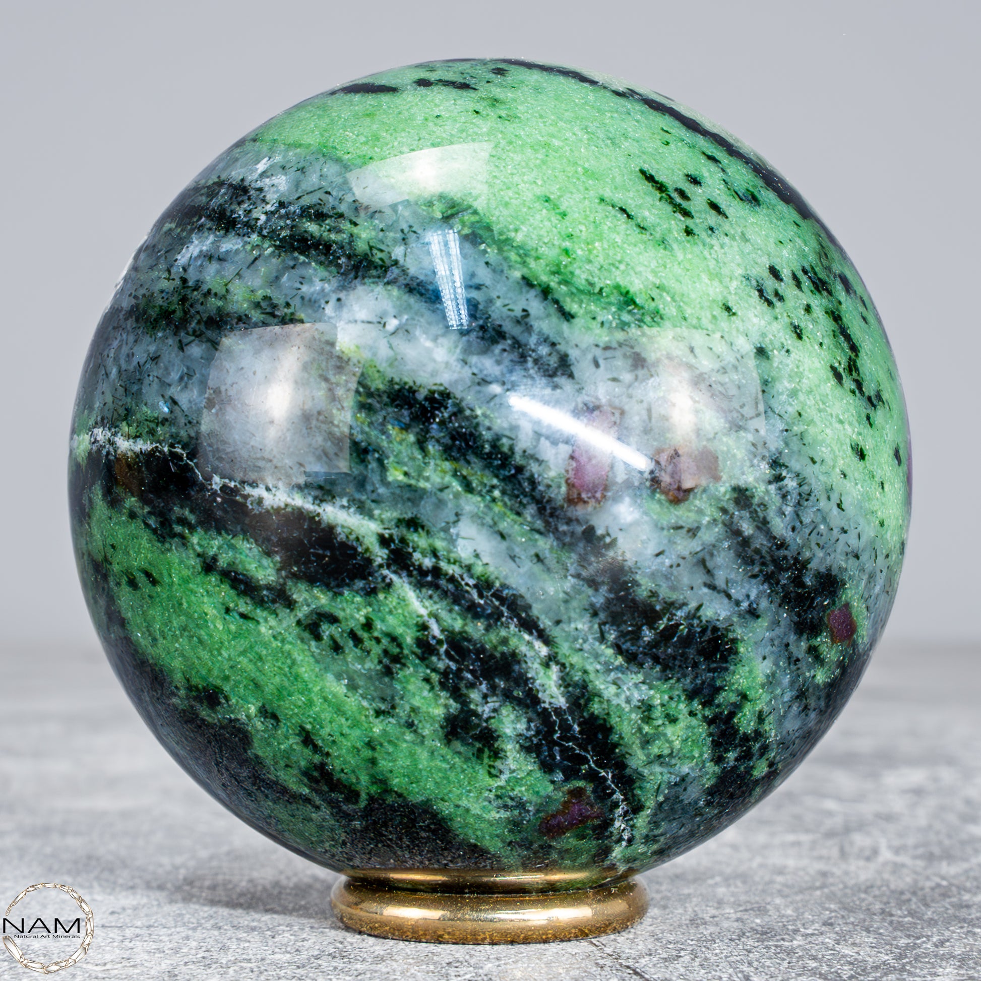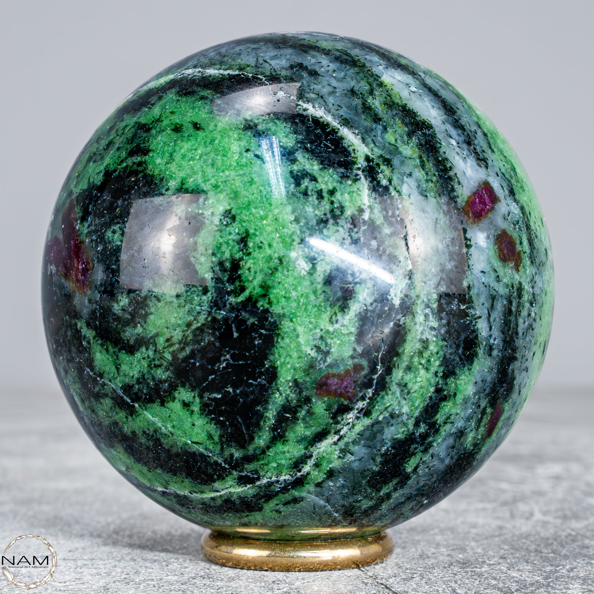 Diese eindrucksvolle Kugel besteht aus Zoisit mit Rubin, einem faszinierenden Naturstein, der durch seine kräftige grüne Farbe mit dunklen Einschlüssen und leuchtend roten Rubineinlagerungen sofort ins Auge fällt. Bekannt ist diese Gesteinskombination auch unter dem Namen Anyolith, und sie stammt vorwiegend aus Tansania, wo sie erstmals entdeckt wurde.