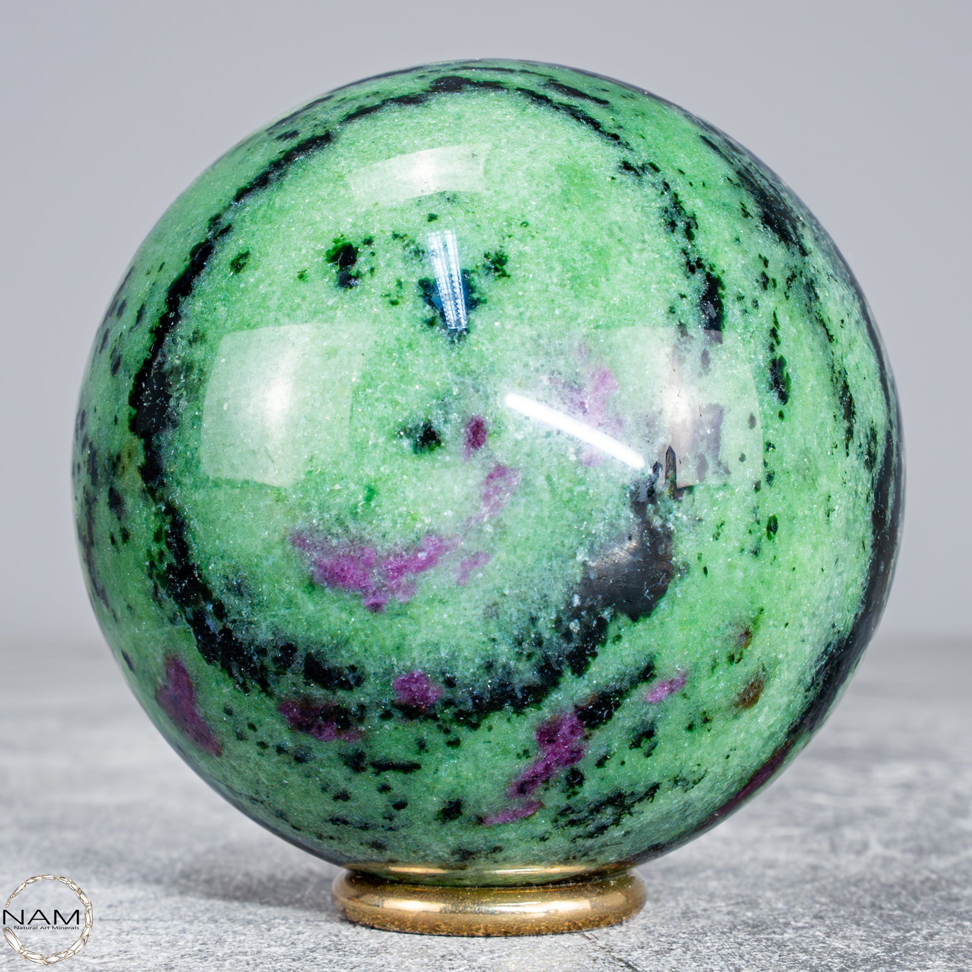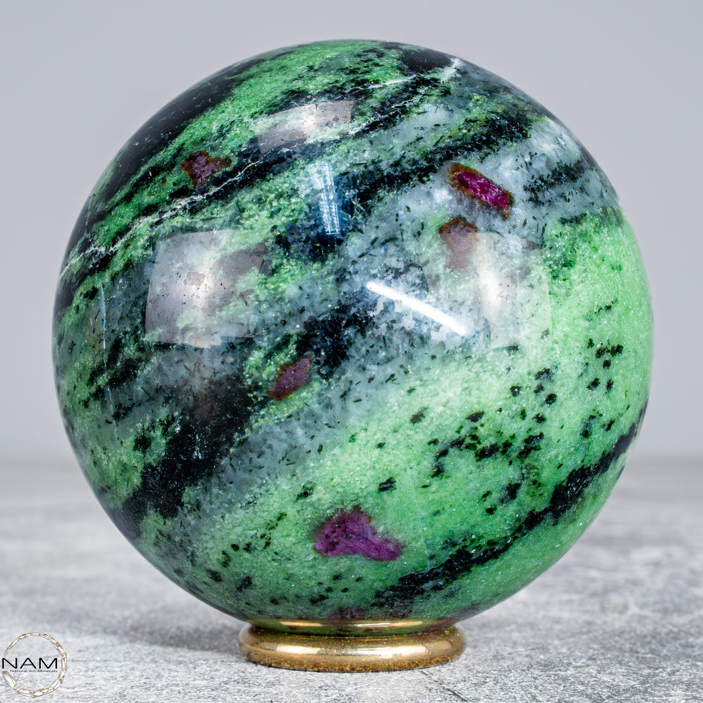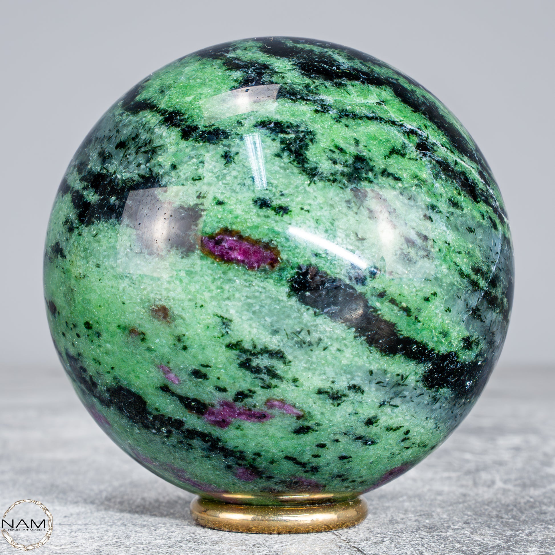 Diese eindrucksvolle Kugel besteht aus Zoisit mit Rubin, einem faszinierenden Naturstein, der durch seine kräftige grüne Farbe mit dunklen Einschlüssen und leuchtend roten Rubineinlagerungen sofort ins Auge fällt. Bekannt ist diese Gesteinskombination auch unter dem Namen Anyolith, und sie stammt vorwiegend aus Tansania, wo sie erstmals entdeckt wurde.