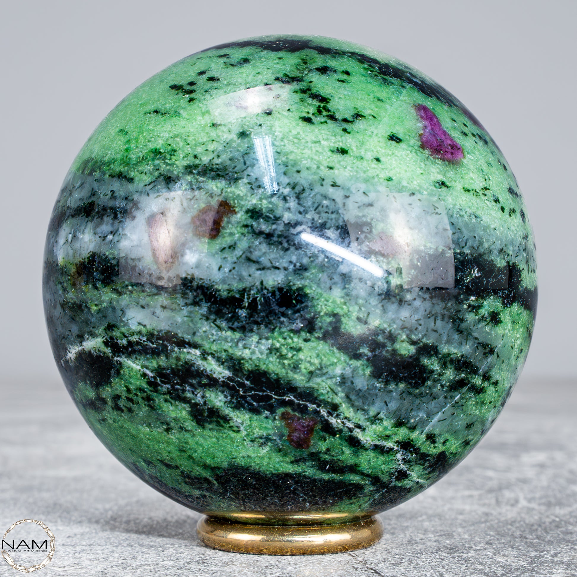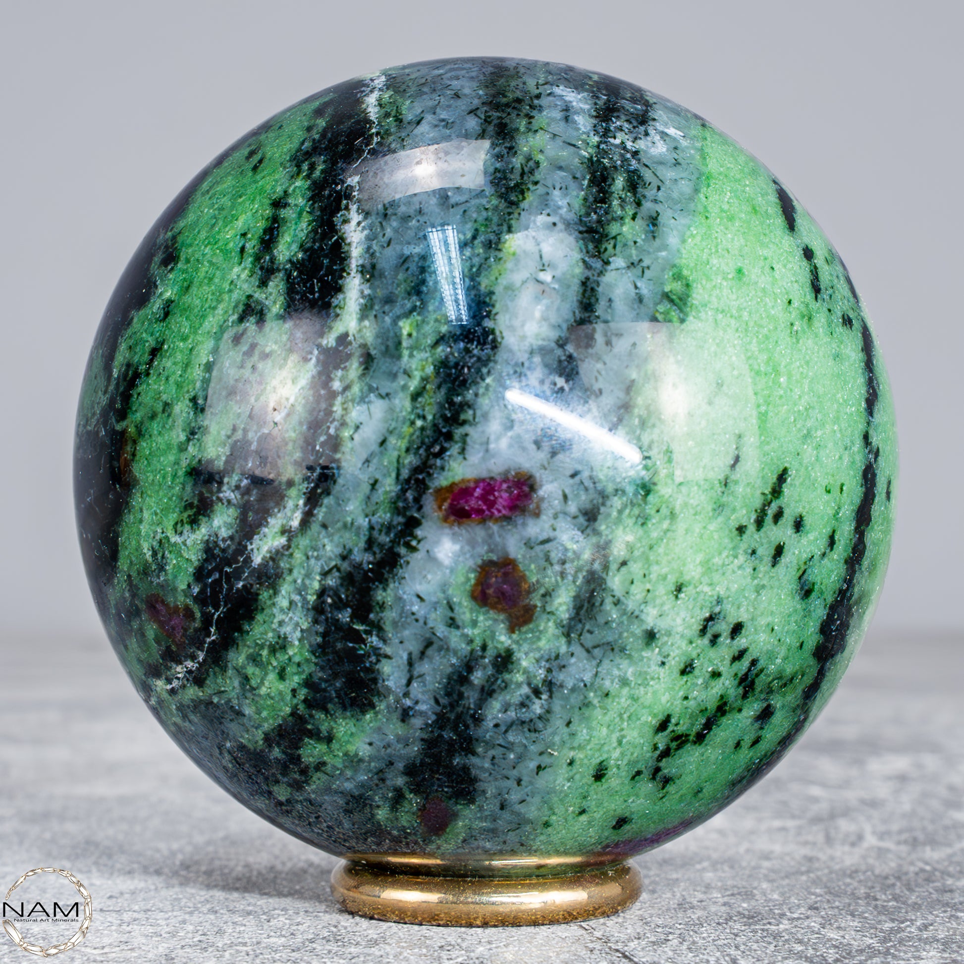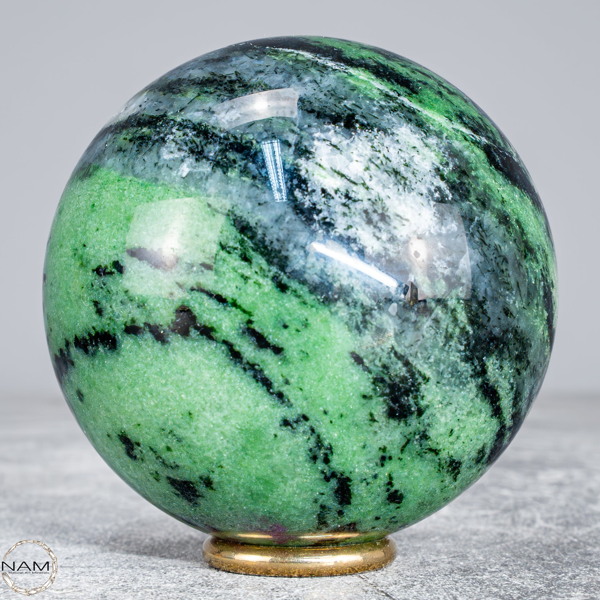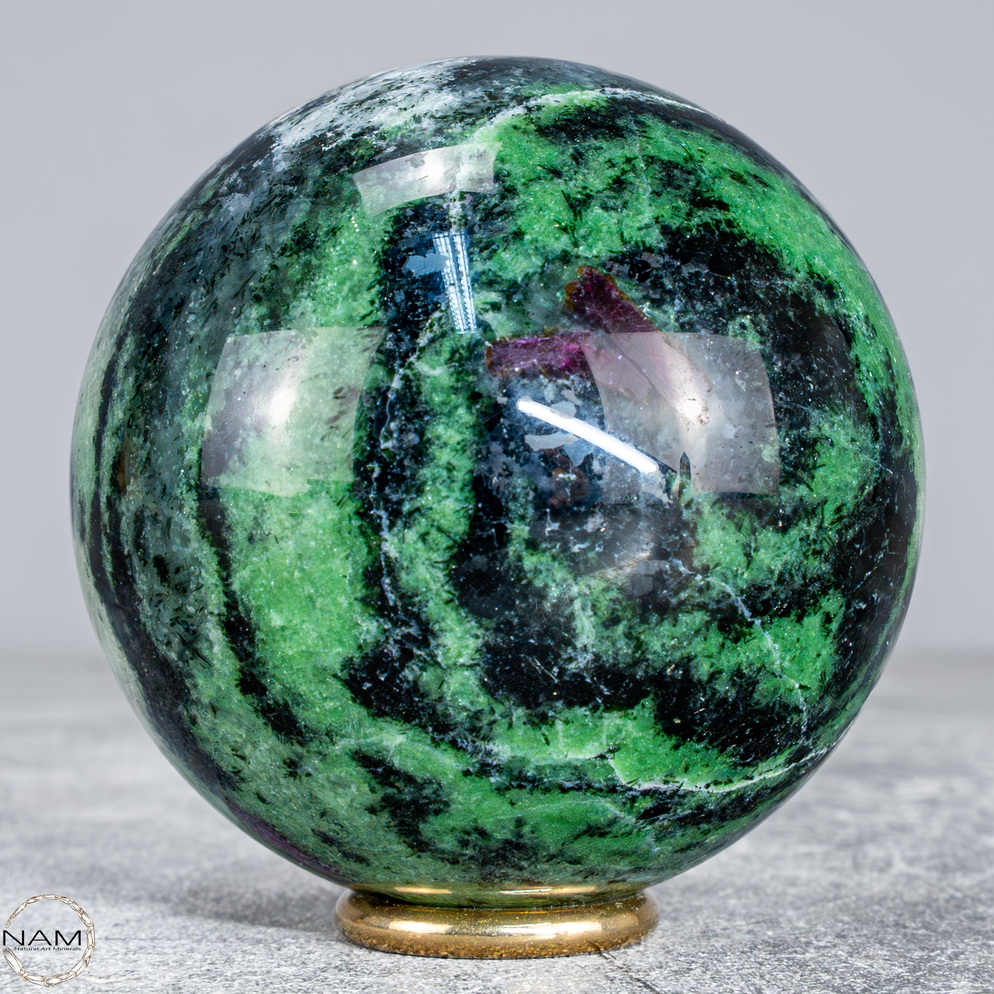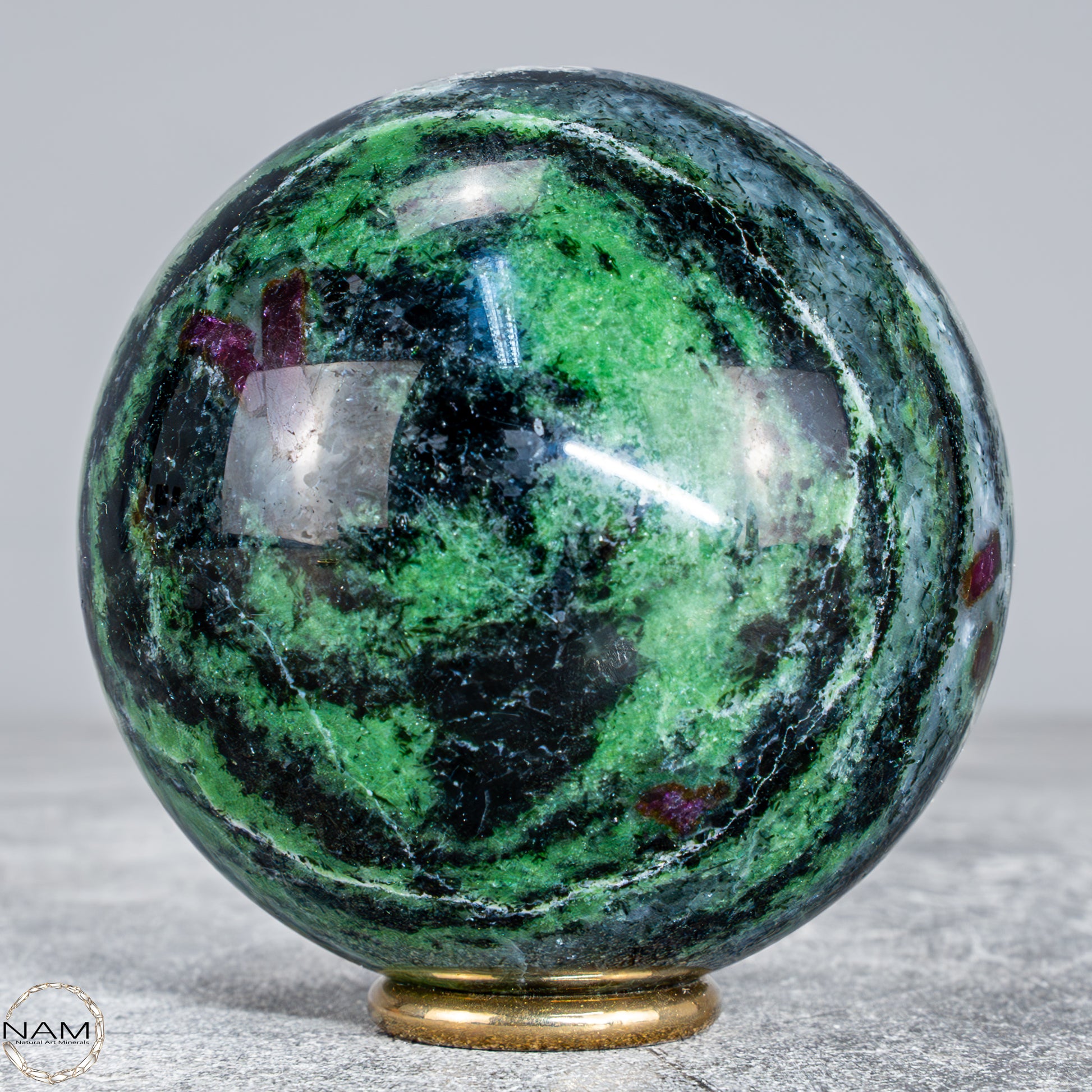 Zoisit bildet die grüne Matrix dieses Steins, durchzogen von schwarzen Hornblendeadern, in die sich natürliche Rubinkristalle eingebettet haben. Die harmonische Verbindung dieser beiden Minerale macht jede Kugel zu einem einzigartigen Unikat mit ausdrucksstarker Maserung und lebendiger Farbvielfalt.