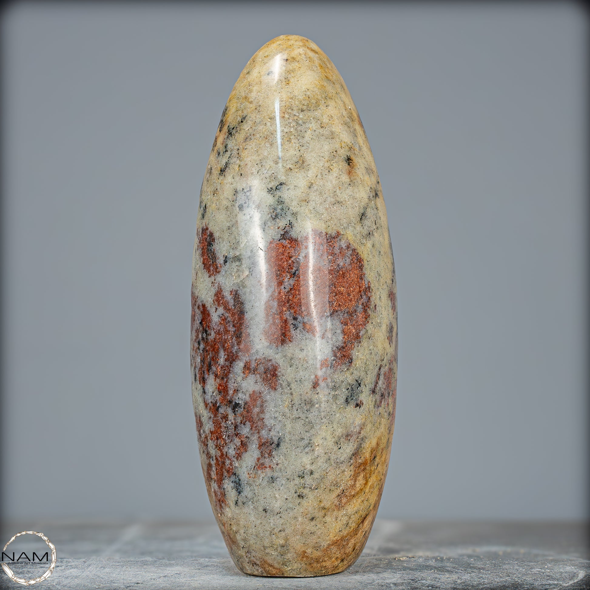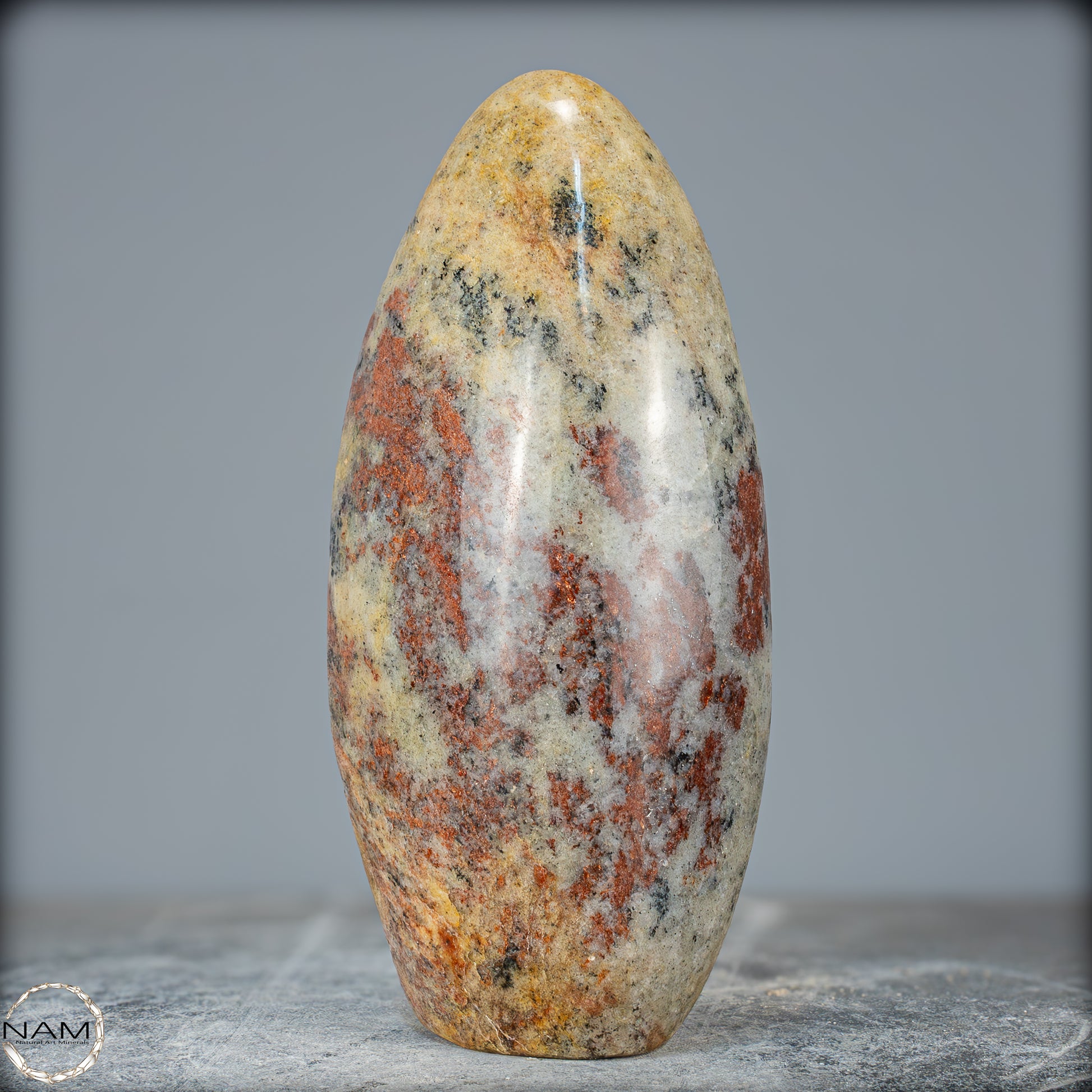 Diese Freiform aus rotem Aventurin begeistert durch ihre kraftvolle Maserung und ihre leuchtend rostroten Einschlüsse, die sich lebendig über den gräulich-beigen Grundton verteilen. Die Oberfläche zeigt eine faszinierende Kombination aus kristallinen, fast glitzernden Partien und fein gemusterten Farbverläufen, die dem Stein eine natürliche Tiefe und Dynamik verleihen.