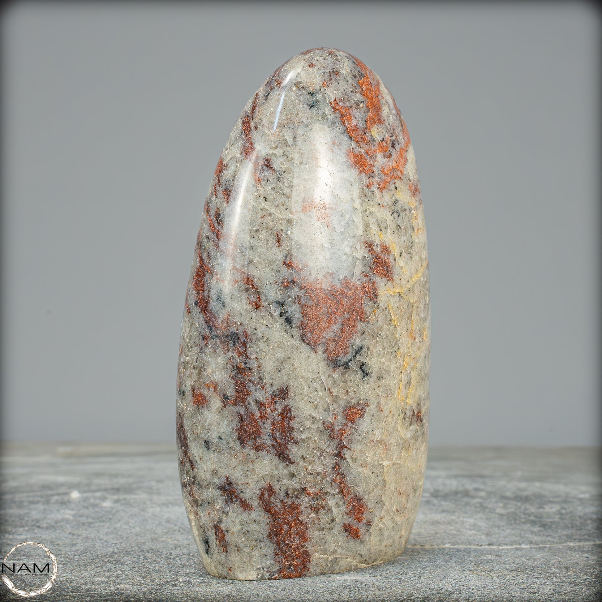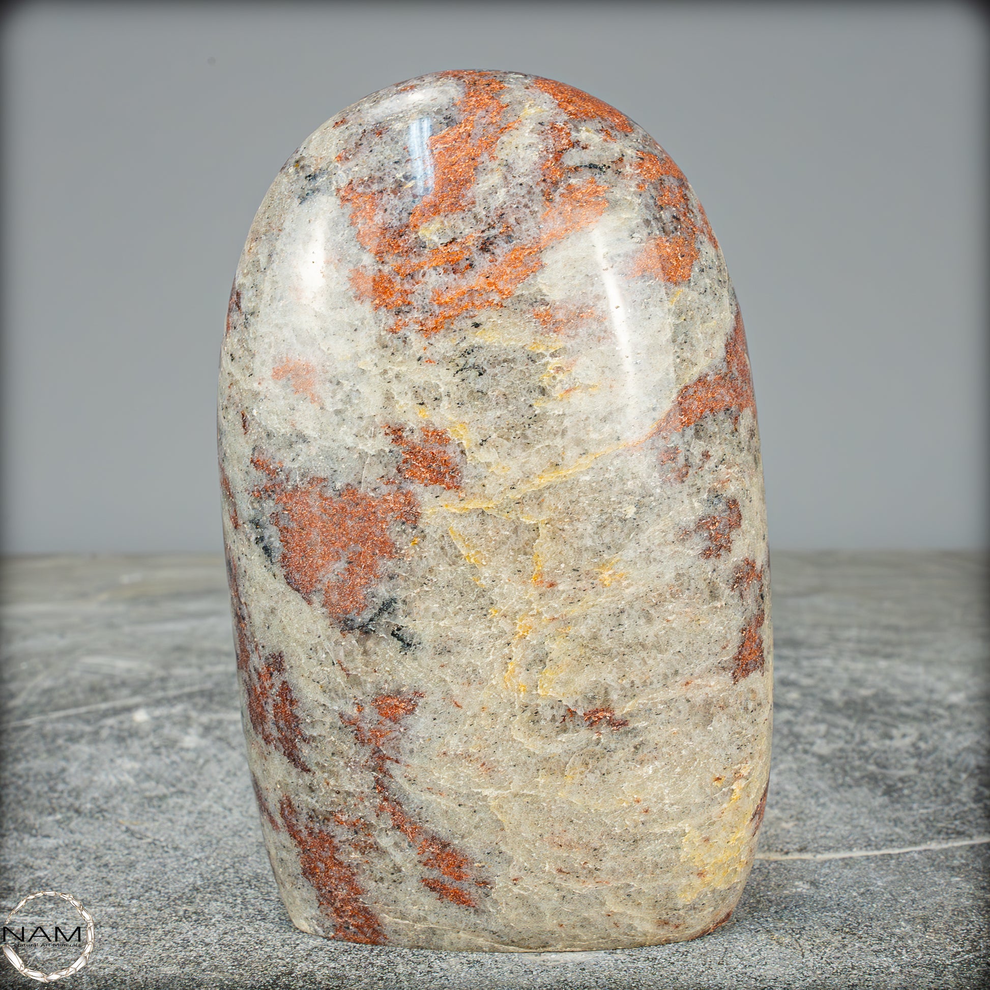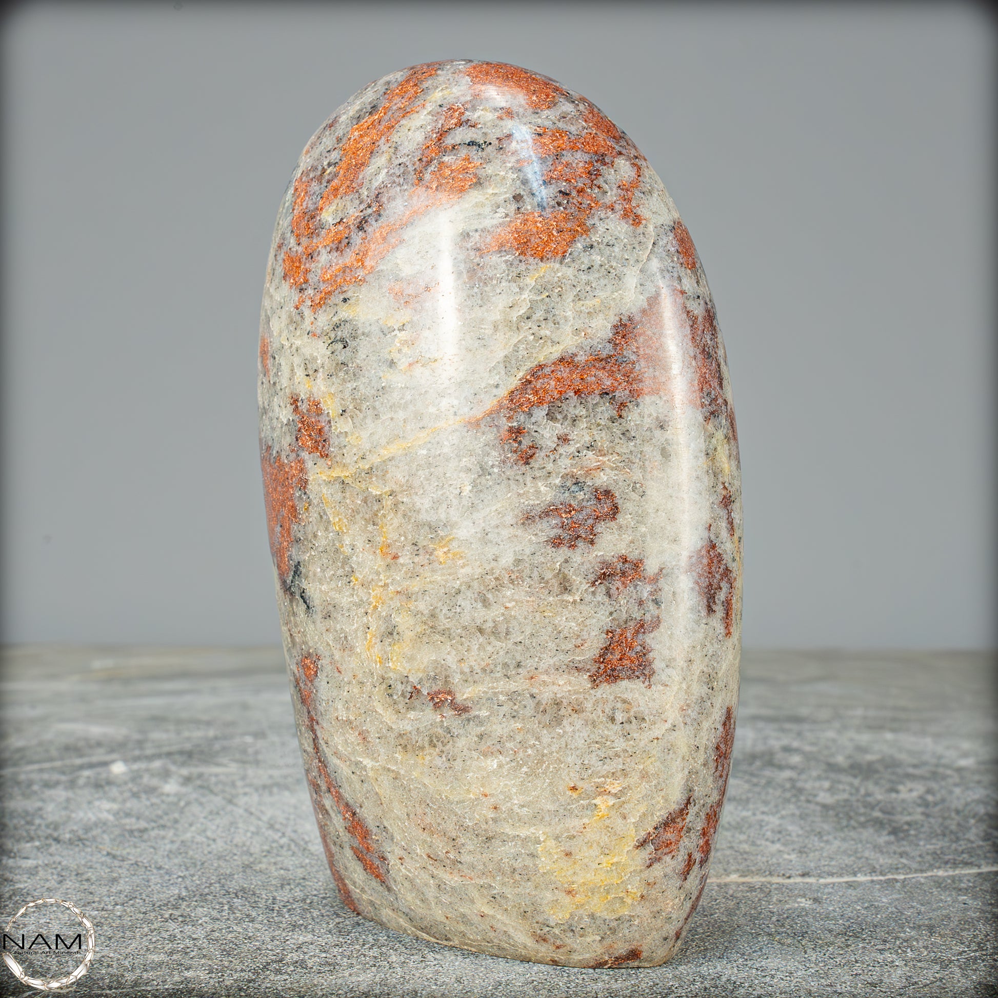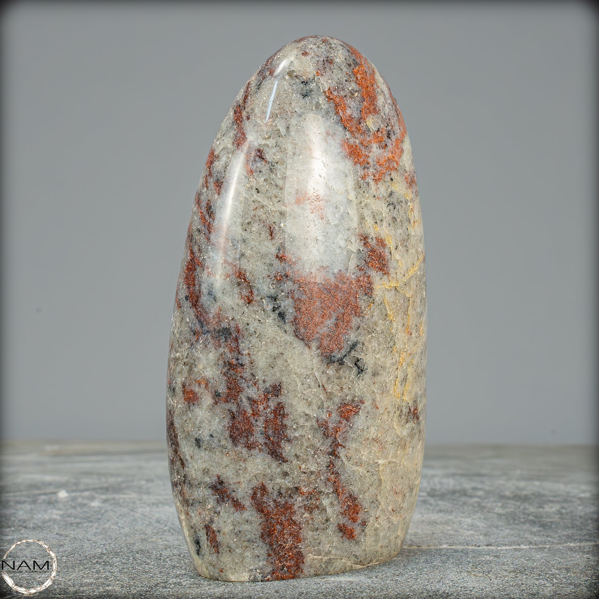 Diese Freiform aus rotem Aventurin begeistert durch ihre kraftvolle Maserung und ihre leuchtend rostroten Einschlüsse, die sich lebendig über den gräulich-beigen Grundton verteilen. Die Oberfläche zeigt eine faszinierende Kombination aus kristallinen, fast glitzernden Partien und fein gemusterten Farbverläufen, die dem Stein eine natürliche Tiefe und Dynamik verleihen.