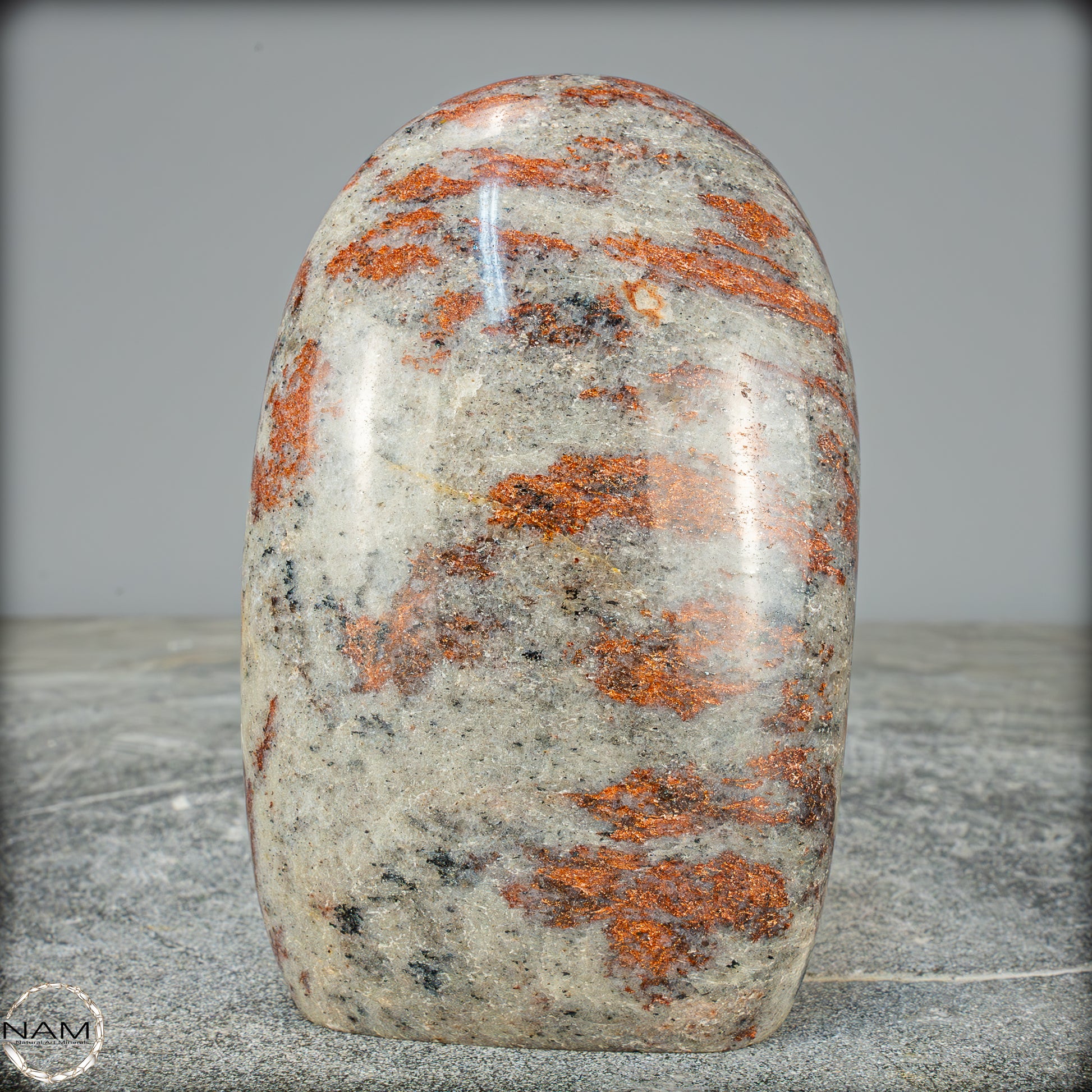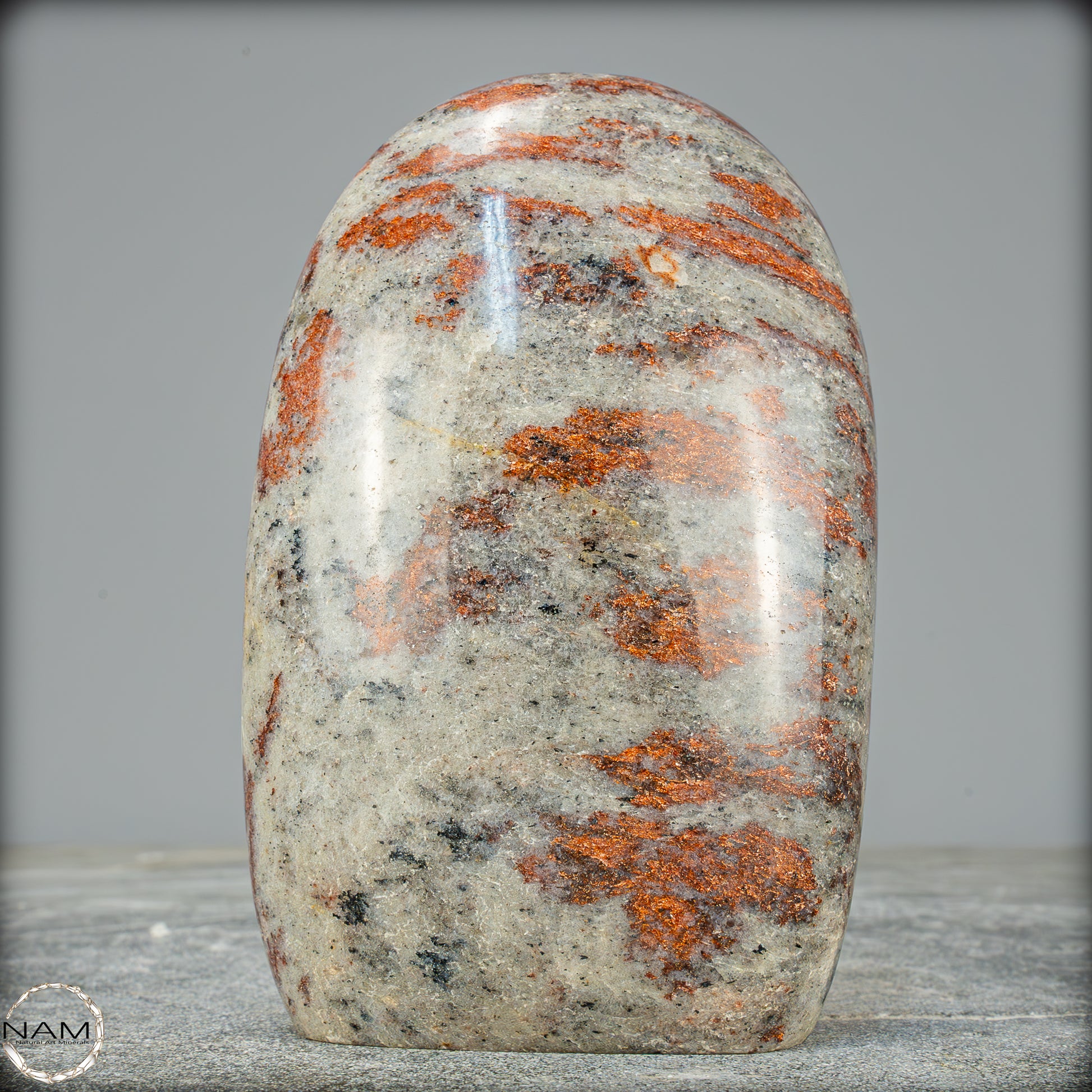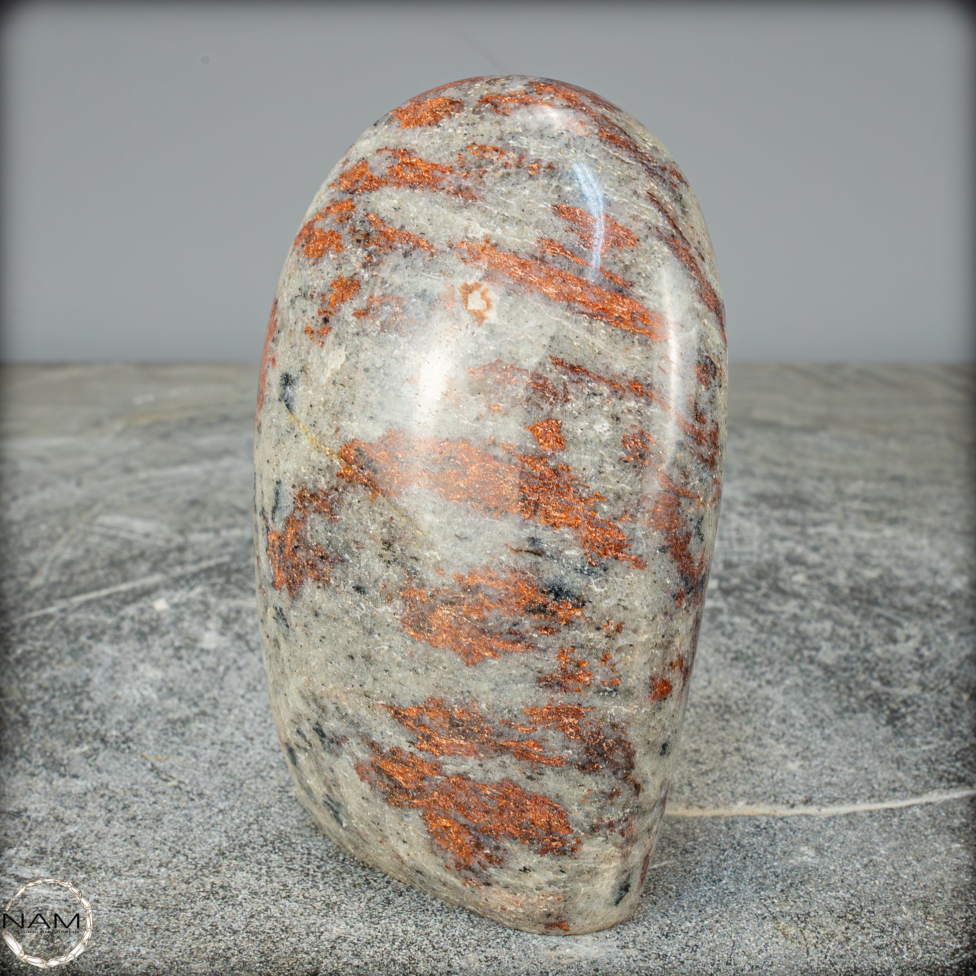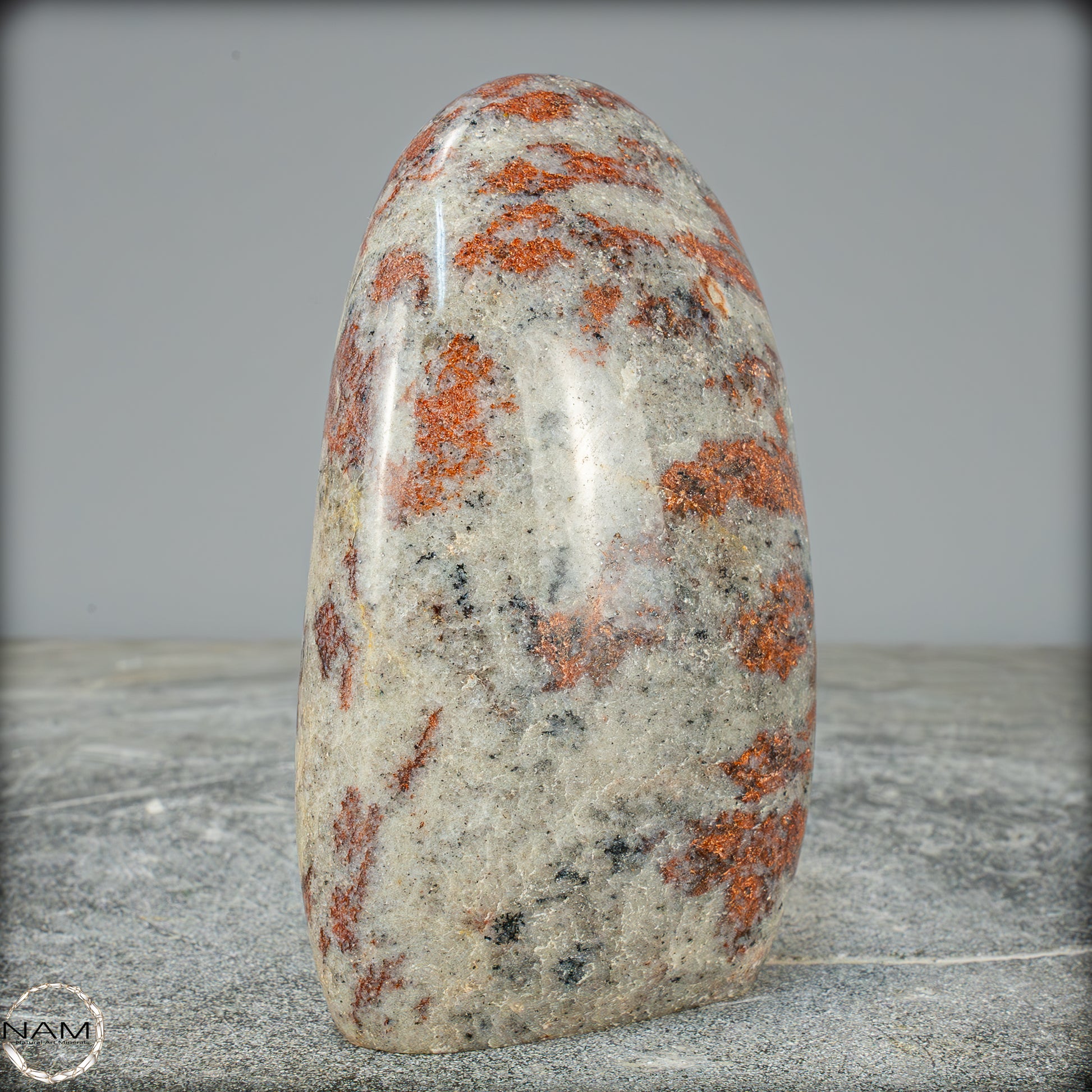 Diese Freiform aus rotem Aventurin begeistert durch ihre kraftvolle Maserung und ihre leuchtend rostroten Einschlüsse, die sich lebendig über den gräulich-beigen Grundton verteilen. Die Oberfläche zeigt eine faszinierende Kombination aus kristallinen, fast glitzernden Partien und fein gemusterten Farbverläufen, die dem Stein eine natürliche Tiefe und Dynamik verleihen.
