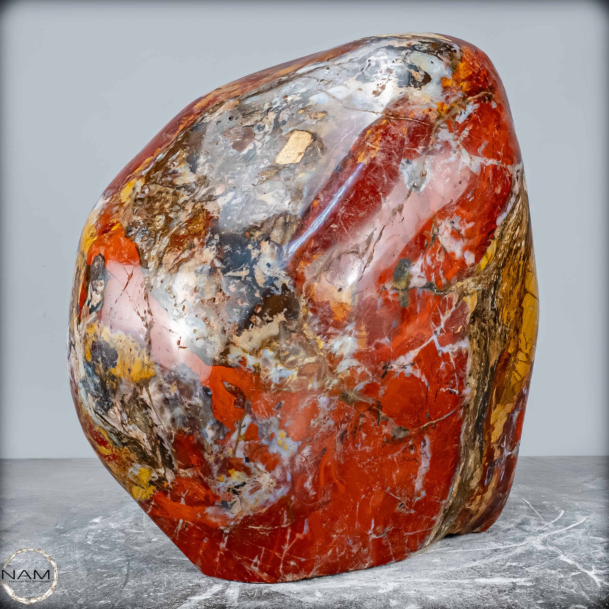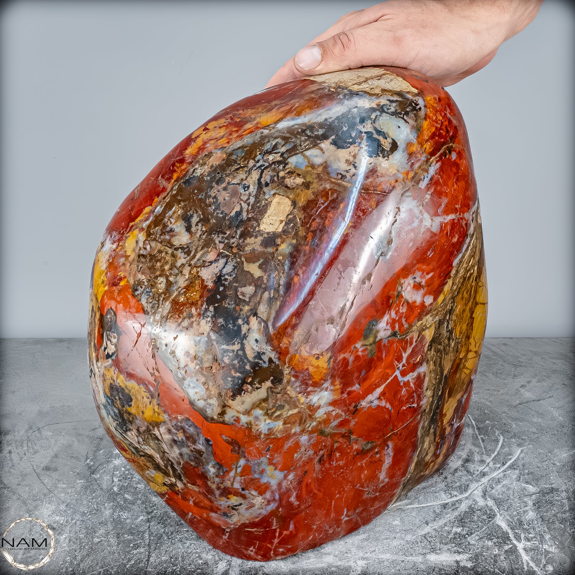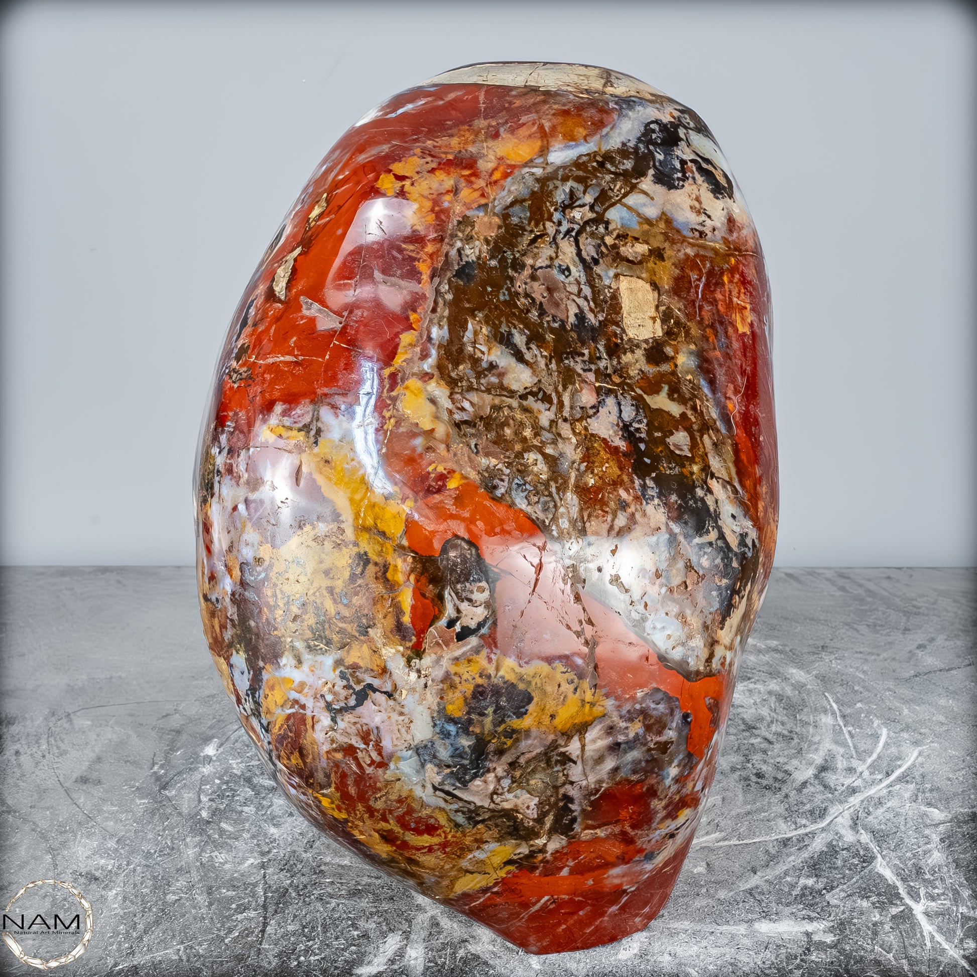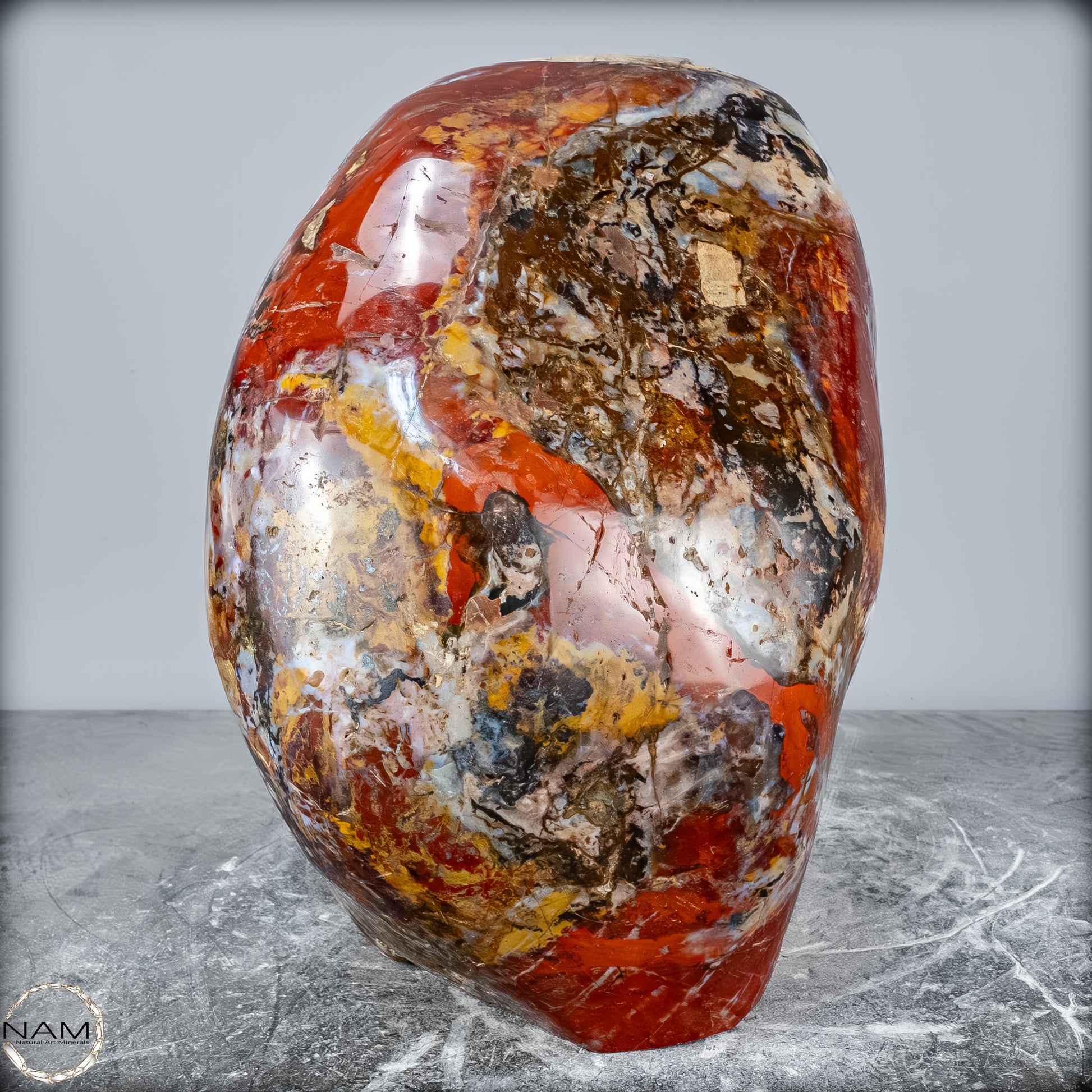Die polierte Oberfläche bringt das vielschichtige Farbspiel besonders zur Geltung: kräftige Kontraste wechseln sich mit zarten Übergängen ab, wodurch die Freiform aus jedem Blickwinkel neue Details offenbart. Mit ihrem imposanten Gewicht von 28 kg entfaltet sie eine monumentale Präsenz und eignet sich hervorragend als zentrales Dekorationsobjekt.