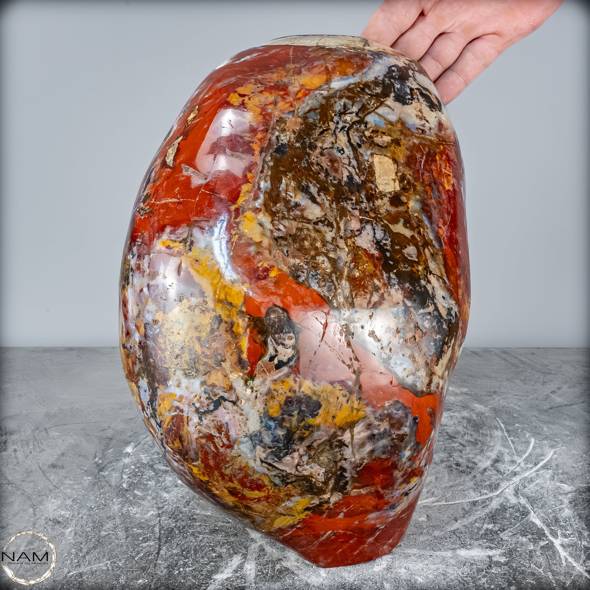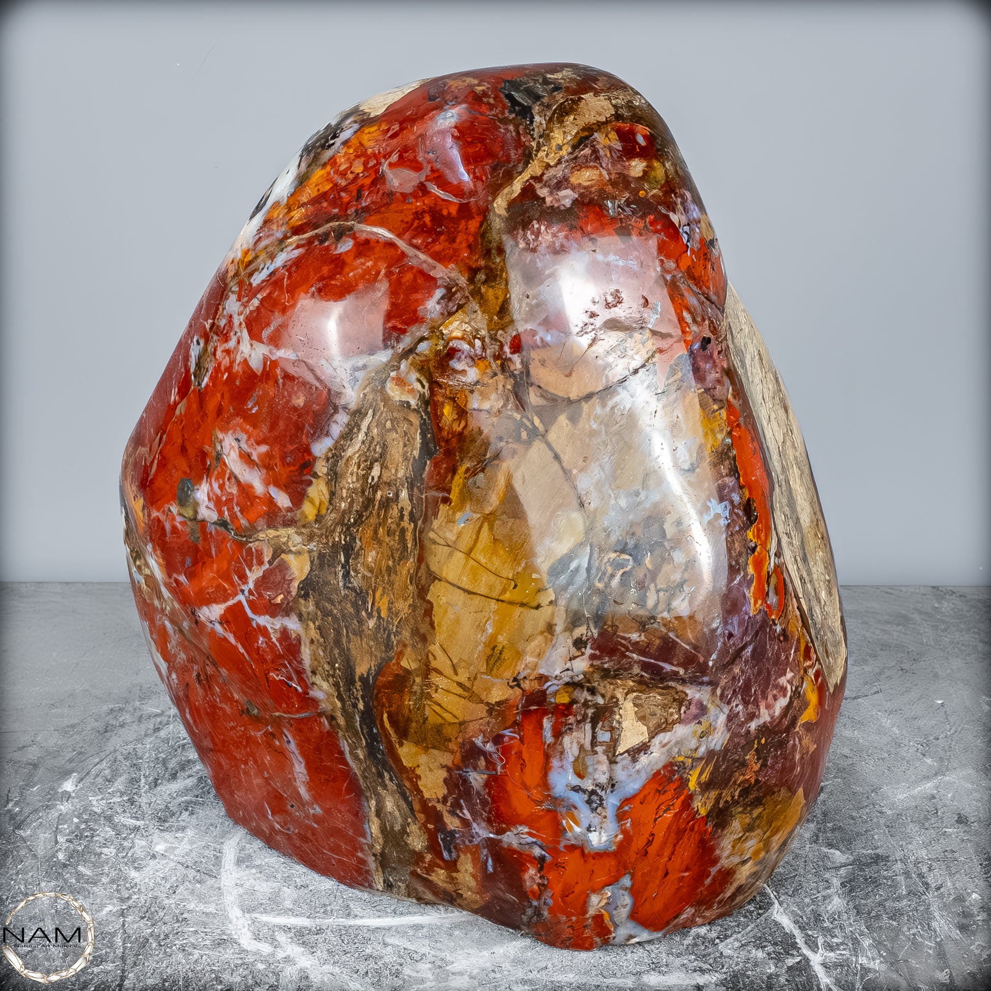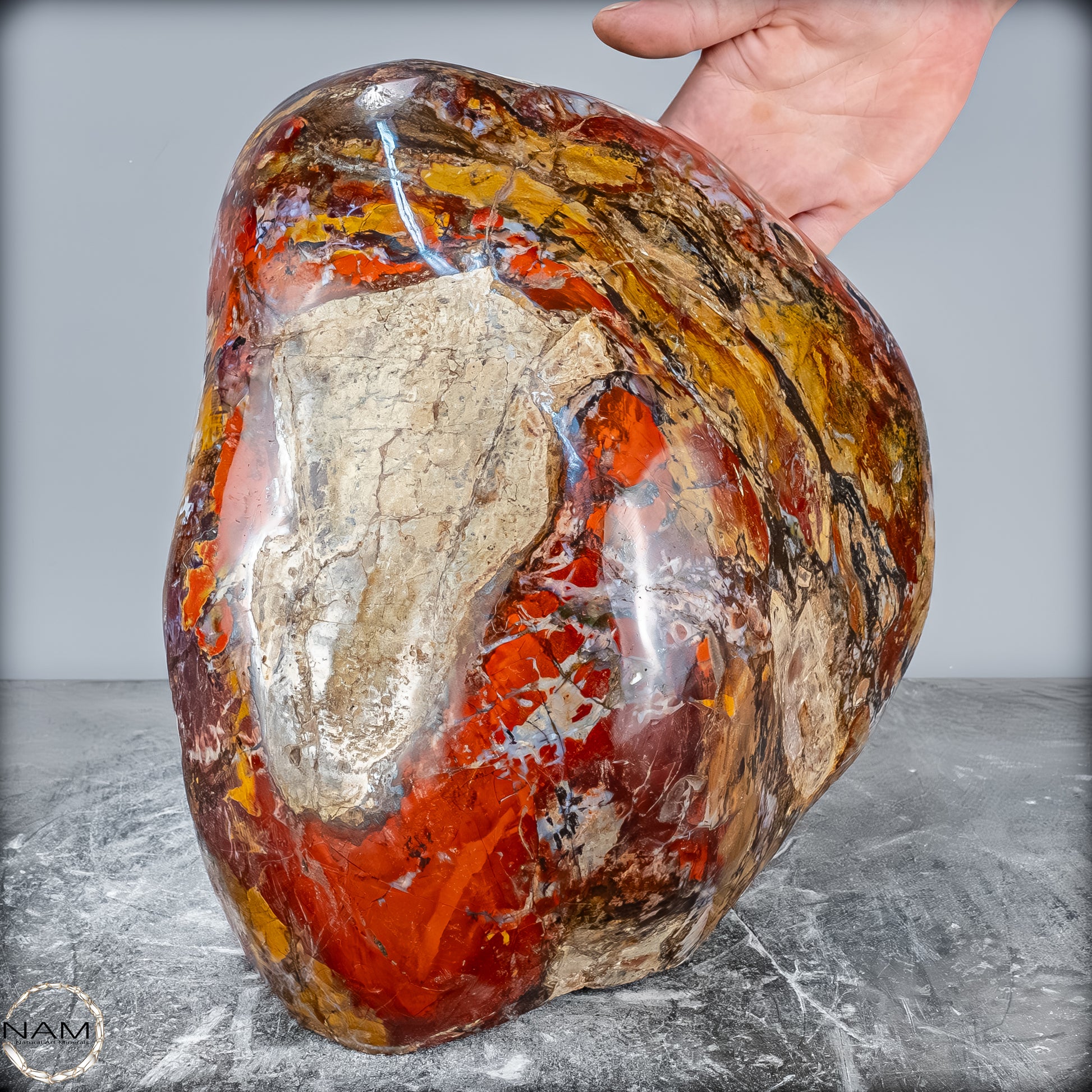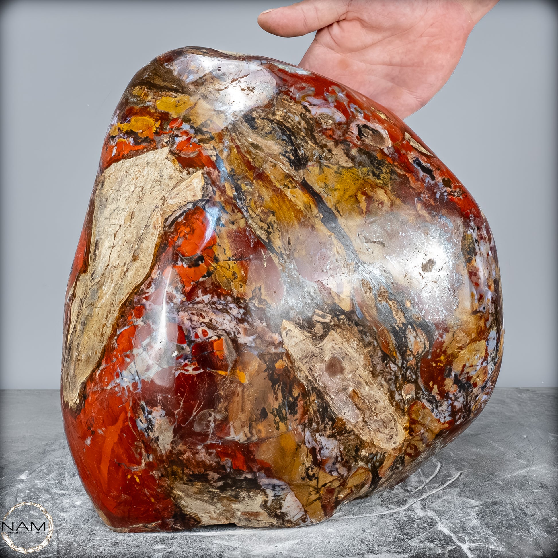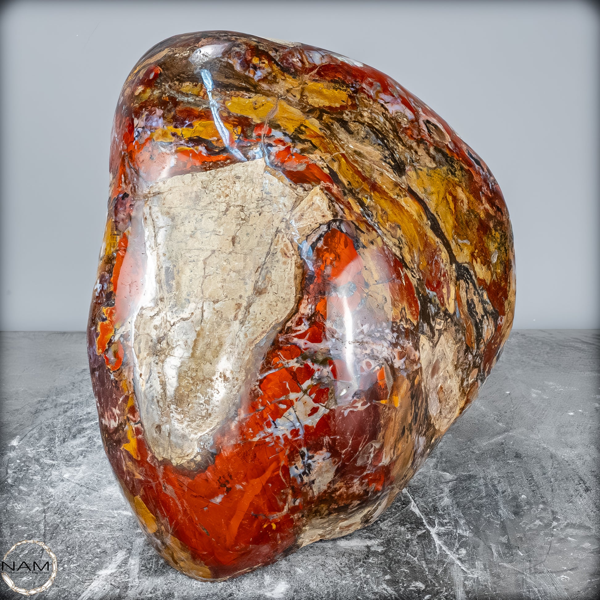 Die polierte Oberfläche bringt das vielschichtige Farbspiel besonders zur Geltung: kräftige Kontraste wechseln sich mit zarten Übergängen ab, wodurch die Freiform aus jedem Blickwinkel neue Details offenbart. Mit ihrem imposanten Gewicht von 28 kg entfaltet sie eine monumentale Präsenz und eignet sich hervorragend als zentrales Dekorationsobjekt.
