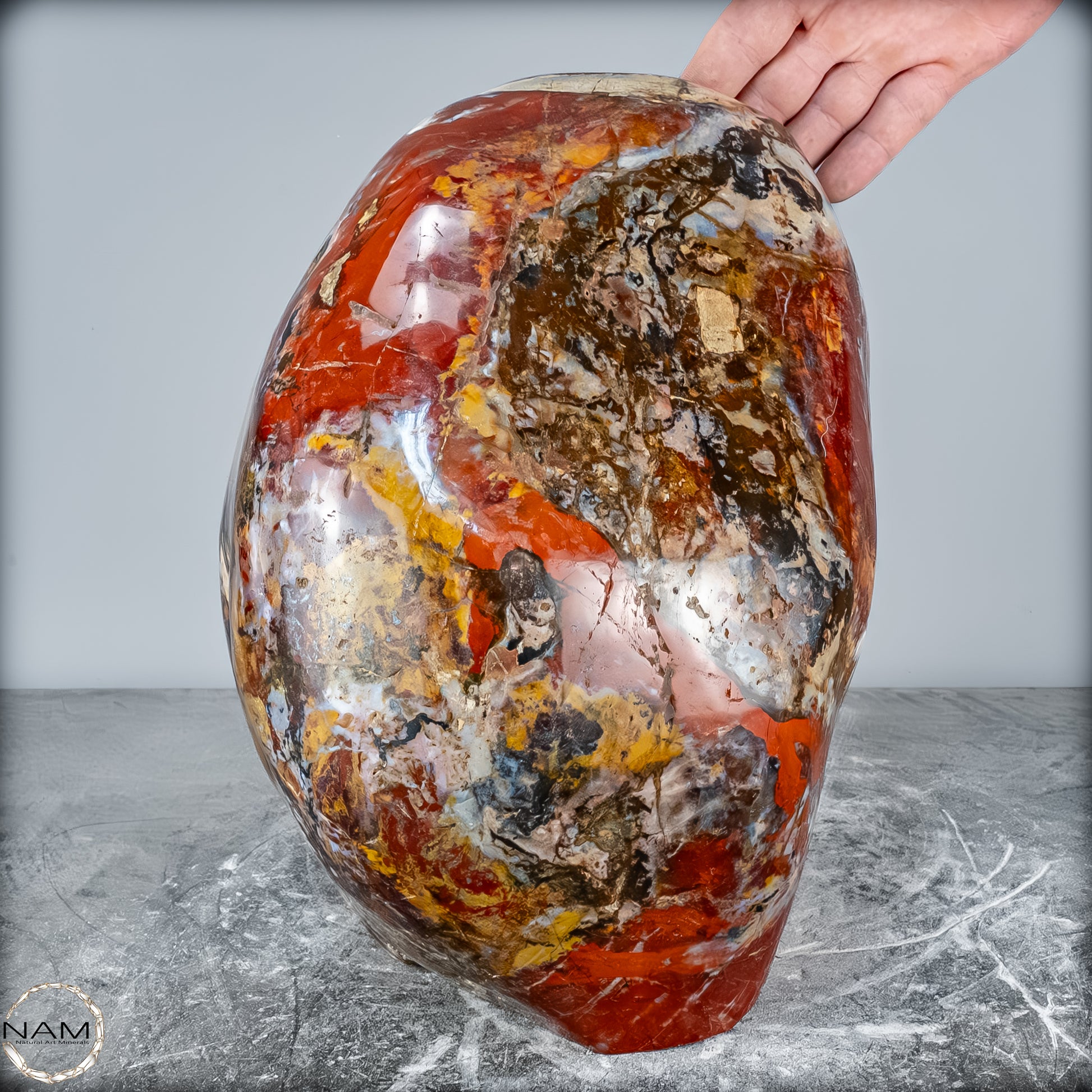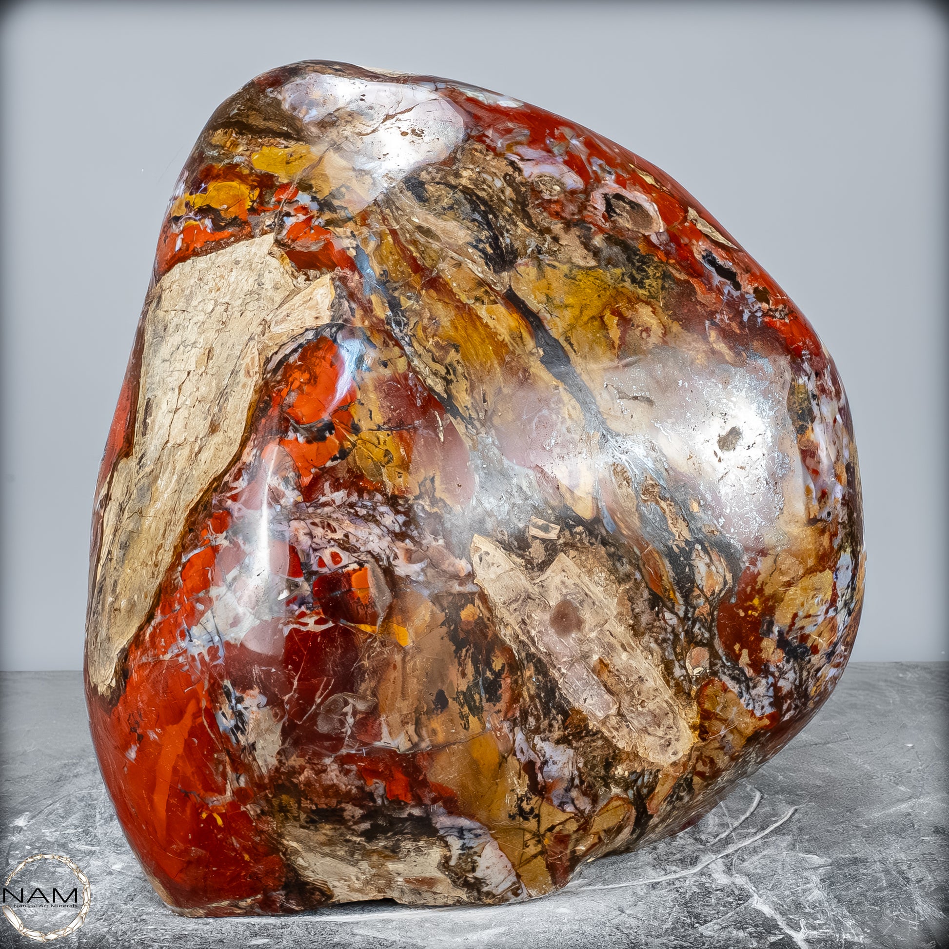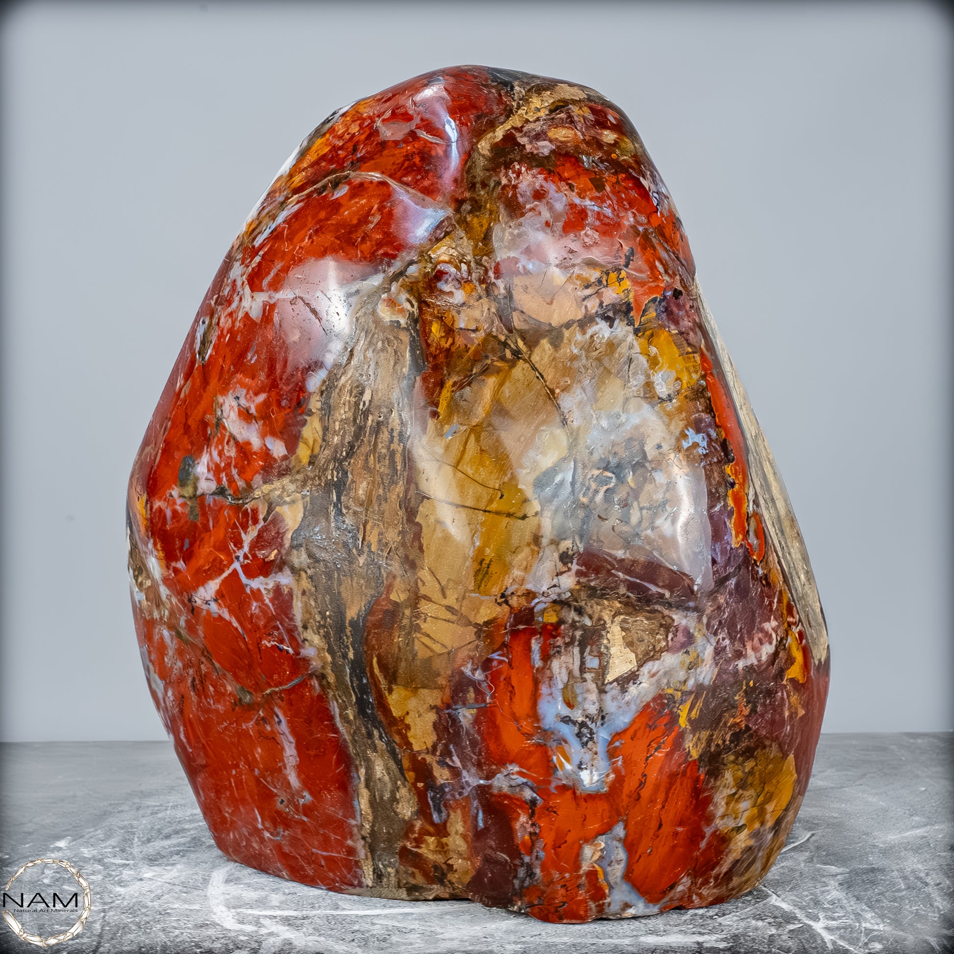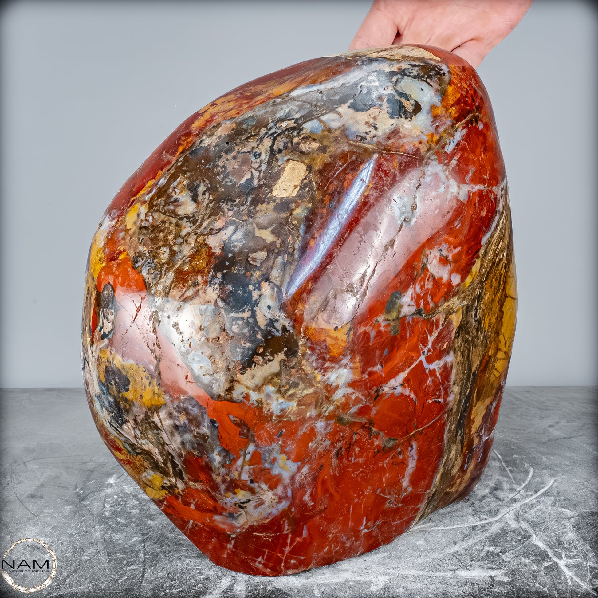 Die polierte Oberfläche bringt das vielschichtige Farbspiel besonders zur Geltung: kräftige Kontraste wechseln sich mit zarten Übergängen ab, wodurch die Freiform aus jedem Blickwinkel neue Details offenbart. Mit ihrem imposanten Gewicht von 28 kg entfaltet sie eine monumentale Präsenz und eignet sich hervorragend als zentrales Dekorationsobjekt.