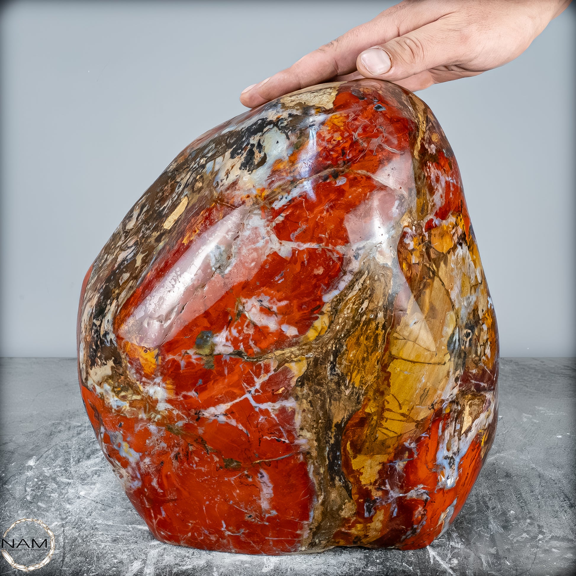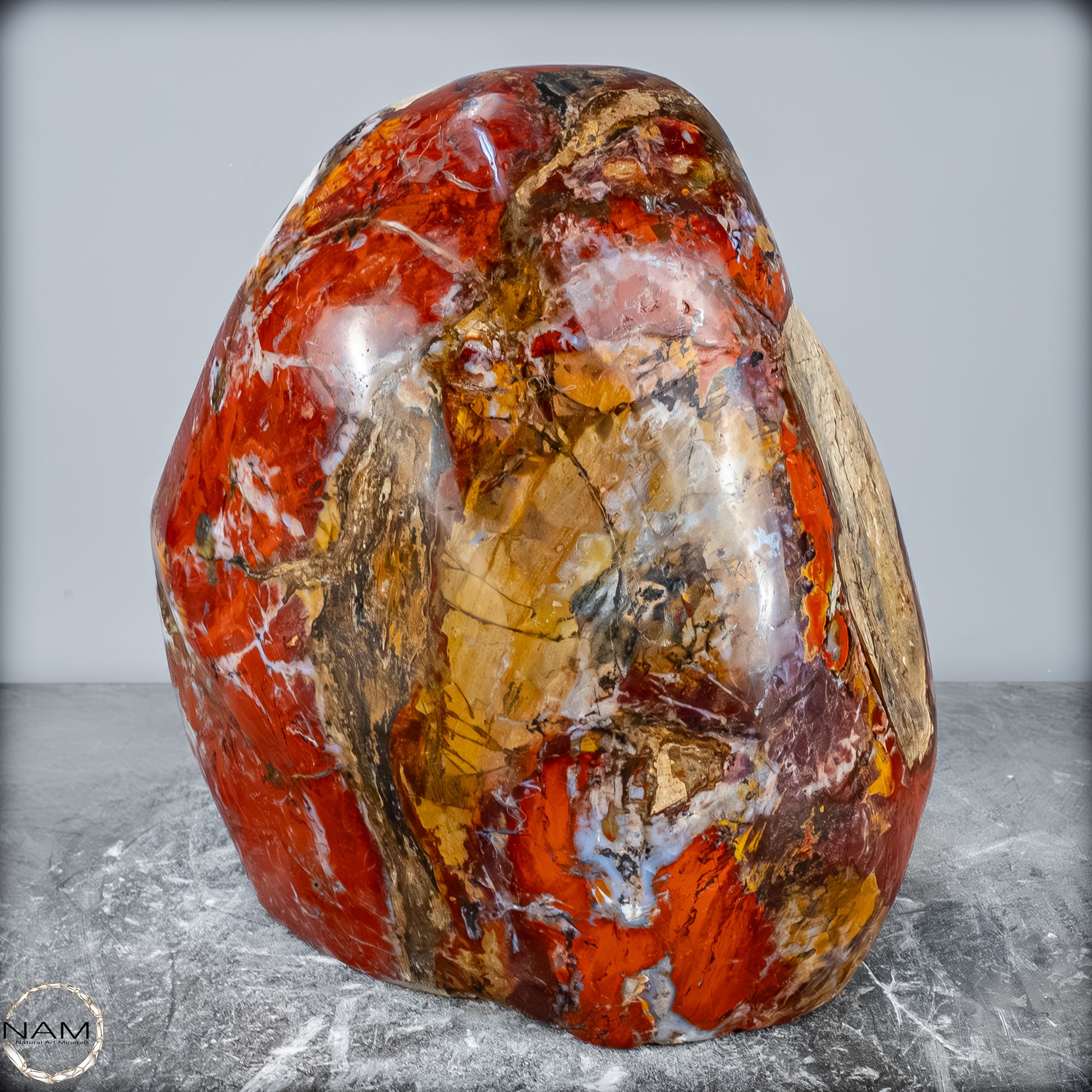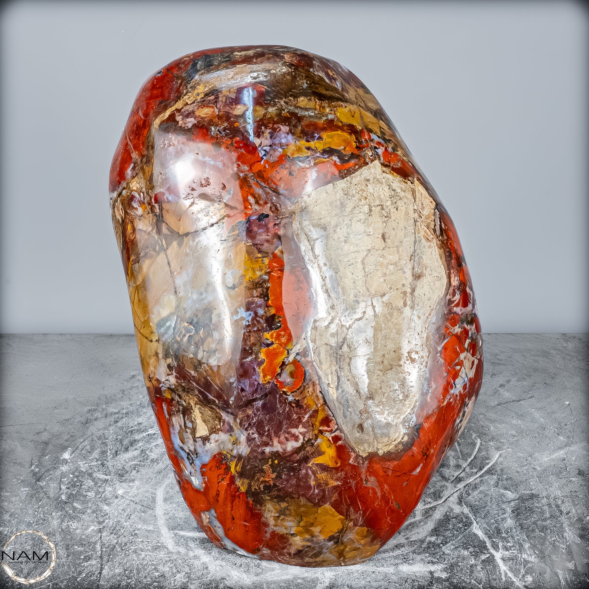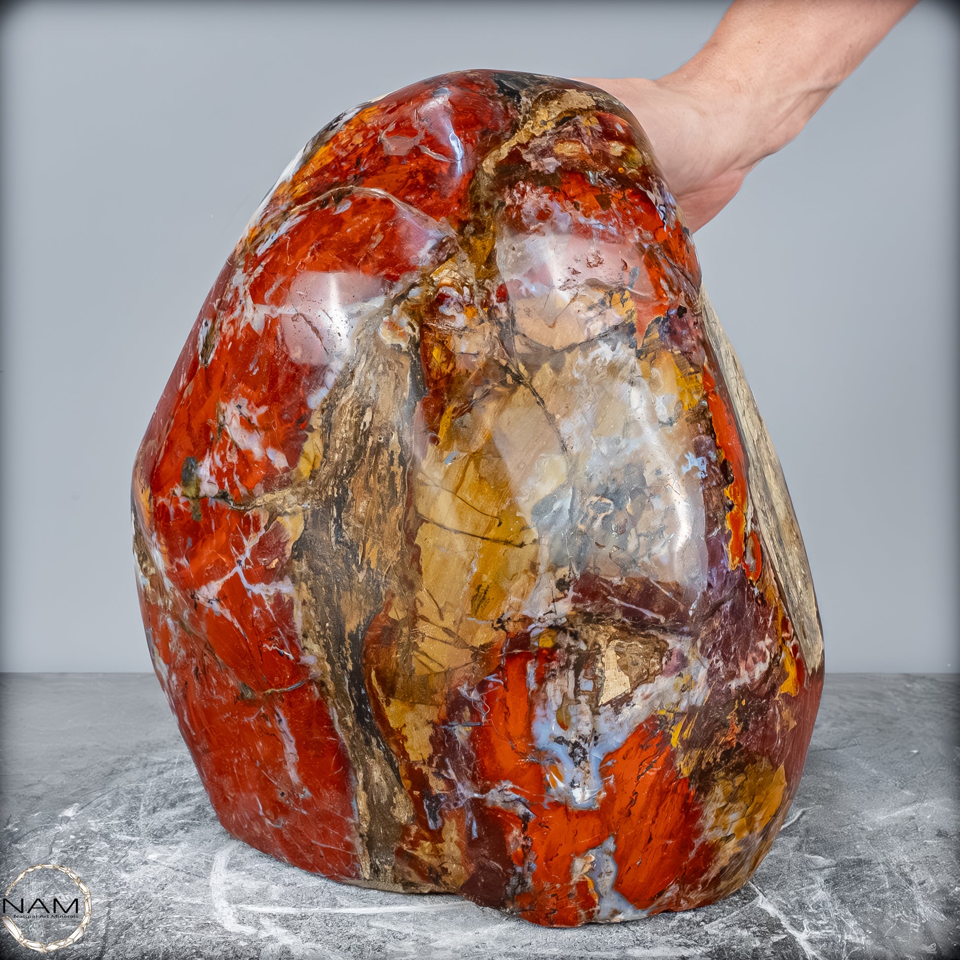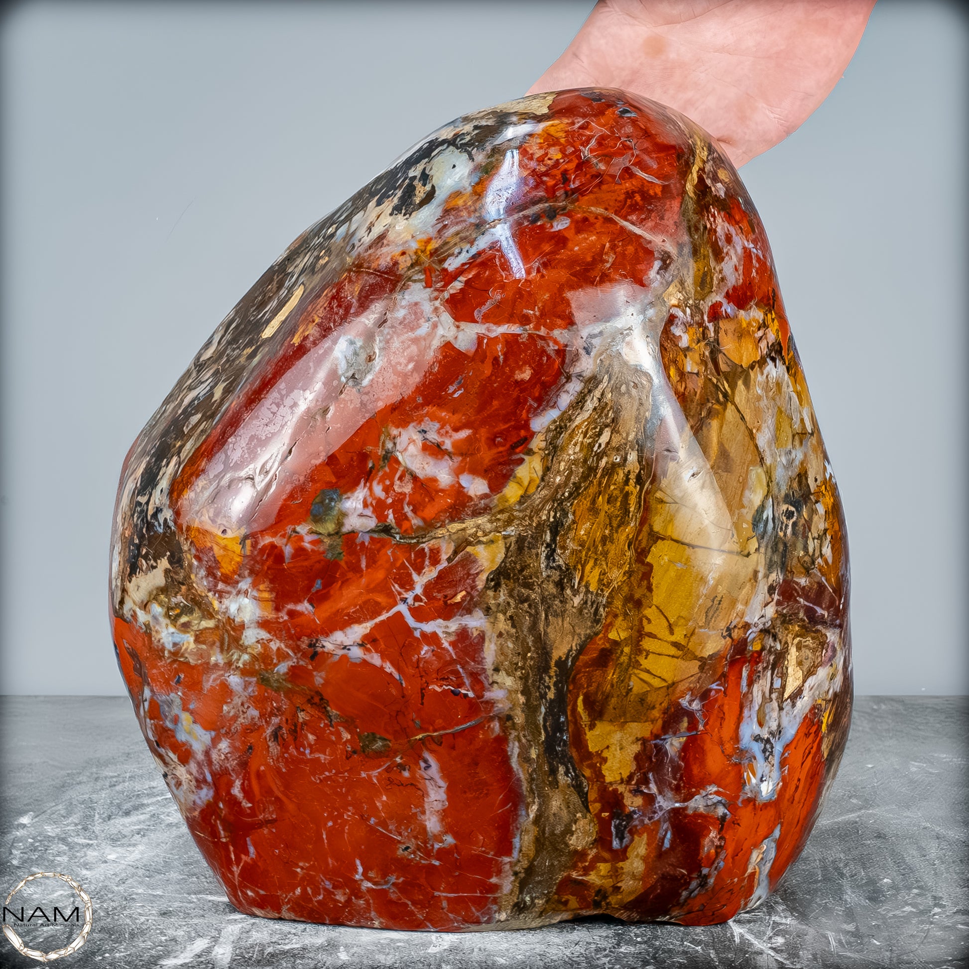 Die polierte Oberfläche bringt das vielschichtige Farbspiel besonders zur Geltung: kräftige Kontraste wechseln sich mit zarten Übergängen ab, wodurch die Freiform aus jedem Blickwinkel neue Details offenbart. Mit ihrem imposanten Gewicht von 28 kg entfaltet sie eine monumentale Präsenz und eignet sich hervorragend als zentrales Dekorationsobjekt.